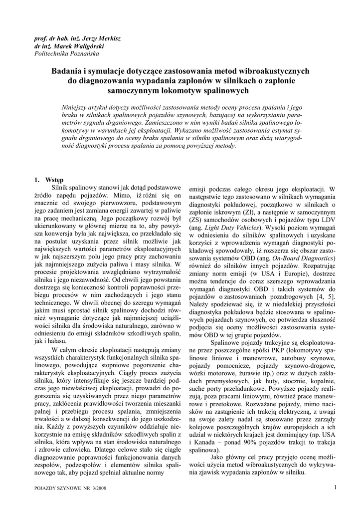 prof. dr hab. inż. Jerzy Merkisz dr inż. Marek Waligórski Politechnika Poznańska Badania i symulacje dotyczące zastosowania metod wibroakustycznych do diagnozowania wypadania zapłonów w silnikach o zapłonie samoczynnym lokomotyw spalinowych Niniejszy artykuł dotyczy możliwości zastosowania metody oceny procesu spalania i jego braku w silnikach spalinowych pojazdów szynowych, bazującej na wykorzystaniu parametrów sygnału drganiowego. Zamieszczono w nim wyniki badań silnika spalinowego lokomotywy w warunkach jej eksploatacji. Wykazano możliwość zastosowania estymat sygnału drganiowego do oceny braku spalania w silniku spalinowym oraz dużą wiarygodność diagnostyki procesu spalania za pomocą powyższej metody. 1. Wstęp Silnik spalinowy stanowi jak dotąd podstawowe źródło napędu pojazdów. Mimo, iż różni się on znacznie od swojego pierwowzoru, podstawowym jego zadaniem jest zamiana energii zawartej w paliwie na pracę mechaniczną. Jego początkowy rozwój był ukierunkowany w głównej mierze na to, aby powyższa konwersja była jak największa, co przekładało się na postulat uzyskania przez silnik możliwie jak największych wartości parametrów eksploatacyjnych w jak najszerszym polu jego pracy przy zachowaniu jak najmniejszego zużycia paliwa i masy silnika. W procesie projektowania uwzględniano wytrzymałość silnika i jego niezawodność. Od chwili jego powstania dostrzega się konieczność kontroli poprawności przebiegu procesów w nim zachodzących i jego stanu technicznego. W chwili obecnej do szeregu wymagań jakim musi sprostać silnik spalinowy dochodzi również wymaganie dotyczące jak najmniejszej uciążliwości silnika dla środowiska naturalnego, zarówno w odniesieniu do emisji składników szkodliwych spalin, jak i hałasu. W całym okresie eksploatacji następują zmiany wszystkich charakterystyk funkcjonalnych silnika spalinowego, powodujące stopniowe pogorszenie charakterystyk eksploatacyjnych. Ciągły proces zużycia silnika, który intensyfikuje się jeszcze bardziej podczas jego niewłaściwej eksploatacji, prowadzi do pogorszenia się uzyskiwanych przez niego parametrów pracy, zakłócenia prawidłowości tworzenia mieszanki palnej i przebiegu procesu spalania, zmniejszenia trwałości a w dalszej konsekwencji do jego uszkodzenia. Każdy z powyższych czynników oddziałuje niekorzystnie na emisję składników szkodliwych spalin z silnika, która wpływa na stan środowiska naturalnego i zdrowie człowieka. Dlatego celowe stało się ciągłe diagnozowanie poprawności funkcjonowania danych zespołów, podzespołów i elementów silnika spalinowego tak, aby pojazd spełniał aktualne normy POJAZDY SZYNOWE NR 3/2008 emisji podczas całego okresu jego eksploatacji. W następstwie tego zastosowano w silnikach wymagania diagnostyki pokładowej, początkowo w silnikach o zapłonie iskrowym (ZI), a następnie w samoczynnym (ZS) samochodów osobowych i pojazdów typu LDV (ang. Light Duty Vehicles). Wysoki poziom wymagań w odniesieniu do silników spalinowych i uzyskane korzyści z wprowadzenia wymagań diagnostyki pokładowej spowodowały, iż rozszerza się obszar zastosowania systemów OBD (ang. On-Board Diagnostics) również do silników innych pojazdów. Rozpatrując zmiany norm emisji (w USA i Europie), dostrzec można tendencje do coraz szerszego wprowadzania wymagań diagnostyki OBD i takich systemów do pojazdów o zastosowaniach pozadrogowych [4, 5]. Należy spodziewać się, iż w niedalekiej przyszłości diagnostyka pokładowa będzie stosowana w spalinowych pojazdach szynowych, co potwierdza słuszność podjęcia się oceny możliwości zastosowania systemów OBD w tej grupie pojazdów. Spalinowe pojazdy trakcyjne są eksploatowane przez poszczególne spółki PKP (lokomotywy spalinowe liniowe i manewrowe, autobusy szynowe, pojazdy pomocnicze, pojazdy szynowo-drogowe, wózki motorowe, żurawie itp.) oraz w dużych zakładach przemysłowych, jak huty, stocznie, kopalnie, suche porty przeładunkowe. Powyższe pojazdy realizują, poza pracami liniowymi, również prace manewrowe i przetokowe. Rozważane pojazdy, mimo nacisków na zastąpienie ich trakcją elektryczną, z uwagi na swoje zalety nadal są stosowane przez zarządy kolejowe poszczególnych krajów europejskich a ich udział w niektórych krajach jest dominujący (np. USA i Kanada – ponad 90% pojazdów trakcji to trakcja spalinowa). Jako główny cel pracy przyjęto ocenę możliwości użycia metod wibroakustycznych do wykrywania zjawisk wypadania zapłonów w silniku. 1 sygnału drgań związanego z rozpatrywanym procesem. W ramach badań rejestrowano sygnały drgań w trzech wzajemnie prostopadłych kierunkach: równoległym do osi wzdłużnej wału korbowego (kierunek X), prostopadłym do osi wzdłużnej wału korbowego i cylindra (kierunek Y), równoległym do osi wzdłużnej cylindra i jednocześnie prostopadłym do kierunków X i Y (kierunek Z). Sygnały pomiarowe uzyskane z przetworników kierowano do wzmacniaczy, w których były poddawane wzmocnieniu i normalizowaniu. Sygnały powyższe były następnie kierowane na wejścia analogowe karty do dynamicznej akwizycji danych. Wewnątrz niej były poddane procesowi filtracji za pomocą filtrów analogowych i cyfrowych, po czym przekształcono je z postaci analogowej w cyfrową. Uzyskane sygnały po wyjściu z karty pomiarowej zapisywano w pamięci komputera. a) 6 Pcyl [MPa] Uwzględniono weryfikację nowej metody w zakresie jej zastosowania w procedurach diagnostycznych realizowanych w systemach OBD, które wykorzystywałyby parametry sygnału drganiowego do diagnostycznej oceny stanu technicznego silnika i poprawności przebiegu procesów w nim zachodzących. Uzyskana przez autorów pracy i opisana szerzej w [6] metodyka diagnozowania wypadania zapłonów oparta na powyższej metodzie (badania podstawowe zrealizowane na hamowni silnikowej na jednocylindrowym badawczym silniku ZS o bezpośrednim