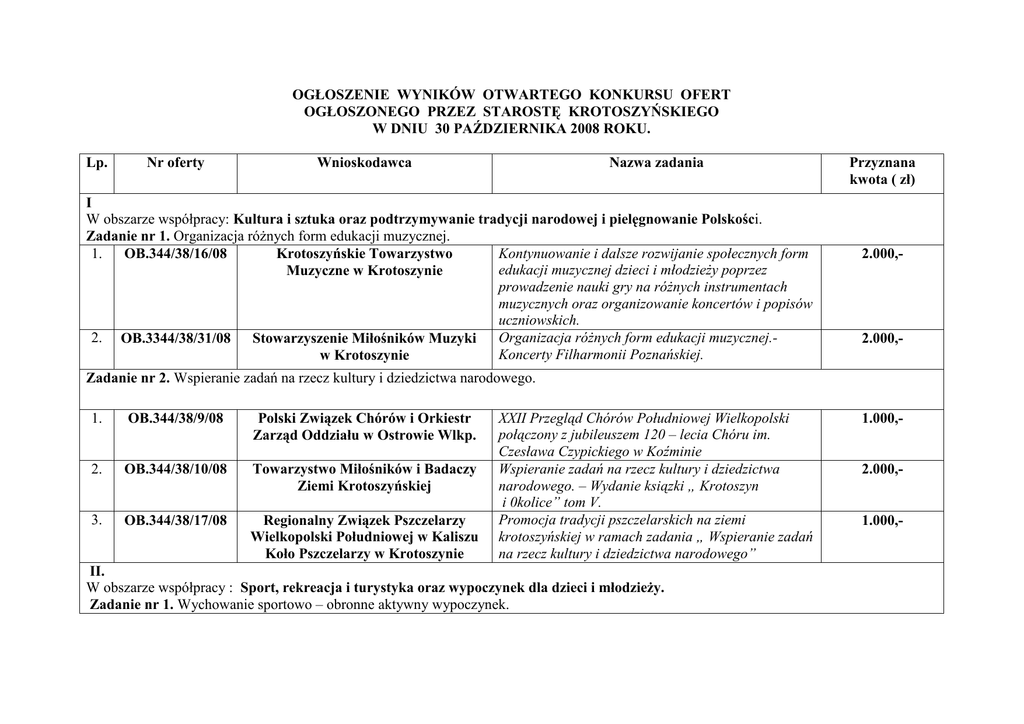 OGŁOSZENIE WYNIKÓW OTWARTEGO KONKURSU OFERT OGŁOSZONEGO PRZEZ STAROSTĘ KROTOSZYŃSKIEGO W DNIU 30 PAŹDZIERNIKA 2008 ROKU. Lp. Nr oferty Wnioskodawca Nazwa zadania I W obszarze współpracy: Kultura i sztuka oraz podtrzymywanie tradycji narodowej i pielęgnowanie Polskości. Zadanie nr 1. Organizacja róŜnych form edukacji muzycznej. 1. Kontynuowanie i dalsze rozwijanie społecznych form OB.344/38/16/08 Krotoszyńskie Towarzystwo edukacji muzycznej dzieci i młodzieŜy poprzez Muzyczne w Krotoszynie prowadzenie nauki gry na róŜnych instrumentach muzycznych oraz organizowanie koncertów i popisów uczniowskich. 2. OB.3344/38/31/08 Stowarzyszenie Miłośników Muzyki Organizacja róŜnych form edukacji muzycznej.Koncerty Filharmonii Poznańskiej. w Krotoszynie Przyznana kwota ( zł) 2.000,- 2.000,- Zadanie nr 2. Wspieranie zadań na rzecz kultury i dziedzictwa narodowego. 1. OB.344/38/9/08 Polski Związek Chórów i Orkiestr Zarząd Oddziału w Ostrowie Wlkp. 2. OB.344/38/10/08 Towarzystwo Miłośników i Badaczy Ziemi Krotoszyńskiej 3. OB.344/38/17/08 Regionalny Związek Pszczelarzy Wielkopolski Południowej w Kaliszu Koło Pszczelarzy w Krotoszynie XXII Przegląd Chórów Południowej Wielkopolski połączony z jubileuszem 120 – lecia Chóru im. Czesława Czypickiego w Koźminie Wspieranie zadań na rzecz kultury i dziedzictwa narodowego. – Wydanie ksiązki „ Krotoszyn i 0kolice” tom V. Promocja tradycji pszczelarskich na ziemi krotoszyńskiej w ramach zadania „ Wspieranie zadań na rzecz kultury i dziedzictwa narodowego” II. W obszarze współpracy : Sport, rekreacja i turystyka oraz wypoczynek dla dzieci i młodzieŜy. Zadanie nr 1. Wychowanie sportowo – obronne aktywny wypoczynek. 1.000,- 2.000,- 1.000,- 1. OB.344/38/29/08 Liga Obrony Kraju Zarząd Powiatowy Krotoszyn Wychowanie sportowo – obronne aktywny wypoczynek 1.000,- Krzewienie sportu w środowisku wiejskim. 7.000,- Zadanie nr 2. Krzewienie sportu w środowisku wiejskim. 1. OB.344/38/30/08 Powiatowe Zrzeszenie Ludowych Zespołów Sportowych Krotoszyn Zadanie nr 3. Wsparcie zadań z zakresu sportu szkolnego na rzecz dzieci i młodzieŜy z terenu powiatu krotoszyńskiego 1. OB.344/38/15/08 Krotoszyński Szkolny Związek Sportowy w Krotoszynie Wsparcie zadań z zakresu sportu szkolnego na rzecz dzieci i młodzieŜy z terenu powiatu krotoszyńskiego 26.000,- Zadanie nr 4. Promocja powiatu poprzez sport oraz wydawnictwa. 1. OB.344/38/4/08 Klub Sportowy KROTOSZ Krotoszyn Promocja powiatu poprzez sport oraz wydawnictwa. 1.000,- 2. OB.344/38/14/08 Kurkowe Bractwo Strzeleckie w Krotoszynie Promocja powiatu poprzez sport oraz wydawnictwa. 2.000,- 3 OB.344/38/19/08 Ludowy Klub Sportowy CERAMIK KROTOSZYN Promocja powiatu poprzez sport- Organizacja Mistrzostw Polski Juniorów w zapasach styl wolny. 3.000,- 4. OB.344/38/21/08 Promocja powiatu poprzez sport- Organizacja MłodzieŜowych Mistrzostw Polski w zapasach styl wolny. 5. Promocja powiatu poprzez sport oraz wydawnictwaOB.344/38/37/08 Integracyjny Klub Sportowy Organizacja Turnieju Integracyjnego w tenisie „ SPARTAKUS” Koźmin Wlkp. ziemnym na wózkach. Zadanie nr 5. Rozwijanie turystyki kwalifikowanej, jej edukacyjnych walorów oraz promowanie aktywnej formy czasu wolnego. 1. OB.344/38/6/08 Ludowy Klub Sportowy CERAMIK KROTOSZYN PTTK Zarząd Oddziału Krotoszyn Rozwijanie turystyki kwalifikowanej, jej edukacyjnych walorów oraz promowanie aktywnej formy czasu 2.500,- 1.500,- 3.500,- wolnego. Zadanie nr 6. Rajd rowerowy i pieszy z okazji obchodów 91 rocznicy Powstania Wlkp. dla młodzieŜy z terenu powiatu. II- Rajd rowerowy i pieszy młodzieŜy szkolnej dla upamiętnienia 91 Rocznicy Powstania Wielkopolskiego. Zadanie nr 7. Wsparcie aktywnych form wypoczynku dzieci i młodzieŜy z terenu powiatu. 1. OB.344/38/7/08 PTTK Zarząd Oddziału Krotoszyn 1. OB.344/38/12/08 ZHP Chorągiew Wielkopolska Hufiec Krotoszyn 2. OB.344/38/32/08 Stowarzyszenie „ Twoja Alternatywa” Krotoszyn 3.000,- Harcerska Akcja Letnia 2009 3.000,- Wsparcie aktywnych form wypoczynku dzieci i młodzieŜy z terenu powiatu – Aktywne wakacje. 3.000,- Zadanie nr 8. Wsparcie organizacji imprez sportowych dla dzieci i młodzieŜy. 1. OB.344/38/33/08 Stowarzyszenie „ Twoja Alternatywa” Krotoszyn 2. OB.344/38/38/08 Krotoszyński Klub Sportowy „ASTRA” 3.* OB.344/38/5/08 Klub Sportowy KROTOSZ Krotoszyn Wsparcie organizacji imprez sportowych dla dzieci i młodzieŜy.- Organizacja imprez sportowych w zakresie sztuk walki w Klubie Strefa Walki. Ogólnopolski Halowy Turniej Piłki NoŜnej Juniorów Młodszych i Juniorów Starszych o Puchar Starosty Krotoszyńskiego. Wsparcie zadań z zakresu sportu szkolnego na rzecz dzieci i młodzieŜy z terenu powiatu krotoszyńskiego * oferta OB.344/38/5/08 przeniesiona z obszaru II zadanie nr3. III. W obszarze współpracy : Promocja zdrowia. Zadanie nr 1. Działanie na rzecz profilaktyki chorób nowotworowych piersi. 1.800,- 3.200,- 1.000,- 1. OB.344/38/27/08 Krotoszyński Klub „ AMAZONKI” „ Zycie po leczeniu raka piersi”. 1.000,- Działania zmierzające do ograniczenia szkód związanych z naduŜywaniem substancji psychoaktywnych. 1.500,- Zadanie nr 2. Walka z AIDS i uzaleŜnieniami. 1. OB.344/38/34/08 Stowarzyszenie „ Twoja Alternatywa” Krotoszyn Zadanie nr 3.Olimpiada promująca zdrowy styl Ŝycia. 1. OB.344/38/23/08 Polski Czerwony KrzyŜ Zarząd Rejonowy Krotoszyn Olimpiada promująca zdrowy styl Ŝycia 400,- Zadanie nr 4. Zorganizowanie festiwalu pn. „ Witaminki na start”. 1. OB.344/38/11/08 ZHP Chorągiew Wielkopolska Hufiec Krotoszyn X Jubileuszowy Integracyjny Festiwal Piosenki „ Witaminki Na Start” 2.000,- Propagowanie idei krwiodawstwa i krwiolecznictwa. 3.500,- Zadanie nr 5. Propagowanie idei krwiodawstwa i krwiolecznictwa. 1. OB.344/38/24/08 Polski Czerwony KrzyŜ Zarząd Rejonowy Krotoszyn Zadanie nr 6. Propagowanie badań dla zwiększenia bazy dawców szpiku kostnego- „ Wspomagając dawców szpiku kostnego zwiększ