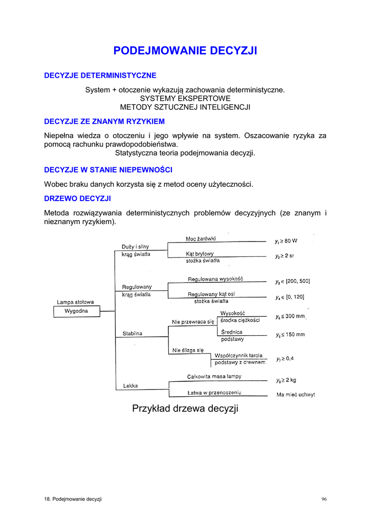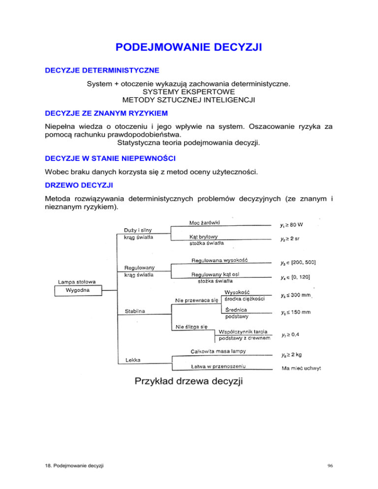 PODEJMOWANIE DECYZJI DECYZJE DETERMINISTYCZNE System + otoczenie wykazują zachowania deterministyczne. SYSTEMY EKSPERTOWE METODY SZTUCZNEJ INTELIGENCJI DECYZJE ZE ZNANYM RYZYKIEM Niepełna wiedza o otoczeniu i jego wpływie na system. Oszacowanie ryzyka za pomocą rachunku prawdopodobieństwa. Statystyczna teoria podejmowania decyzji. DECYZJE W STANIE NIEPEWNOŚCI Wobec braku danych korzysta się z metod oceny użyteczności. DRZEWO DECYZJI Metoda rozwiązywania deterministycznych problemów decyzyjnych (ze znanym i nieznanym ryzykiem). Przykład drzewa decyzji 18. Podejmowanie decyzji 96 PĘTLA OODA Działanie wg schematu Observe – Orient – Decise – Act. WYBÓR SYSTEMU IDEALNEGO System wartości Kryteria jakości (oceny) System idealny jest określony przez zbiór wartości i określeń słownych (system pojęciowy). Prezentuje on WIZJĘ rozwiązania problemu. OPTYMALIZACJA PROCEDURY OPTYMALNEGO PROJEKTOWANIA 18. Podejmowanie decyzji 97
