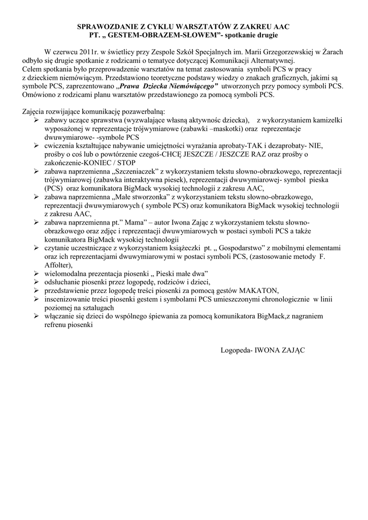 SPRAWOZDANIE Z CYKLU WARSZTATÓW Z ZAKREU AAC PT. „ GESTEM-OBRAZEM-SŁOWEM”- spotkanie drugie W czerwcu 2011r. w świetlicy przy Zespole Szkół Specjalnych im. Marii Grzegorzewskiej w Żarach odbyło się drugie spotkanie z rodzicami o tematyce dotyczącej Komunikacji Alternatywnej. Celem spotkania było przeprowadzenie warsztatów na temat zastosowania symboli PCS w pracy z dzieckiem niemówiącym. Przedstawiono teoretyczne podstawy wiedzy o znakach graficznych, jakimi są symbole PCS, zaprezentowano „Prawa Dziecka Niemówiącego” utworzonych przy pomocy symboli PCS. Omówiono z rodzicami planu warsztatów przedstawionego za pomocą symboli PCS. Zajęcia rozwijające komunikację pozawerbalną: zabawy uczące sprawstwa (wyzwalające własną aktywnośc dziecka), z wykorzystaniem kamizelki wyposażonej w reprezentacje trójwymiarowe (zabawki –maskotki) oraz reprezentacje dwuwymiarowe- -symbole PCS cwiczenia kształtujące nabywanie umiejętności wyrażania aprobaty-TAK i dezaprobaty- NIE, prośby o coś lub o powtórzenie czegoś-CHCĘ JESZCZE / JESZCZE RAZ oraz prośby o zakończenie-KONIEC / STOP zabawa naprzemienna „Szczeniaczek” z wykorzystaniem tekstu słowno-obrazkowego, reprezentacji trójwymiarowej (zabawka interaktywna piesek), reprezentacji dwuwymiarowej- symbol pieska (PCS) oraz komunikatora BigMack wysokiej technologii z zakresu AAC, zabawa naprzemienna „Małe stworzonka” z wykorzystaniem tekstu słowno-obrazkowego, reprezentacji dwuwymiarowych ( symbole PCS) oraz komunikatora BigMack wysokiej technologii z zakresu AAC, zabawa naprzemienna pt.” Mama” – autor Iwona Zając z wykorzystaniem tekstu słownoobrazkowego oraz zdjęc i reprezentacji dwuwymiarowych w postaci symboli PCS a także komunikatora BigMack wysokiej technologii czytanie uczestniczące z wykorzystaniem książeczki pt. „ Gospodarstwo” z mobilnymi elementami oraz ich reprezentacjami dwuwymiarowymi w postaci symboli PCS, (zastosowanie metody F. Affolter), wielomodalna prezentacja piosenki „ Pieski małe dwa” odsłuchanie piosenki przez logopedę, rodziców i dzieci, przedstawienie przez logopedę treści piosenki za pomocą gestów MAKATON, inscenizowanie treści piosenki gestem i symbolami PCS umieszczonymi chronologicznie w linii poziomej na sztalugach włączanie się dzieci do wspólnego śpiewania za pomocą komunikatora BigMack,z nagraniem refrenu piosenki Logopeda- IWONA ZAJĄC