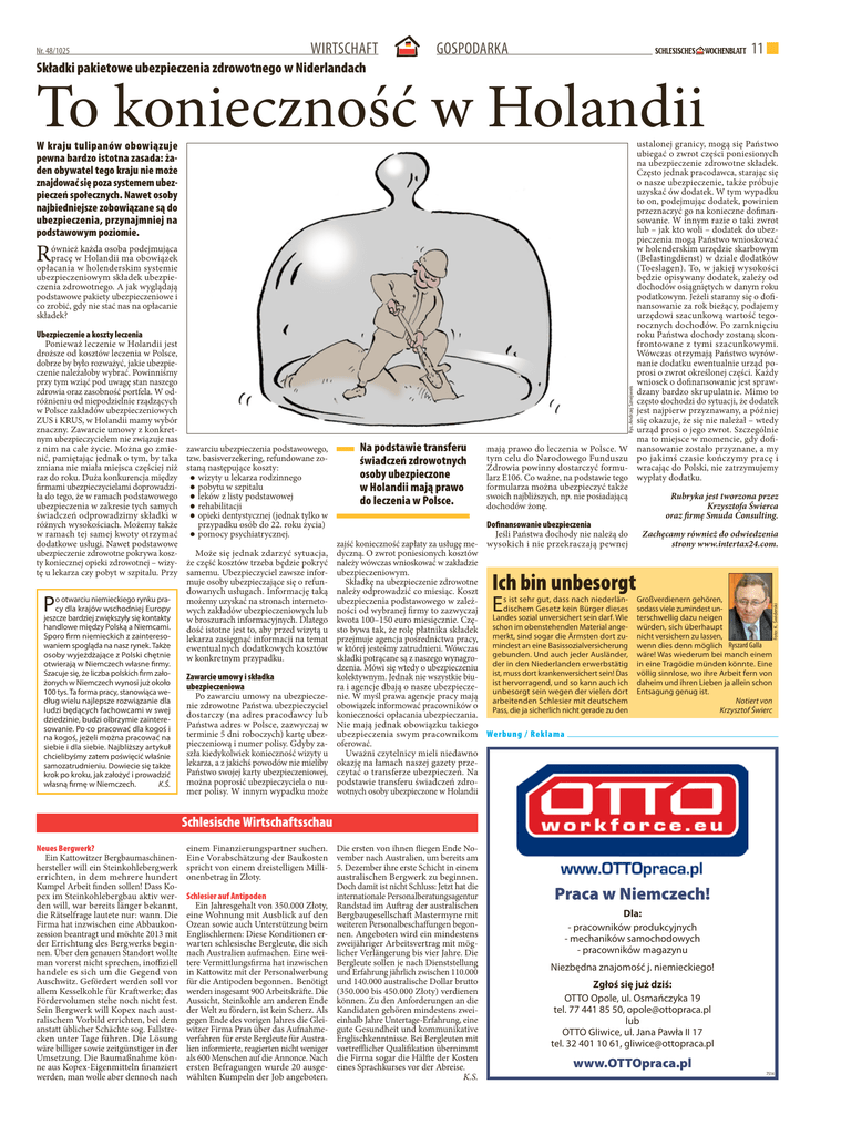 Nr. 48/1025 Wirtschaft Gospodarka 11 Składki pakietowe ubezpieczenia zdrowotnego w Niderlandach To konieczność w Holandii R Ubezpieczenie a koszty leczenia Ponieważ leczenie w Holandii jest droższe od kosztów leczenia w Polsce, dobrze by było rozważyć, jakie ubezpieczenie należałoby wybrać. Powinniśmy przy tym wziąć pod uwagę stan naszego zdrowia oraz zasobność portfela. W odróżnieniu od niepodzielnie rządzących w Polsce zakładów ubezpieczeniowych ZUS i KRUS, w Holandii mamy wybór znaczny. Zawarcie umowy z konkretnym ubezpieczycielem nie związuje nas z nim na całe życie. Można go zmienić, pamiętając jednak o tym, by taka zmiana nie miała miejsca częściej niż raz do roku. Duża konkurencja między firmami ubezpieczycielami doprowadziła do tego, że w ramach podstawowego ubezpieczenia w zakresie tych samych świadczeń odprowadzimy składki w różnych wysokościach. Możemy także w ramach tej samej kwoty otrzymać dodatkowe usługi. Nawet podstawowe ubezpieczenie zdrowotne pokrywa koszty koniecznej opieki zdrowotnej – wizytę u lekarza czy pobyt w szpitalu. Przy P o otwarciu niemieckiego rynku pracy dla krajów wschodniej Europy jeszcze bardziej zwiększyły się kontakty handlowe między Polską a Niemcami. Sporo firm niemieckich z zainteresowaniem spogląda na nasz rynek. Także osoby wyjeżdżające z Polski chętnie otwierają w Niemczech własne firmy. Szacuje się, że liczba polskich firm założonych w Niemczech wynosi już około 100 tys. Ta forma pracy, stanowiąca według wielu najlepsze rozwiązanie dla ludzi będących fachowcami w swej dziedzinie, budzi olbrzymie zainteresowanie. Po co pracować dla kogoś i na kogoś, jeżeli można pracować na siebie i dla siebie. Najbliższy artykuł chcielibyśmy zatem poświęcić właśnie samozatrudnieniu. Dowiecie się także krok po kroku, jak założyć i prowadzić własną firmę w Niemczech. K.Ś. Rys. Andrzej Sznejweis ównież każda osoba podejmująca pracę w Holandii ma obowiązek opłacania w holenderskim systemie ubezpieczeniowym składek ubezpieczenia zdrowotnego. A jak wyglądają podstawowe pakiety ubezpieczeniowe i co zrobić, gdy nie stać nas na opłacanie składek? zawarciu ubezpieczenia podstawowego, tzw. basisverzekering, refundowane zostaną następujące koszty: lwizyty u lekarza rodzinnego lpobytu w szpitalu lleków z listy podstawowej lrehabilitacji lopieki dentystycznej (jednak tylko w przypadku osób do 22. roku życia) lpomocy psychiatrycznej. Może się jednak zdarzyć sytuacja, że część kosztów trzeba będzie pokryć samemu. Ubezpieczyciel zawsze informuje osoby ubezpieczające się o refundowanych usługach. Informację taką możemy uzyskać na stronach internetowych zakładów ubezpieczeniowych lub w broszurach informacyjnych. Dlatego dość istotne jest to, aby przed wizytą u lekarza zasięgnąć informacji na temat ewentualnych dodatkowych kosztów w konkretnym przypadku. Zawarcie umowy i składka ubezpieczeniowa Po zawarciu umowy na ubezpieczenie zdrowotne Państwa ubezpieczyciel dostarczy (na adres pracodawcy lub Państwa adres w Polsce, zazwyczaj w terminie 5 dni roboczych) kartę ubezpieczeniową i numer polisy. Gdyby zaszła kiedykolwiek konieczność wizyty u lekarza, a z jakichś powodów nie mieliby Państwo swojej karty ubezpieczeniowej, można poprosić ubezpieczyciela o numer polisy. W innym wypadku może Na podstawie transferu świadczeń zdrowotnych osoby ubezpieczone w Holandii mają prawo do leczenia w Polsce. mają prawo do leczenia w Polsce. W tym celu do Narodowego Funduszu Zdrowia powinny dostarczyć formularz E106. Co ważne, na podstawie tego formularza można ubezpieczyć także swoich najbliższych, np. nie posiadającą dochodów żonę. Dofinansowanie ubezpieczenia Jeśli Państwa dochody nie należą do zajść konieczność zapłaty za usługę me- wysokich i nie przekraczają pewnej dyczną. O zwrot poniesionych kosztów należy wówczas wnioskować w zakładzie ubezpieczeniowym. Składkę na ubezpieczenie zdrowotne należy odprowadzić co miesiąc. Koszt s ist sehr gut, dass nach niederlänubezpieczenia podstawowego w zależdischem Gesetz kein Bürger dieses ności od wybranej firmy to zazwyczaj Landes sozial unversichert sein darf. Wie kwota 100–150 euro miesięcznie. Częschon im obenstehenden Material angesto bywa tak, że rolę płatnika składek merkt, sind sogar die Ärmsten dort zuprzejmuje agencja pośrednictwa pracy, mindest an eine Basissozialversicherung w której jesteśmy zatrudnieni. Wówczas gebunden. Und auch jeder Ausländer, składki potrącane są z naszego wynagroder in den Niederlanden erwerbstätig dzenia. Mówi się wtedy o ubezpieczeniu ist, muss dort krankenversichert sein! Das kolektywnym. Jednak nie wszystkie biuist hervorragend, und so kann auch ich ra i agencje dbają o nasze ubezpieczeunbesorgt sein wegen der vielen dort nie. W myśl prawa agencje pracy mają arbeitenden Schlesier mit deutschem obowiązek informować pracowników o Pass, die ja sicherlich nicht gerade zu den konieczności opłacania ubezpieczania. Nie mają jednak obowiązku takiego ubezpieczenia swym pracownikom Werbung / Reklama oferować. Uważni czytelnicy mieli niedawno okazję na łamach naszej gazety przeczytać o transferze ubezpieczeń. Na podstawie transferu świadczeń zdrowotnych osoby ubezpieczone w Holandii Ich bin unbesorgt E ustalonej granicy, mogą się Państwo ubiegać o zwrot części poniesionych na ubezpieczenie zdrowotne składek. Często jednak pracodawca, starając się o nasze ubezpieczenie, także próbuje uzyskać ów dodatek. W tym wypadku to on, podejmując dodatek, powinien przeznaczyć go na konieczne dofinansowanie. W innym razie o taki zwrot lub – jak kto woli – dodatek do ubezpieczenia mogą Państwo wnioskować w holenderskim urzędzie skarbowym (Belastingdienst) w dziale dodatków (Toeslagen). To, w jakiej wysokości będzie opisywany dodatek, zależy od dochodów osiągniętych w danym
