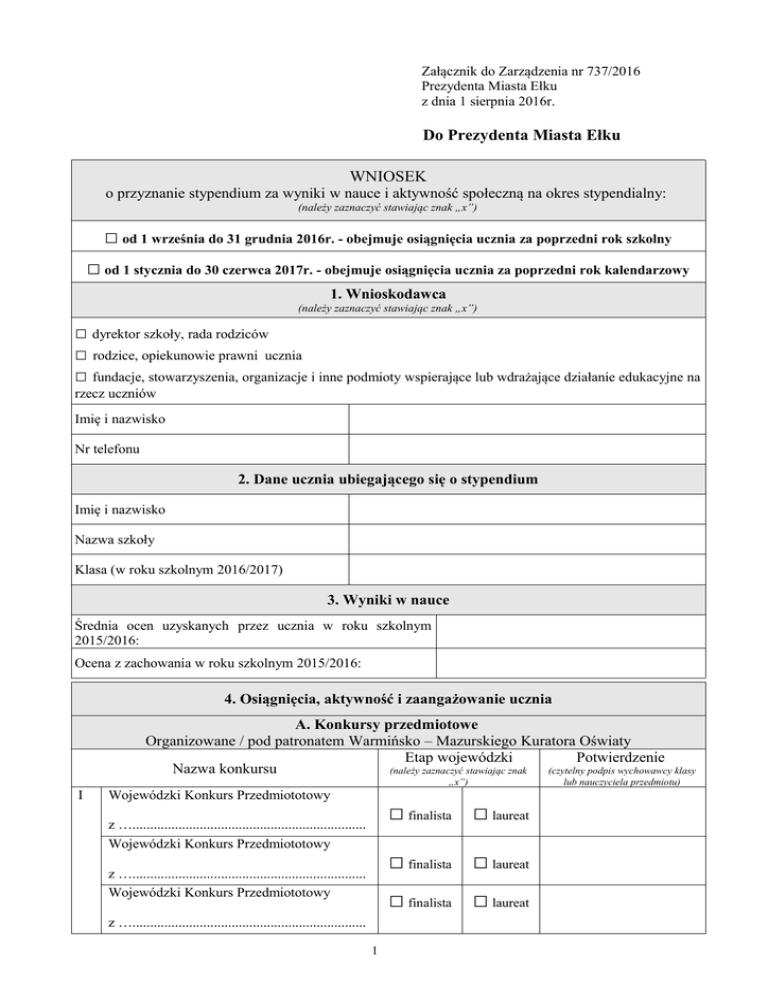 Załącznik do Zarządzenia nr 737/2016 Prezydenta Miasta Ełku z dnia 1 sierpnia 2016r. Do Prezydenta Miasta Ełku WNIOSEK o przyznanie stypendium za wyniki w nauce i aktywność społeczną na okres stypendialny: (należy zaznaczyć stawiając znak „x”) □ od 1 września do 31 grudnia 2016r. - obejmuje osiągnięcia ucznia za poprzedni rok szkolny □ od 1 stycznia do 30 czerwca 2017r. - obejmuje osiągnięcia ucznia za poprzedni rok kalendarzowy 1. Wnioskodawca (należy zaznaczyć stawiając znak „x”) □ dyrektor szkoły, rada rodziców □ rodzice, opiekunowie prawni ucznia □ fundacje, stowarzyszenia, organizacje i inne podmioty wspierające lub wdrażające działanie edukacyjne na rzecz uczniów Imię i nazwisko Nr telefonu 2. Dane ucznia ubiegającego się o stypendium Imię i nazwisko Nazwa szkoły Klasa (w roku szkolnym 2016/2017) 3. Wyniki w nauce Średnia ocen uzyskanych przez ucznia w roku szkolnym 2015/2016: Ocena z zachowania w roku szkolnym 2015/2016: 4. Osiągnięcia, aktywność i zaangażowanie ucznia A. Konkursy przedmiotowe Organizowane / pod patronatem Warmińsko – Mazurskiego Kuratora Oświaty Etap wojewódzki Potwierdzenie Nazwa konkursu (należy zaznaczyć stawiając znak (czytelny podpis wychowawcy klasy „x”) I Wojewódzki Konkurs Przedmiototowy □ finalista □ laureat z ….................................................................. Wojewódzki Konkurs Przedmiototowy □ finalista □ laureat z ….................................................................. Wojewódzki Konkurs Przedmiototowy □ finalista □ laureat z ….................................................................. 1 lub nauczyciela przedmiotu) Wojewódzki Konkurs Przedmiototowy □ finalista □ laureat z ….................................................................. Wojewódzki Konkurs Przedmiototowy □ finalista □ laureat z ….................................................................. II Międzynarodowy Konkurs „Kangur Matematyczny” □ □ □ laureat bardzo dobry wynik wyróżn ienie Inne III ….................................................................... B. Aktywność społeczna wraz z osiągnięciami Zaangażowanie społeczne w: szkole, stowarzyszeniach, fundacjach, klubach i innych organizacjach społecznych. (Dokładny opis aktywności z potwierdzeniem na podstawie dokumentów, a w szczególności: opinii wychowawcy klasy, młodzieżowych organizacji szkolnych i pozaszkolnych, organizacji harcerskich, instytucji kultury, organizacji pozarządowych i innych)) Nazwa klubu, stowarzyszenia, fundacji, organizacji, instytucji i innych podmiotów, w których lub na rzecz których działa uczeń Opis aktywności ucznia, na czym polega Częstotliwość □ □ działanie jednorazowe działanie stałe □ działanie jednorazowe działanie stałe □ □ działanie jednorazowe działanie stałe □ □ działanie jednorazowe działanie stałe □ działanie jednorazowe 2 □ □ działanie stałe □ □ działanie jednorazowe działanie stałe Dokumenty lub czytelny podpis osoby potwierdzającej zaangażowanie i osiągnięcia ucznia □ □ działanie jednorazowe działanie stałe □ □ działanie jednorazowe działanie stałe C. Szczególne osiągnięcia Inne niż w punktach A i B osiągnięcia w dziedzinie: sportu, plastyki, muzyki, teatru, tańca oraz inne konkursy, turnieje, spektakle, twórczość własna. Dokumenty lub czytelny podpis dziedzina osiągnięcie osiągnięcia o zasięgu osoby potwierdzającej □ □ □ □ szkolnym miejskim krajowym międzyna rodowym □ □ □ □ szkolnym miejskim krajowym międzyna rodowym □ □ □ □ szkolnym miejskim krajowym międzyna rodowym □ □ □ □ szkolnym miejskim krajowym międzyna rodowym □ □ □ □ szkolnym miejskim krajowym międzyna rodowym □ □ □ □ szkolnym miejskim krajowym międzyna rodowym □ □ □ □ szkolnym miejskim krajowym międzyna rodowym □ □ □ □ szkolnym miejskim krajowym międzyna rodowym □ □ □ □ szkolnym miejskim krajowym międzyna rodowym 3 □ □ □ □ szkolnym miejskim krajowym międzyna rodowym □ □ □ □ szkolnym miejskim krajowym międzyna rodowym □ □ □ □ szkolnym miejskim krajowym międzyna rodowym □ □ □ □ szkolnym miejskim krajowym międzyna rodowym □ □ □ □ szkolnym miejskim krajowym międzyna rodowym □ □ □ □ szkolnym miejskim krajowym międzyna rodowym 5. Oświadczenia wnioskodawcy 1. Jestem świadomy odpowiedzialności karnej za złożenie fałszywego oświadczenia. 2. Wyrażam zgodę na przetwarzanie danych osobowych zawartych we wniosku, zgodnie z ustawą z dnia 29 sierpnia 1997 r. o ochronie danych osobowych. …...................................................... …...........…................................................. (data) (podpis wnioskodawcy) 4 5