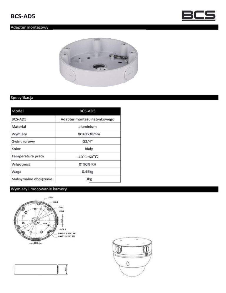 BCS-AD5 Adapter montażowy Specyfikacja Model BCS-AD5 BCS-AD5 Adapter montażu natynkowego Materiał aluminium Wymiary Φ161x38mm Gwint rurowy Kolor Temperatura pracy Wilgotność Waga Maksymalne obciążenie Wymiary i mocowanie kamery G3/4” biały -40°C~60°C 0~90% RH 0.45kg 3kg