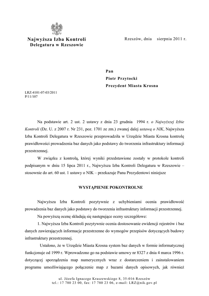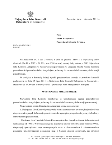 Rzeszów, dnia NajwyŜsza Izba Kontroli sierpnia 2011 r. Delegatura w Rzeszowie Pan Piotr Przytocki Prezydent Miasta Krosna LRZ-4101-07-03/2011 P/11/107 Na podstawie art. 2 ust. 2 ustawy z dnia 23 grudnia 1994 r. o NajwyŜszej Izbie Kontroli (Dz. U. z 2007 r. Nr 231, poz. 1701 ze zm.) zwanej dalej ustawą o NIK, NajwyŜsza Izba Kontroli Delegatura w Rzeszowie przeprowadziła w Urzędzie Miasta Krosna kontrolę prawidłowości prowadzenia baz danych jako podstawy do tworzenia infrastruktury informacji przestrzennej. W związku z kontrolą, której wyniki przedstawione zostały w protokole kontroli podpisanym w dniu 15 lipca 2011 r., NajwyŜsza Izba Kontroli Delegatura w Rzeszowie – stosownie do art. 60 ust. 1 ustawy o NIK – przekazuje Panu Prezydentowi niniejsze WYSTĄPIENIE POKONTROLNE NajwyŜsza Izba Kontroli pozytywnie z uchybieniami ocenia prawidłowość prowadzenia baz danych jako podstawy do tworzenia infrastruktury informacji przestrzennej. Na powyŜszą ocenę składają się następujące oceny szczegółowe: 1. NajwyŜsza Izba Kontroli pozytywnie ocenia dostosowanie ewidencji rejestrów i baz danych zawierających informacje przestrzenne do wymogów przepisów dotyczących budowy infrastruktury przestrzennej. Ustalono, Ŝe w Urzędzie Miasta Krosna system baz danych w formie informatycznej funkcjonuje od 1999 r. Wprowadzono go na podstawie umowy nr 8327 z dnia 4 marca 1996 r. dotyczącej sporządzenia map numerycznych wraz z dostarczeniem i zainstalowaniem programu umoŜliwiającego połączenie map z bazami danych opisowych, jak równieŜ ul. Józefa Ignacego Kraszewskiego 8, 35-016 Rzeszów tel.: 17 780 23 00, fax: 17 780 23 06, e-mail: [email protected] 2 w wyniku decyzji Prezydenta Miasta Krosna z dnia 9 lutego 1999 r., zatwierdzającej projekt modernizacji operatu opisowo kartograficznego ewidencji gruntów i budynków. W związku z powyŜszym Prezydent nie był zmuszony do podejmowania specjalnych działań związanych z przystosowaniem baz danych do wymogów infrastruktury informacji przestrzennej. Od roku 1999 baza (część opisowa i kartograficzna) prowadzona jest w formie informatycznej i podlegała ciągłym uzupełnieniom oraz modyfikacjom wynikającym ze zmian stanu prawnego oraz standardów technicznych. W grudniu 2010 r. nastąpiła równieŜ edycja metadanych dotycząca działek ewidencyjnych. Edytor został przygotowany przez Główny Urząd Geodezji i Kartografii. Metadane obejmowały informacje dotyczące zgodności zbiorów z obowiązującymi przepisami (z rozporządzeniem Ministra Rozwoju Regionalnego i Budownictwa z dnia 29 marca 2001 r. w sprawie ewidencji gruntów i budynków (Dz. U. Nr 38, poz. 454), z Instrukcją Techniczną G-5). Metadane zawierały opis pochodzenia zasobu geodezyjnego (np. modernizacja ewidencji gruntów i budynków), warunki dotyczące dostępu oraz wymagań wobec uŜytkownika ( np jawność, odpłatność, ograniczenia dostępu do ewidencji), nazwę organu odpowiedzialnego za udostępnianie danych jego adres oraz numery telefonów. 2. NajwyŜsza Izba Kontroli pozytywnie ocenia tworzenie i obsługę sieci usług umoŜliwiających wymianę zbiorów i usług danych przestrzennych. W kontroli ustalono, Ŝe w Urzędzie w latach 2008-2011 (I półrocze) była prowadzona usługa umoŜliwiająca korzystanie ze zbiorów i danych przestrzennych. Informacje geodezyjne umieszczono na stronie www.krosno.pl w witrynie WebEwid. Od 2010 r. są one pobierane i aktualizowane codziennie z bazy programu TurboEwid prowadzonej przez Wydział Geodezji i Kartografii i Gospodarki Nieruchomościami. System umoŜliwiał zgodnie z art. 9 ustawy z dnia 4 marca 2010 r. o infrastrukturze informacji przestrzennej (Dz. U. Nr 76, poz. 489) podgląd danych np. map zasadniczej całego miasta, nawigowanie, powiększanie, pomniejszanie, przesuwanie oraz nakładanie zobrazowanych zbiorów, jak równieŜ wyświetlanie objaśnień symboli kartograficznych. Ponadto w odpowiednich zakładkach moŜna było znaleźć dane o wyszukanym obiekcie np. wodociągu takie jak: nazwa, symbol dla skali ,plik odniesienia, długość. UŜytkownicy posiadający odpowiednie uprawnienia byli w stanie pobierać udostępnione zbiory, eksportować je do wybranego pliku: SWDE, XML, SHP, FDP przez co zapewniono interoperacyjność zgromadzonych zbiorów i usług danych przestrzennych. 3 Ponadto witryna WebEwid umoŜliwiała wyszukiwanie danych przestrzennych takich jak np działki w określonym obrębie, punkty osnowy, określony adres, jego połoŜenie geograficzne. 3. NajwyŜsza Izba Kontroli pozytywnie ze stwierdzeniem uchybień ocenia prowadzenie, aktualizowanie i udostępnianie baz danych zawierających informacje przestrzenne W kontroli stwierdzono, Ŝe w okresie 2008 – I półrocze 2011 ewidencja gruntów i budynków była prowadzona w formie systemu teleinformatycznego w rozumieniu art. 2 pkt 3 ustawy z dnia 18 lipca 2002 r. o świadczeniu usług drogą elektroniczną (Dz. U. Nr 144, poz. 1204 ze zm.). System informatycznych baz danych był oparty na programie „Turboewid”. Ewidencja gruntów i budynków zawierała wszystkie konieczne pozycje wymagane w art. 20 ustawy z dnia 17 maja 1989 r. Prawo geodezyjne i kartograficzne (Dz. U. z 2010 r. Nr 193, poz. 1287 ze zm.). Były to między innymi: informacje dotyczące – połoŜenia gruntów, granic nieruchomości, rodzajów uŜytków gruntowych, klas gleboznawczych, oznaczenia ksiąg wieczystych, przeznaczenia i funkcji uŜytkowych budynku, dane dotyczące właściciela. Ponadto ewidencja gruntów i budynków posiadała informacje o dowodach geodezyjnych i prawnych uzasadniających wpis do komputerowych baz danych. W odpowiedniej zakładce w systemie (Kartoteka robót i operatów ) znajdował się krótki opis dokumentu na podstawie którego dokonano wpisów, wzmianka o czynności prawnej dokonanej na jego podstawie (podział, sprzedaŜ) natomiast dokument papierowy wraz z zawiadomieniem o naniesionych zmianach był przechowywany
