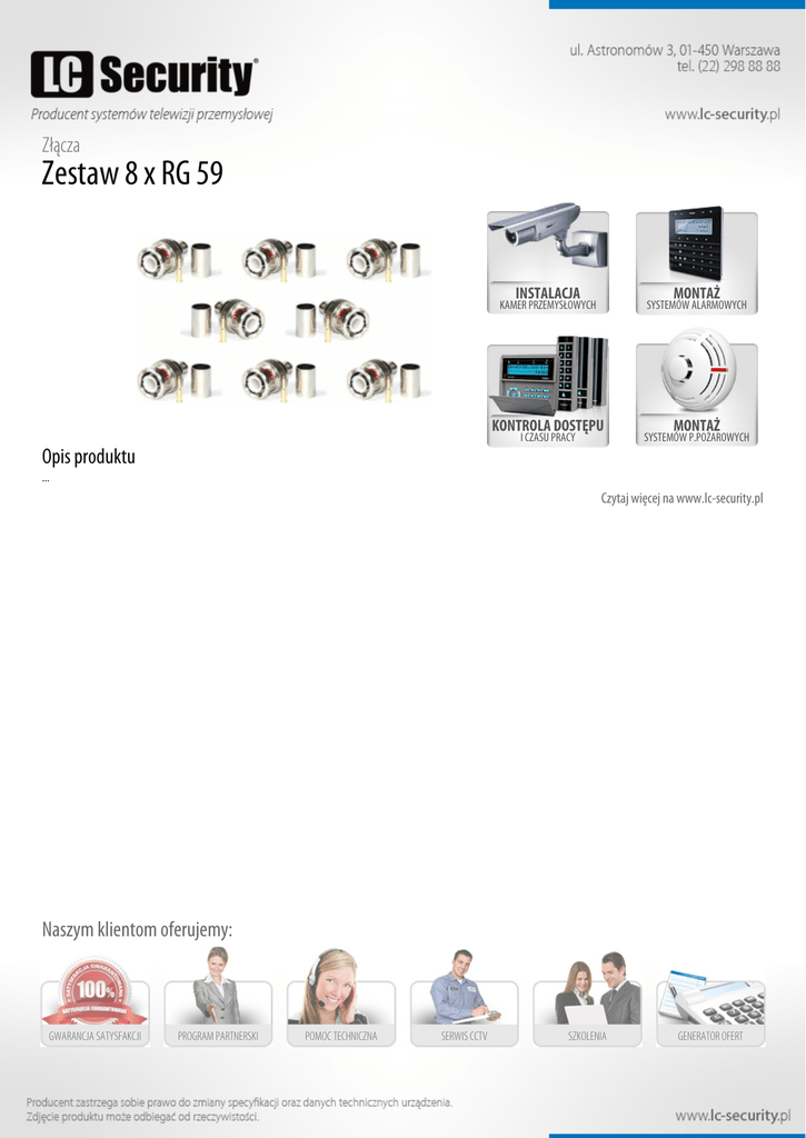 Złącza Zestaw 8 x RG 59 INSTALACJA MONTAŻ KAMER PRZEMYSŁOWYCH SYSTEMÓW ALARMOWYCH KONTROLA DOSTĘPU I CZASU PRACY MONTAŻ SYSTEMÓW P.POŻAROWYCH Opis produktu ... Czytaj więcej na www.lc-security.pl Naszym klientom oferujemy: GWARANCJA SATYSFAKCJI PROGRAM PARTNERSKI POMOC TECHNICZNA SERWIS CCTV SZKOLENIA GENERATOR OFERT