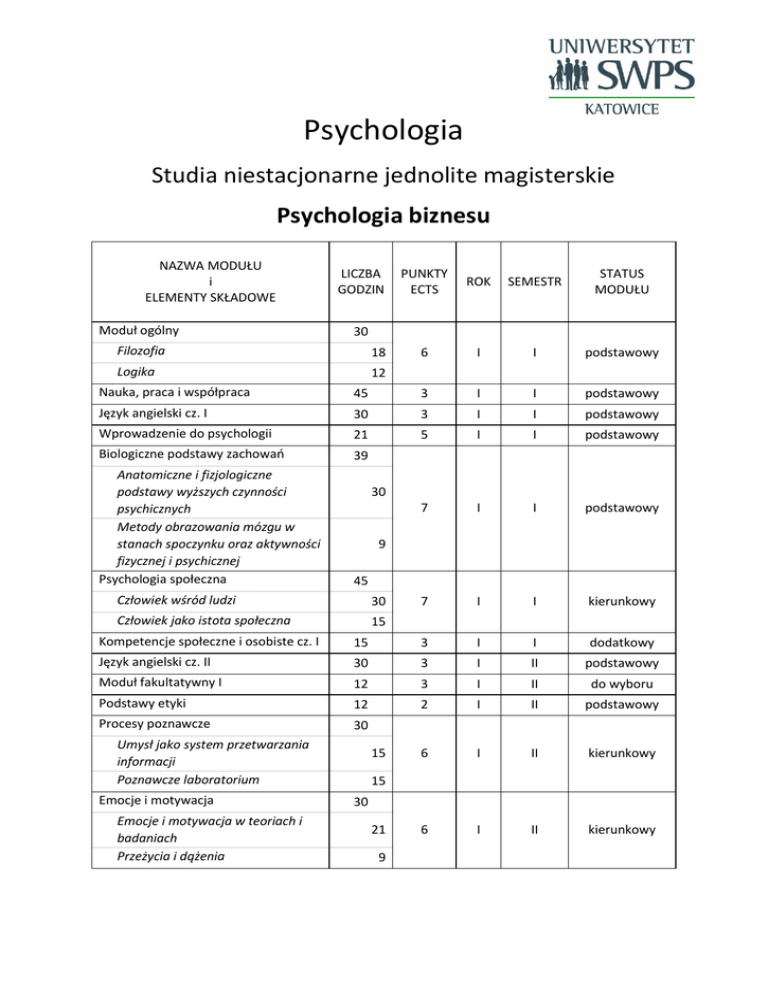 Psychologia Studia niestacjonarne jednolite magisterskie Psychologia biznesu NAZWA MODUŁU i ELEMENTY SKŁADOWE Moduł ogólny LICZBA GODZIN PUNKTY ECTS ROK SEMESTR STATUS MODUŁU 6 I I podstawowy 30 Filozofia 18 Logika 12 Nauka, praca i współpraca 45 3 I I podstawowy Język angielski cz. I 30 3 I I podstawowy Wprowadzenie do psychologii 21 5 I I podstawowy Biologiczne podstawy zachowań 39 7 I I podstawowy 7 I I kierunkowy Anatomiczne i fizjologiczne podstawy wyższych czynności psychicznych Metody obrazowania mózgu w stanach spoczynku oraz aktywności fizycznej i psychicznej Psychologia społeczna 30 9 45 Człowiek wśród ludzi 30 Człowiek jako istota społeczna 15 Kompetencje społeczne i osobiste cz. I 15 3 I I dodatkowy Język angielski cz. II 30 3 I II podstawowy Moduł fakultatywny I 12 3 I II do wyboru Podstawy etyki 12 2 I II podstawowy Procesy poznawcze 30 6 I II kierunkowy 6 I II kierunkowy Umysł jako system przetwarzania informacji Poznawcze laboratorium Emocje i motywacja Emocje i motywacja w teoriach i badaniach Przeżycia i dążenia 15 15 30 21 9 Psychologia rozwoju człowieka w cyklu życia – od okresu prenatalnego do wczesnej dorosłości Rozwój człowieka na przestrzeni życia Psychologia rozwoju człowieka 36 5 I II kierunkowy 3 I II dodatkowy 6 II III kierunkowy 6 II III podstawowy 10 II III podstawowy 15 3 II III dodatkowy 30 3 II III podstawowy Wychowanie fizyczne 24 1 II IV podstawowy Diagnoza psychologiczna – podstawy 15 3 II IV kierunkowy Psychopatologia 30 5 II IV kierunkowy 9 II IV ścieżkowy 9 II IV ścieżkowy Kompetencje społeczne i osobiste cz. II Osobowość 18 18 15 30 Osobowość w różnych perspektywach teoretycznych Analiza profili psychologicznych Psychologia różnic indywidualnych Różnice indywidualne jako przedmiot badań naukowych Metody pomiaru różnic indywidualnych Metodologia badań psychologicznych i statystyka – podstawy. Psychometria Metodologia badań psychologicznych z elementami psychometrii Podstawy pracy z pakietem statystycznym Podstawy psychometrii Kompetencje społeczne i osobiste cz. III Język angielski cz. III 21 9 30 15 15 60 21 23 16 Psychologia zaburzeń Prewencja zaburzeń i promocja zdrowia psychicznego Specjalnościowy 1_ Psychologia ekonomiczna Psychologia ekonomiczna 21 9 42 24 Zachowania konsumenckie Specjalnościowy 2_ Zarządzanie zasobami ludzkimi I Realizacja funkcji personalnej w firmie Rekrutacja, selekcja, adaptacja pracowników 18 42 6 15 Doradztwo zawodowe 6 Komunikacja wewnętrzna w firmie 6 Prezentacje biznesowe 9 Język angielski cz. IV Specjalnościowy 3_Człowiek i nowe media Psychologia internetu 30 3 II IV podstawowy 4 III V ścieżkowy 8 III V ścieżkowy 8 III V ścieżkowy 4 III V ścieżkowy 30 5 III V dodatkowy 15 2 III VI dodatkowy 8 III VI ścieżkowy 8 III VI ścieżkowy 8 III VI ścieżkowy 15 9 Psychologiczne aspekty web 2.0 Specjalnościowy 4_ Reklama i marketing I Reklama - wprowadzenie 6 39 18 Marketing - wprowadzenie Specjalnościowy 5_ Zarządzanie zasobami ludzkimi II Szkolenie i rozwój pracowników 21 39 20 Systemy ocen okresowych 6 AC, DC 9 Outplacement 4 Specjalnościowy 6_ Zarządzanie zespołem Budowanie zespołu 18 12 Rywalizacja i współpraca Projekt empiryczny cz. I Proaktywność jako podstawa przedsiębiorczości Specjalnościowy 7_ Reklama i marketing II Public relations 6 39 15 Reklama - kurs rozszerzony 12 Marketing - kurs rozszerzony 12 Specjalnościowy 8_ Rozwiązywanie konfliktów Konflikty 39 6 Negocjacje 18 Mediacje 15 Specjalnościowy 9_ Motywowanie pracowników Motywowanie finansowe z elementami prawa pracy Motywowanie pozafinansowe pracowników Zarządzanie przez cele 39 12 12 15 Projekt empiryczny cz. II Metodologia badań psychologicznych i statystyka – kurs zaawansowany cz. I Metodologia badań psychologicznych – kurs zaawansowany, wykład Metodologia badań psychologicznych – kurs zaawansowany, ćwiczenia Diagnoza psychologiczna – kurs zaawansowany Diagnoza psychologiczna dla zaawansowanych Laboratorium diagnozy Specjalnościowy 10_ Narzędzia ZZL 30 5 III VI dodatkowy 6 IV VII podstawowy 6 IV VII kierunkowy 8 IV VII specjalnościowy 30 6 24 36 15 21 45 Projektowanie procesu i narzędzi rekrutacja i selekcja Tworzenie systemów motywacyjnych i oceny pracowników Moduł fakultatywny cz. II 21 5 IV VII do wyboru Seminarium magisterskie cz. I 30 5 IV VII podstawowy 4 IV VII dodatkowy 6 IV VIII podstawowy 30 5 IV VIII podstawowy 18 5 IV VIII do wyboru 8 IV VIII specjalnościowy 8 IV VIII specjalnościowy Problemy seniorów- pomoc psychologiczna i aktywizacja Psychologia późnej dorosłości 24 21 24 9 Podstawy geriatrii 9 Praca socjalna 6 Metodologia badań psychologicznych i statystyka – kurs zaawansowany cz. II Statystyczna analiza danych – kurs zaawansowany, wykład Statystyczna analiza danych – kurs zaawansowany, ćwiczenia Seminarium magisterskie cz. II Moduł fakultatywny cz. III Specjalnościowy 11_ Badania psychospołeczne Metody badań psychospołecznych Projekt grupowy- badania psychospołeczne Specjalnościowy 12_ Trudności i patologie w organizacji Trening radzenia sobie ze stresem Wypalenie zawodowe i mobbing 30 6 24 45 18 27 45 15 15 Pomoc w sytuacji kryzysu i katastrof, kataklizmy Etyka zawodu psychologa – kurs zaawansowany 12 Psychologia społeczności 21 Problemy społeczności lokalnych: marginalizacja, sprawiedliwość społeczna, integracja i adaptacja Metody badań i interwencje w społeczności lokalnej Specjalnościowy 13_ Wybrane zagadnienia z psychologii marketingu Psychologia polityczna 15 9 V IX podstawowy 2 v IX dodatkowy 8 V IX specjalnościowy 6 V IX specjalnościowy 2 V IX specjalnościowy 12 45 9 Marketing polityczny Projekt grupowy - marketing i reklama Specjalnościowy 14_ Decyzje menadżerskie Przywództwo 2 15 21 30 15 Psychologia decyzji 15 Specjalnościowy 15a_ Psychologia społeczności w praktyce cz. I Psychologia społeczności- projekt grupowy Seminarium magisterskie cz. III 30 5 V IX po