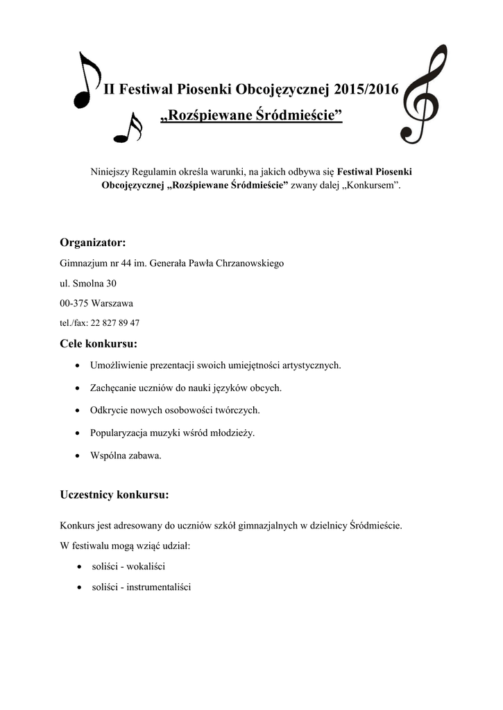 II Festiwal Piosenki Obcojęzycznej 2015/2016 „Rozśpiewane Śródmieście” Niniejszy Regulamin określa warunki, na jakich odbywa się Festiwal Piosenki Obcojęzycznej „Rozśpiewane Śródmieście” zwany dalej „Konkursem”. Organizator: Gimnazjum nr 44 im. Generała Pawła Chrzanowskiego ul. Smolna 30 00-375 Warszawa tel./fax: 22 827 89 47 Cele konkursu: Umożliwienie prezentacji swoich umiejętności artystycznych. Zachęcanie uczniów do nauki języków obcych. Odkrycie nowych osobowości twórczych. Popularyzacja muzyki wśród młodzieży. Wspólna zabawa. Uczestnicy konkursu: Konkurs jest adresowany do uczniów szkół gimnazjalnych w dzielnicy Śródmieście. W festiwalu mogą wziąć udział: soliści - wokaliści soliści - instrumentaliści Terminarz konkursu: Warunkiem udziału w konkursie jest nadesłanie prawidłowo wypełnionej karty zgłoszenia do dnia 20.11.2015 r. Karty zgłoszenia należy: 1. doręczyć osobiście do sekretariatu Gimnazjum nr 44, w godz. 8.00 – 15.30 (poniedziałek – piątek). 2. przesłać zeskanowaną kartę na adres mailowy: [email protected] 3. przesłać ją faxem na numer: 22 827 89 47. Eliminacje festiwalowe odbędą się 4 grudnia 2015 r. od godz. 14. 00 w Gimnazjum nr 44 im. Generała Pawła Chrzanowskiego. Ogłoszenie wyników odbędzie się po przesłuchaniach eliminacyjnych i obradach jury. Kryteria oceny: • • • • • • dobór repertuaru dostosowany do wieku, umiejętności gry na instrumencie lub możliwości wokalnych uczestnika rozumienie treści utworu interpretacja utworu muzykalność intonacja ogólny wyraz estetyczno-artystyczny Zasady konkursu: 1.Każdy uczestnik przygotowuje jedną piosenkę w wybranym języku: • • • • • angielskim niemieckim francuskim hiszpańskim rosyjskim W przypadku gry na instrumencie uczestnik wykonuje linię melodyczną lub improwizację na jej temat. 2. Maksymalna długość piosenki – 4 minuty. 3. Uczestnicy oceniani są w dwóch odrębnych kategoriach. 4. Jedna placówka może zgłosić maksymalnie 2 uczestników w każdej kategorii. 5. Ścieżki dźwiękowe (akompaniament) nie mogą mieć nagranego wokalu. 6. W kategorii wokalnej dopuszcza się samodzielny akompaniament grany na gitarze lub pianinie. 7. W kategorii instrumentalista uczestnik może wykonać utwór a cappella lub z podkładem muzycznym. 8. Dopuszcza się wyłącznie ścieżki dźwiękowe na nośnikach - CD (pliki audio), USB. 8. Kolejność występów ustala organizator. 9. Nośnik z akompaniamentem dostarczają uczestnicy w dniu występu. Nośniki muszą być opisane (imię i nazwisko solisty, tytuł utworu). 10. Organizator zapewnia sprzęt nagłaśniający, pianino cyfrowe, pulpity. 11. W skład jury wchodzą osoby oceniające kryteria muzyczne oraz osoby oceniające kryteria językowe. 12. Zwycięzcy konkursu otrzymają atrakcyjne nagrody m.in. statuetki, sprzęt muzyczny. UWAGI: Warunkiem uczestnictwa w konkursie jest podpisanie i dostarczenie karty zgłoszeniowej. Udział w konkursie jest równoznaczny z wyrażeniem zgody na przetwarzanie danych osobowych jego uczestników na potrzeby konkursu (ustawa o ochronie danych osobowych z dnia 29.08.1997r. Dz.U. Nr 133, poz. 833 z późn. zm. ) oraz wyrażeniem zgody na wykorzystywanie przez organizatora jego wizerunku w formie zdjęć i filmów wykorzystywanych do dokumentacji i promocji Gimnazjum nr 44 im. Generała Pawła Chrzanowskiego w Warszawie. Ostateczna interpretacja Regulaminu przysługuje organizatorom. Organizatorzy decydują również o wszystkich sprawach związanych z Festiwalem, a nie objętych niniejszym regulaminem. Wszelkich informacji udziela koordynator konkursu: Aleksandra Kania e-mail: [email protected] tel. 22 827 89 47 KARTA ZGŁOSZENIA UCZESTNIKA II Festiwalu Piosenki Obcojęzycznej „Rozśpiewane Śródmieście” 1.Imię i nazwisko uczestnika: ........................................................................................................................ 2.Język wykonywanego utworu: ........................................................................................................................ 3.Tytuł wykonywanego utworu: ........................................................................................................................ 4. Nazwa oryginalnego wykonawcy: ........................................................................................................................ 5.Nazwa i adres szkoły / placówki: ........................................................................................................................ ........................................................................................................................ 6.Imię i nazwisko opiekuna uczestnika: ........................................................................................................................ 7. Adres e-mail, numer tel. kontaktowego do opiekuna uczestnika ........................................................................................................................ ........................................................................................................................ 8.Zapotrzebowanie na sprzęt: ........................................................................................................................ Pieczątka placówki: Podpis dyrektora: *Dane w karcie zgłoszenia proszę wypełnić wyraźnie pismem drukowanym * Podpis dyrektora jest równoznaczny z akceptacją regulaminu oraz wyrażeniem zgody na przetwarzanie danych osobowych i wykorzystywaniem wizerunku uczestników