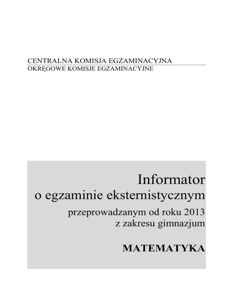 CENTRALNA KOMISJA EGZAMINACYJNA OKRĘGOWE KOMISJE EGZAMINACYJNE Informator o egzaminie eksternistycznym przeprowadzanym od roku 2013 z zakresu gimnazjum MATEMATYKA MATEMATYKA Informator o egzaminie eksternistycznym przeprowadzanym od roku 2013 z zakresu gimnazjum opracowany przez Centralną Komisję Egzaminacyjną we współpracy z okręgowymi komisjami egzaminacyjnymi w Gdańsku, Jaworznie, Krakowie, Łodzi, ŁomŜy, Poznaniu, Warszawie i Wrocławiu Warszawa 2012 Centralna Komisja Egzaminacyjna ul. Józefa Lewartowskiego 6, 00-190 Warszawa tel. 22 536 65 00 [email protected] www.cke.edu.pl Okręgowa Komisja Egzaminacyjna w Gdańsku ul. Na Stoku 49, 80-874 Gdańsk tel. 58 320 55 90 [email protected] www.oke.gda.pl Okręgowa Komisja Egzaminacyjna w Jaworznie ul. Adama Mickiewicza 4, 43-600 Jaworzno tel. 32 616 33 99 [email protected] www.oke.jaworzno.pl Okręgowa Komisja Egzaminacyjna w Krakowie os. Szkolne 37, 31-978 Kraków tel. 12 683 21 01 [email protected] www.oke.krakow.pl Okręgowa Komisja Egzaminacyjna w ŁomŜy ul. Nowa 2, 18-400 ŁomŜa tel. 86 216 44 95 [email protected] www.oke.lomza.pl Okręgowa Komisja Egzaminacyjna w Łodzi ul. Ksawerego Praussa 4, 94-203 Łódź tel. 42 634 91 33 [email protected] www.komisja.pl Okręgowa Komisja Egzaminacyjna w Poznaniu ul. Gronowa 22, 61-655 Poznań tel. 61 854 01 60 [email protected] www.oke.poznan.pl Okręgowa Komisja Egzaminacyjna w Warszawie ul. Grzybowska 77, 00-844 Warszawa tel. 22 457 03 35 [email protected] www.oke.waw.pl Okręgowa Komisja Egzaminacyjna we Wrocławiu ul. Tadeusza Zielińskiego 57, 53-533 Wrocław tel. 71 785 18 52 [email protected] www.oke.wroc.pl SPIS TREŚCI I Informacje ogólne……………………………….…… ....................................................................................... 7 II Wymagania egzaminacyjne ........................................................................ …………………………………11 III Opis egzaminu…………………………………………………………………….…………………………………………..…………17 IV Przykładowy arkusz egzaminacyjny ............ ………………………..………………………………..…………………20 V Przykładowe rozwiązania zadań zamieszczonych w arkuszu egzaminacyjnym i ich ocena..34 Informator o egzaminie eksternistycznym z matematyki z zakresu gimnazjum I INFORMACJE OGÓLNE I.1. Podstawy prawne Zgodnie z ustawą z 7 września 1991 r. o systemie oświaty (Dz. U. z 2004 r. nr 256, poz. 2572 z późn. zm.) egzaminy eksternistyczne są integralną częścią zewnętrznego systemu egzaminowania. Za przygotowanie i przeprowadzanie tych egzaminów odpowiadają Centralna Komisja Egzaminacyjna i okręgowe komisje egzaminacyjne. Sposób przygotowania i przeprowadzania egzaminów eksternistycznych reguluje rozporządzenie Ministra Edukacji Narodowej z 11 stycznia 2012 r. w sprawie egzaminów eksternistycznych (Dz. U. z 17 lutego 2012 r., poz. 188). Na podstawie wspomnianego aktu prawnego CKE i OKE opracowały Procedury organizowania i przeprowadzania egzaminów eksternistycznych z zakresu szkoły podstawowej dla dorosłych, gimnazjum dla dorosłych, liceum ogólnokształcącego dla dorosłych oraz zasadniczej szkoły zawodowej. Egzaminy eksternistyczne z zakresu kształcenia ogólnego w gimnazjum są przeprowadzane z następujących przedmiotów: język polski, język obcy nowożytny, historia, wiedza o społeczeństwie, geografia, biologia, chemia, fizyka i astronomia, matematyka, informatyka, zgodnie z wymaganiami określonymi w rozporządzeniu Ministra Edukacji Narodowej z 27 sierpnia 2012 r. w sprawie podstawy programowej wychowania przedszkolnego oraz kształcenia ogólnego w poszczególnych typach szkół (Dz. U. z 30 sierpnia 2012 r., poz. 977) I.2. Warunki przystąpienia do egzaminów eksternistycznych Do egzaminów eksternistycznych z zakresu wymagań określonych w podstawie programowej kształcenia ogólnego dla gimnazjum może przystąpić osoba, która ukończyła sześcio- lub ośmioletnią szkołę podstawową. Osoba, która chce zdawać wyżej wymienione egzaminy eksternistyczne i spełnia formalne warunki, powinna nie później niż na 2 miesiące przed terminem rozpoczęcia sesji egzaminacyjnej złożyć do jednej z ośmiu okręgowych komisji egzaminacyjnych wniosek o dopuszczenie do egzaminów zawierający: 1) imię (imiona) i nazwisko, 2) datę i miejsce urodzenia, 7 Informator o egzaminie eksternistycznym z matematyki z zakresu gimnazjum 3) numer PESEL, a w przypadku braku numeru PESEL – serię i numer paszportu lub innego dokumentu potwierdzającego tożsamość, 4) adres, 5) wskazanie, jako typu szkoły, gimnazjum. Do wniosku należy dołączyć także świadectwo ukończenia szkoły podstawowej. Wniosek ten znajduje się na stronach internetowych OKE w formie załącznika do Procedur organizowania i przeprowadzania egzaminów eksternistycznych. W terminie 14 dni od dnia otrzymania przez OKE wniosku zainteresowana osoba zostaje pisemnie poinformowana o wynikach postępowania kwalifikacyjnego. Od rozstrzygnięcia komisji okręgowej służy odwołanie do dyrektora Centralnej Komisji Egzaminacyjnej w terminie 7 dni od dnia jego doręczenia. Rozstrzygnięcie dyrektora CKE jest ostateczne. W przypadku zakwalifikowania osoby do zdawania egzaminów eksternistycznych dyrektor OKE informuje ją o konieczności złożenia deklaracji oraz dowodu wniesienia opłaty za zadeklarowane egzaminy lub wniosku o zwolnienie z opłaty. Informację o miejscach przeprowadzania egzaminów dyrektor OKE podaje do publicznej wiadomości na stronie internetowej okręgowej komisji egzaminacyjnej nie później niż na 15 dni przed terminem rozpoczęcia sesji egzaminacyjnej. Osoba dopuszczona do egzaminów eksternistycznych zdaje egzaminy w okresie nie dłuższym niż 3 lata. W uzasadnionych wypadkach, na wniosek zdającego, dyrektor komisji okręgowej może przedłużyć okre