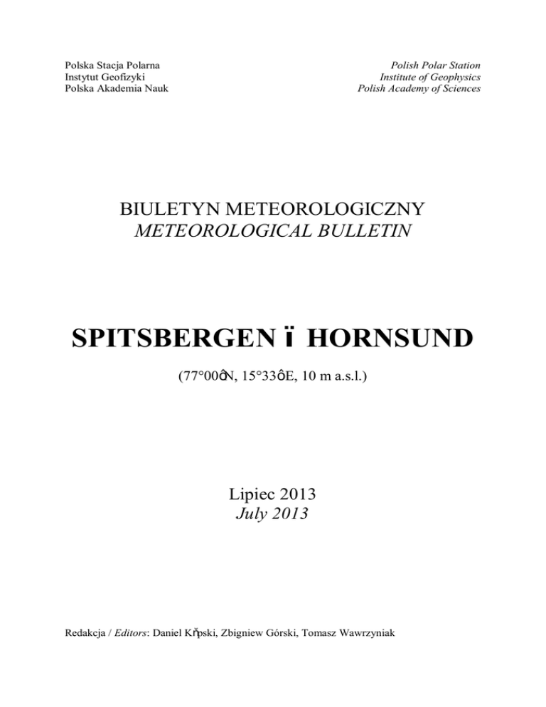 Polska Stacja Polarna Instytut Geofizyki Polska Akademia Nauk Polish Polar Station Institute of Geophysics Polish Academy of Sciences BIULETYN METEOROLOGICZNY METEOROLOGICAL BULLETIN SPITSBERGEN – HORNSUND (77°00’N, 15°33’ E, 10 m a.s.l.) Lipiec 2013 July 2013 Redakcja / Editors: Daniel Kępski, Zbigniew Górski, Tomasz Wawrzyniak Charakterystyka wybranych elementów meteorologicznych w lipcu 2013 na tle wartości wieloletnich 1979-2012. Monthly mean and extreme values of meteorological parameters in July 2013. 2013 1978-2012 TEMPERATURA POWIETRZA / AIR TEMPERATURE [°C] średnia miesięczna / monthly mean 5,9 maksymalna / maximum 12,0 (13.07) 13,5 (07.07.2005) minimalna / minimum 2,5 (11.07) -1,3 (02.07.2010) minimalna przy gruncie / minimum near the ground 2,7 (24;25.07) -3,5 (24.07.1978) maks. amplituda dobowa / max daily amplitude 7,5 (4.07) 9,3 (02.07.1983) 4,4 CIŚNIENIE ATMOSFERYCZNE / AIR PRESSURE [hPa] (0 m a.s.l.) średnie miesięczne / monthly mean 1009,3 maksymalne / maximum 1017,8 (24.07) 1030,2 (04.07.2008) minimalne / minimum 998,8 (10.07) 979,8 (25.07.1995) maks. wartość tendencji za 3h / max tendency per 3h ↓3,7 (7.07) ↓ 5,3 (06.07.2012) 1011,8 PRĘDKOŚĆ WIATRU / WIND SPEED [m/s] średnia miesięczna / monthly mean 3,7 maks. średnia w obserwacji / max mean at observation 13 (3.07) 19 maks. poryw / max wind gust 27 (3.07) - dni z wiatrem silnym / days with strong wind [≥10m/s] 7 4,0 (18.07.1986) 7 WILGOTNOŚĆ WZGLĘDNA / RELATIVE HUMIDITY [%] średnia miesięczna / monthly mean 87 84 minimalna w obserwacji / minimum at observation 68 39 (07.07.2005) OPADY I POKRYWA ŚNIEŻNA / PRECIPITATION AND SNOW COVER suma miesięczna / monthly precipitation [mm] 63,2 maks. suma dobowa / max daily precipitation [mm] 12,2 41,2 (4.07) 40,5 dni z pokrywą śnieżną / day with snow cover 0 0 maks. wys. pokrywy śnieżnej / max snow depth [cm] - - 132,3 154,3 84 80 usłonecznienie / total sunshine [h] średnie zachmurzenie / mean cloud cover [%] (28.07.1986) Zestawienie dobowych wartości wybranych elementów meteorologicznych w lipcu 2013. Daily values of selected meteorological parameters in July 2013. Temperatura powietrza Ciśnienie Pressure [hPa] Air temperature Dzień Day 1 2 3 4 5 6 7 8 9 10 11 12 13 14 15 16 17 18 19 20 21 22 23 24 25 26 27 28 29 30 31 śred. mean Prędkość wiatru Wind speed [°C] średnia dobowa daily mean max 7,0 6,8 9,7 5,4 4,9 5,5 6,9 5,2 5,8 4,9 5,0 5,2 5,5 6,6 5,5 4,9 5,5 6,1 6,2 4,8 5,2 5,3 5,3 5,6 6,0 5,1 6,0 7,3 7,0 6,3 7,0 8,1 10,2 12,0 10,7 6,5 8,0 8,6 7,7 8,3 6,1 8,7 8,8 6,8 8,9 7,2 7,3 8,0 9,0 8,3 8,0 6,4 6,0 8,0 8,6 8,8 8,6 7,6 8,8 9,0 8,7 8,2 Usłonecznienie Total sunshine [h] min 4,7 3,8 6,7 3,2 3,5 4,1 4,5 3,5 3,7 3,8 2,5 3,4 3,8 4,1 3,8 3,3 3,3 4,4 4,7 3,8 3,8 4,1 3,0 3,0 3,4 3,7 5,3 4,5 5,6 3,9 5,7 średnie dobowe daily mean średnia dobowa daily mean maks. poryw max gust średnia dobowa średnie dobowe suma dobowa suma dobowa daily mean daily mean daily total daily total 5,1 4,7 7,7 3,5 4,2 4,4 4,9 3,8 4,7 3,7 2,9 3,2 4,4 5,5 5,5 3,2 3,0 4,9 4,8 4,3 3,8 3,9 3,3 2,7 2,7 4,3 5,3 5,0 5,3 4,0 5,5 1009,4 1010,4 1006,5 1004,7 1006,7 1007,6 1003,3 1001,0 1000,8 998,8 1004,0 1014,6 1014,7 1007,1 1000,0 1000,8 1009,2 1014,7 1016,7 1005,5 1006,4 1014,8 1016,3 1017,8 1016,6 1013,4 1011,3 1015,3 1016,4 1013,6 1011,1 4,1 4,1 11,9 3,8 2,1 4,0 4,3 1,8 3,6 5,1 1,6 2,0 2,1 4,5 2,0 3,9 2,1 2,9 6,6 4,4 6,0 5,1 1,3 1,4 3,4 2,6 1,6 1,6 0,6 7,8 7,9 . 13 27 . . . 13 . . 11 . . . 12 . . . . 14 15 . . . . 11 . . . . 16 16 94 92 77 89 97 96 93 96 90 84 84 84 81 77 86 80 80 82 80 91 92 93 88 81 84 95 89 90 94 87 86 94 95 89 98 89 98 98 98 88 91 81 83 64 34 91 83 56 53 88 100 100 100 81 59 67 95 95 94 97 55 83 4,5 0,2 0,5 12,2 5,0 4,4 5,0 3,6 0,1 0,0 . . . . 3,4 . . . 4,8 10,1 2,0 0,2 0,0 . 0,1 0,8 0,0 4,0 0,3 0,0 2,0 . . . . . . . . 2,7 2,1 2,3 4,5 11,4 18,7 1,5 5,6 13,9 17,1 4,7 . . . 4,4 10,2 11,7 . 0,8 . . 15 5,7 1009,3 3,7 87 84 63,2 132,3 12,2 18,7 total 2,5 12,0 [%] Opady Precipitation [mm] min. przy gruncie min near the ground 5,9 4,8 9,7 Zachmurzenie Cloud cover [m/s] suma min max Wilgotność Humidity [%] 2,7 27 Średnia, minimalna i maksymalna dobowa temperatura powietrza [°C] Daily mean and extreme values of air temperature [°C] [˚C] 14 12 10 8 6 4 2 0 1 2 3 4 5 6 7 8 9 10 11 12 13 14 15 16 17 18 19 20 21 22 23 24 25 26 27 28 29 30 31 dni średnia dobowa maksymalna minimalna Średnie dobowe ciśnienie powietrza na poz. morza oraz dobowa suma opadów Daily mean air pressure (0 m asl) [hPa] and daily total precipitation [mm] [mm] 15,0 [hPa] 1020 1015 10,0 1010 1005 5,0 1000 0,0 995 1 2 3 4 5 6 7 8 9 10 11 12 13 14 15 16 17 18 19 20 21 22 23 24 25 26 27 28 29 30 31 opady ciśnienie dni Średnia dobowa prędkość wiatru oraz maksymalny dobowy poryw [m/s] Daily mean wind speed and maximum wind gust [m/s] [m/s] 30 25 20 15 10 5 0 1 2 3 4 5 6 7 8 9 10 11 12 13 14 15 16 17 18 19 20 21 22 23 24 25 26 27 28 29 30 31 dni średnia porywy Częstość występowania kierunków wiatru [%] Frequency of occurance of wind directions [%] N 30 NNW NNE 25 NW NE 20 15 WNW ENE 10 5 W E 0 WSW ESE SW SE SSW SSE S cisze/calm - 7% KOMENTARZ OBSERWATORA Lipiec 2013 r. ze średnią temperaturą 5,9°C okazał się najcieplejszym od 1978 roku, będąc o 1,5°C cieplejszym od średniej miesięcznej w poprzednich latach. Najwyższa temperatura wystąpiła 13 lipca i było to równo 12,0°C. Na uwagę zasługuje fakt, że ani razu nie zanotowano w tym miesiącu przymrozka. Suma opadów wyniosła 63,2 mm co stanowi nieco ponad 150% normy miesięcznej. Warto nadmienić, że wystąpiły dwa dni z sumą opadów przekraczająca 10 mm (4.07 i 20.07). Wszystkie opady lipca wystąpiły w postaci ciekłej. Pod względem wietrzności lipiec okazał się miesiącem przeciętnym, podczas którego zanotowano, jak zazwyczaj, 7 dni z wystąpieniem średniej prędkości wiatru >10 m/s, a średnia miesięczna wyniosła 3,7 m/s, czyli nieco mniej niż wynikałoby to z wartości wielole