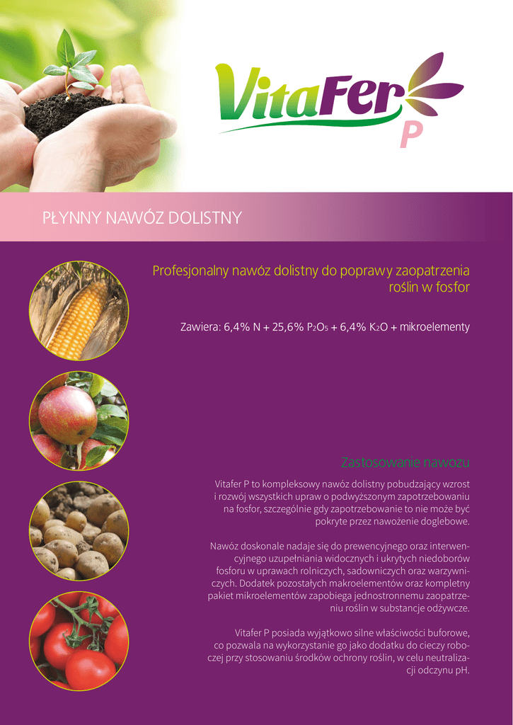 PŁYNNY NAWÓZ DOLISTNY Profesjonalny nawóz dolistny do poprawy zaopatrzenia roślin w fosfor Zawiera: 6,4% N + 25,6% P2O5 + 6,4% K2O + mikroelementy Zastosowanie nawozu Vitafer P to kompleksowy nawóz dolistny pobudzający wzrost i rozwój wszystkich upraw o podwyższonym zapotrzebowaniu na fosfor, szczególnie gdy zapotrzebowanie to nie może być pokryte przez nawożenie doglebowe. Nawóz doskonale nadaje się do prewencyjnego oraz interwencyjnego uzupełniania widocznych i ukrytych niedoborów fosforu w uprawach rolniczych, sadowniczych oraz warzywniczych. Dodatek pozostałych makroelementów oraz kompletny pakiet mikroelementów zapobiega jednostronnemu zaopatrzeniu roślin w substancje odżywcze. Vitafer P posiada wyjątkowo silne właściwości buforowe, co pozwala na wykorzystanie go jako dodatku do cieczy roboczej przy stosowaniu środków ochrony roślin, w celu neutralizacji odczynu pH. Charakterystyka działania • Efektywne uzupełnienie niedoborów składników odżywczych • Stymulacja wzrostu i rozwoju systemu korzeniowego, co wpływa na poprawę absorpcji mikro- i makroelementów przez rośliny • Poprawiony wzrost i rozwój wszystkich upraw o podwyższonym zapotrzebowaniu na fosfor Efekty stosowania • Zwiększona tolerancja roślin na stresy biotyczne i abiotyczne • Pobudzone naturalne mechanizmy obronne roślin • Wyższa odporność roślin na choroby • Bardziej rozwinięty system korzeniowy • Poprawione wykształcanie nasion • Lepsze wybarwienie owoców i warzyw • Poprawa jakości i wielkości plonu Dawki i terminy stosowania Uprawa Dawka l/ha Liczba zabiegów i terminy stosowania Rzepak Kukurydza Drzewa owocowe 4 4 5 Truskawki Warzywa 4 4 1 zabieg: po ruszeniu wegetacji 2 zabiegi: od fazy 3 – 4 liści 2 – 3 zabiegi: od fazy zielonego pąka do początku kwitnienia oraz w okresie wzrostu zawiązków i owoców 2 – 3 zabiegi: w okresie kwitnienia i wzrostu zawiązków owocowych 2 – 3 zabiegi: w okresie intensywnego wzrostu Stosowanie dla polepszenia właściwości buforowych cieczy Wszelkie uprawy 0,05 – 0,1 % (0,5 – 1 l na 1000 l) jako dodatek przy wszelkich zabiegach ochrony roślin Uwaga: Nie mieszać z nawozami wapniowymi i siarczanem magnezu. MAKROELEMENTY % wagi % obj. Azot (N) całkowity, w tym Azot amonowy (NH4) Fosfor (P2O5) Potas (K2O) 5,04 6,4 5,04 20,16 5,04 6,4 25,6 6,4 MIKROELEMENTY % wagi % obj. 0,010 0,007 0,040 0,013 0,001 0,005 0,013 0,009 0,051 0,015 0,001 0,006 Bor (B) Miedź (Cu) Żelazo (Fe) Mangan (Mn) Molibden (Mo) Cynk (Zn) Mikroelementy chelatowane EDTA oraz całkowicie rozpuszczalne w wodzie. Gęstość 1,27 kg/l, pH 5,5 – 7,0 ANTYODPAROWYWACZE HUMEKTANTY ŚRODKI SURFAKTANTY CHELATOWANIE MIESZALNOŚĆ ZWIĘKSZAJĄCE EDTA ZE ŚRODKAMI PRZYCZEPNOŚĆ OCHRONY ROŚLIN