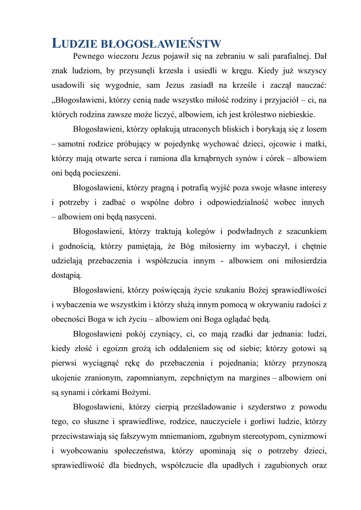LUDZIE BŁOGOSŁAWIEŃSTW Pewnego wieczoru Jezus pojawił się na zebraniu w sali parafialnej. Dał znak ludziom, by przysunęli krzesła i usiedli w kręgu. Kiedy już wszyscy usadowili się wygodnie, sam Jezus zasiadł na krześle i zaczął nauczać: „Błogosławieni, którzy cenią nade wszystko miłość rodziny i przyjaciół – ci, na których rodzina zawsze może liczyć, albowiem, ich jest królestwo niebieskie. Błogosławieni, którzy opłakują utraconych bliskich i borykają się z losem – samotni rodzice próbujący w pojedynkę wychować dzieci, ojcowie i matki, którzy mają otwarte serca i ramiona dla krnąbrnych synów i córek – albowiem oni będą pocieszeni. Błogosławieni, którzy pragną i potrafią wyjść poza swoje własne interesy i potrzeby i zadbać o wspólne dobro i odpowiedzialność wobec innych – albowiem oni będą nasyceni. Błogosławieni, którzy traktują kolegów i podwładnych z szacunkiem i godnością, którzy pamiętają, że Bóg miłosierny im wybaczył, i chętnie udzielają przebaczenia i współczucia innym - albowiem oni miłosierdzia dostąpią. Błogosławieni, którzy poświęcają życie szukaniu Bożej sprawiedliwości i wybaczenia we wszystkim i którzy służą innym pomocą w okrywaniu radości z obecności Boga w ich życiu – albowiem oni Boga oglądać będą. Błogosławieni pokój czyniący, ci, co mają rzadki dar jednania: ludzi, kiedy złość i egoizm grożą ich oddaleniem się od siebie; którzy gotowi są pierwsi wyciągnąć rękę do przebaczenia i pojednania; którzy przynoszą ukojenie zranionym, zapomnianym, zepchniętym na margines – albowiem oni są synami i córkami Bożymi. Błogosławieni, którzy cierpią prześladowanie i szyderstwo z powodu tego, co słuszne i sprawiedliwe, rodzice, nauczyciele i gorliwi ludzie, którzy przeciwstawiają się fałszywym mniemaniom, zgubnym stereotypom, cynizmowi i wyobcowaniu społeczeństwa, którzy upominają się o potrzeby dzieci, sprawiedliwość dla biednych, współczucie dla upadłych i zagubionych oraz pełne miłości wsparcie dla wykorzystywanych - albowiem ich jest królestwo Boże. Cieszcie się i radujcie – powiedział Jezus do zgromadzonych w sali parafialnej tamtego wieczoru – albowiem wasza nagroda wielka jest w niebie” (Tekst pochodzi z: Brian Cavanaugh TOR, Sto opowiadań rodzinnych, Wydawnictwo Księży Marianów, Warszawa 2001, s. 79n)