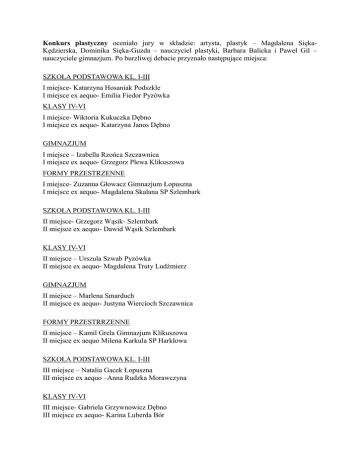 Konkurs plastyczny oceniało jury w składzie: artysta, plastyk – Magdalena SiękaKędzierska, Dominika Sięka-Guzda – nauczyciel plastyki, Barbara Balicka i Paweł Gil – nauczyciele gimnazjum. Po burzliwej debacie przyznało następujące miejsca: SZKOŁA PODSTAWOWA KL. I-III I miejsce- Katarzyna Hosaniak Podszkle I miejsce ex aequo- Emilia Fiedor Pyzówka KLASY IV-VI I miejsce- Wiktoria Kukuczka Dębno I miejsce ex aequo- Katarzyna Janos Dębno GIMNAZJUM I miejsce – Izabella Rzońca Szczawnica I miejsce ex aequo- Grzegorz Plewa Klikuszowa FORMY PRZESTRZENNE I miejsce- Zuzanna Głowacz Gimnazjum Łopuszna I miejsce ex aequo- Magdalena Skalana SP Szlembark SZKOŁA PODSTAWOWA KL. I-III II miejsce- Grzegorz Wąsik- Szlembark II miejsce ex aequo- Dawid Wąsik Szlembark KLASY IV-VI II miejsce – Urszula Szwab Pyzówka II miejsce ex aequo- Magdalena Truty Ludźmierz GIMNAZJUM II miejsce – Marlena Smarduch II miejsce ex aequo- Justyna Wiercioch Szczawnica FORMY PRZESTRRZENNE II miejsce – Kamil Grela Gimnazjum Klikuszowa II miejsce ex aequo Milena Karkula SP Harklowa SZKOŁA PODSTAWOWA KL. I-III III miejsce – Natalia Gacek Łopuszna III miejsce ex aequo –Anna Rudzka Morawczyna KLASY IV-VI III miejsce- Gabriela Grzywnowicz Dębno III miejsce ex aequo- Karina Luberda Bór GIMNAZJUM III miejsce – Joanna Balicka Ludźmierz III miejsce ex aequo- Klaudia Kwak, Magdalena Tylka, Kinga Długopolska Ludźmierz FORMY PRZESTRZENNE III miejsce – Anna Truty SPLudźmierz III miejsce ex aequo- Arkadiusz Knapczyk SP Szlembark SZKOŁA PODSTAWOWA KL. I-III WYRÓŻNIENIA: Gabriela Michalak -Morawczyna Julia Habas- Morawczyna Martyna Luberda -Bór Alicja Fudalewicz -Krauszów Patrycja Habas –Morawczyna KLASY IV-VI WYRÓŻNIENIA: Emilia Bury –Pyzówka Samanta Kwak – Krauszów Alicja Młyńska - Szlembark Maria Budz – Dębno WYRÓŻNIENIA: Barbara Błaszczyk Ludźmierz Patrycja Siuta, Kinga Dziubek, Basia Durek Ludźmierz Dominika Maślanka Klikuszowa Maria Mrożek Ludźmierz Patrycja Stefaniak Klikuszowa Klaudia Lipkowska - Ludźmierz Konkurs recytatorski przebiegał w czterech grupach: szkoły podstawowe kategoria literacka i gwarowa oraz gimnazja kategoria literacka i gwarowa. Recytatorów w kategorii gwarowej szkół podstawowych oceniało jury w składzie: przewodnicząca – Pani Józefa Kuchta, członkowie: Pani Ewa Iwulska, Pani Ewa Pietrzak, które przyznało następujące nagrody: I miejsce – Mieszko Winiarski Chochołów I miejsce – Julia Krupa Chochołów I miejsce – Gabriela Pakos Kiczory II miejsce – Mateusz Waksmundzki Ostrowsko II miejsce – Samanta Kwak Krauszów II miejsce – Wiktoria Górz Rogoźnik III miejsce – Patrycja Morawa Ludźmierz III miejsce – Dagmara Dulak Szlachtowa III miejsce – Małgorzata Ligas Stare Bystre Wyróżnienia: Natalia Jasica Kiczory Julia Zawada Łopuszna Maksymilian Myrda Morawczyna W kategorii literackiej szkół podstawowych jury w składzie: przewodnicząca Pani Wanda Szado-Kudasik, członkowie Pani Lucyna Haza i Pani Lucyna Czaja oceniło następująco: I miejsce – Marta Wyrostek Szlachtowa II miejsce – Julia Sulka SP nr 4 Nowy Targ II miejsce – Urszula Szwab Pyzówka III miejsce – Paulina Wróbel Obidowa Wyróżnienia: Paulina Gągola SP nr 4 Nowy Targ Kacper Kwiatkowski Klikuszowa Recytatorów z gimnazjów w kategorii gwarowej przesłuchiwało jury w składzie: przewodnicząca Pani Anna Mlekodaj, członkowie: Pan Roman Dzioboń, Pan Stanisław Chowaniec. W tej kategorii przyznano następujące nagrody: I miejsce – Aneta Rychtarczyk Czerwienne II miejsce – Maria Łukasz Krempachy III miejsce – Jakub Kamoń Ostrowsko III miejsce – Weronika Maciasz Łopuszna Wyróżnienia: Weronika Marciszewska Szczawnica Daria Szeliga Klikuszowa Marek Ciężobka Łopuszna W kategorii literackiej – gimnazja oceniało jury: przewodnicząca: Pani Maria Łaś, członkowie: Pani Maria Krupa, ks. Jerzy Filek. Wyróżniono: I miejsce – Dawid Łopata Krempachy II miejsce – Dawid Brynkus Klikuszowa III miejsce- Bożena Goleniowski Krempachy Wyróżnienia: Anna Nieć Szczawnica Konrad Strama Stare Bystre Nagrodę specjalną przyznał ks. Jerzy Filek - ludźmierski proboszcz – Ewelinie Bafia z Gimnazjum SPSK z Czerwiennego. Ewelina otrzymała pięknie ilustrowaną "Ludźmierską Biblię" z komentarzami św. Jana Pawła II. 2 marca odbył się także Szkolny Konkurs Wiedzy o Patronie dla klas pierwszych. I miejsce zajęła Martyna Cisoń, II miejsce – Marysia Mrożek i III miejsce – Kinga Dziubek. Wszystkim nagrodzonym gratulujemy. Dziękujemy uczestnikom konkursu, którzy włożyli trud w przygotowanie się do niego. Dziękujemy także nauczycielom, którzy przygotowali recytatorów i przyjechali na nasze święto.