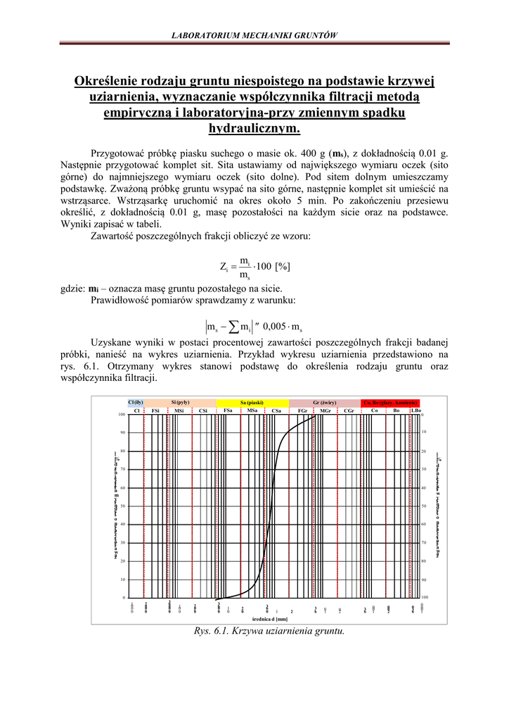 LABORATORIUM MECHANIKI GRUNTÓW Określenie rodzaju gruntu niespoistego na podstawie krzywej uziarnienia, wyznaczanie współczynnika filtracji metodą empiryczną i laboratoryjną-przy zmiennym spadku hydraulicznym. Przygotować próbkę piasku suchego o masie ok. 400 g (ms), z dokładnością 0.01 g. Następnie przygotować komplet sit. Sita ustawiamy od największego wymiaru oczek (sito górne) do najmniejszego wymiaru oczek (sito dolne). Pod sitem dolnym umieszczamy podstawkę. Zważoną próbkę gruntu wsypać na sito górne, następnie komplet sit umieścić na wstrząsarce. Wstrząsarkę uruchomić na okres około 5 min. Po zakończeniu przesiewu określić, z dokładnością 0.01 g, masę pozostałości na każdym sicie oraz na podstawce. Wyniki zapisać w tabeli. Zawartość poszczególnych frakcji obliczyć ze wzoru: mi ⋅ 100 [%] ms gdzie: mi – oznacza masę gruntu pozostałego na sicie. Prawidłowość pomiarów sprawdzamy z warunku: Zi = m s − ∑ m i ≤ 0,005 ⋅ m s Uzyskane wyniki w postaci procentowej zawartości poszczególnych frakcji badanej próbki, nanieść na wykres uziarnienia. Przykład wykresu uziarnienia przedstawiono na rys. 6.1. Otrzymany wykres stanowi podstawę do określenia rodzaju gruntu oraz współczynnika filtracji. Cl (iły) Si (pyły) Cl 100 FSi MSi FSa CSi Sa (piaski) MSa Gr (żwiry) CSa FGr MGr CGr Co, Bo (głazy, kamienie) Co Bo LBo 0 90 10 ] % [ d żi 70 n je zs je i 60 n m cyi n 50 ed śr o n 40 rea iz ćś ot 30 ra w az 80 20 20 80 10 90 30 40 50 60 70 100 0 1 0 .0 0 2 0 .0 0 3 6 0 .0 0 1 .0 0 2 .0 0 3 6 .0 0 .1 0 .2 0 3 .6 0 1 2 .3 6 0 1 0 2 średnica d [mm] Rys. 6.1. Krzywa uziarnienia gruntu. 3 6 0 0 1 0 0 2 0 3 6 0 0 0 1 ] % [ d żi n je sz k ęi w yc i n d er ś o en ra iz ćś tor a w az LABORATORIUM MECHANIKI GRUNTÓW Współczynnik wodoprzepuszczalności obliczyć stosując empiryczne wzory Krügera i Hazena. Wzór Krügera: 182 ⋅ 10 ⋅ n [m/dobę] 2 C 2 ⋅ (1 − n ) gdzie: n – porowatość gruntu liczona z zależności: ρ − ρd n= s dla ρ s = 2,65 [g/cm3] ρs C – współczynnik uwzględniający pole powierzchni cząstek gruntu zawartych w 1 cm3 obliczamy ze wzoru: 4 k10 = 3 60 × (1 − n ) dq dq – średnica miarodajna określana na podstawie krzywej uziarnienia za pomocą wzoru: C= a 1 1 =∑ i dq d i mm ai – zawartość poszczególnych frakcji wyrażona w postaci ułamka dziesiętnego, określona wagowo, di – średnia średnica cząstek w granicach poszczególnych przedziałów [mm]. Wzór Hazena: k10 = C ⋅ (d10 ) 2 [m/dobę] gdzie: d10 – średnica miarodajna, poniżej której zawartość ziaren wynosi 10% masy gruntu; [mm] C – współczynnik empiryczny zależny od porowatości C = 400 + 40 ⋅ (n − 26) gdzie: n – porowatość; [%] Wzór Hazena można stosować do gruntów niespoistych, w których uziarnienie spełnia następujące warunki: - średnica miarodajna: 0,1 mm ≤ d10 ≤ 3,0 mm - wskaźnik równoziarnistości: d 60 <5 d10 Porowatość gruntu „n” obliczyć na podstawie gęstości objętościowej szkieletu gruntowego ρd, wyznaczonej w badaniu laboratoryjnym współczynnika filtracji, dx – średnica miarodajna, poniżej której znajduje się w gruncie x % masy gruntu. U= LABORATORIUM MECHANIKI GRUNTÓW Wyznaczanie współczynnika filtracji gruntu na podstawie badań laboratoryjnych. Wyznaczanie współczynnika wodoprzepuszczalności metodą rurki Kamieńskiego (przy zmiennym spadku). Początkowy poziom wody Poziom wody po czasie t h1 h2 Poziom wody w dolnym zbiorniku l Próbka gruntu Do rurki o pomierzonej średnicy wsypać małymi porcjami suchy grunt zagęszczając go ubijakiem. Określić masę „ms” wsypanego gruntu oraz jego miąższość. Masa „ms” wsypanego gruntu stanowić będzie podstawę do określenia gęstości objętościowej szkieletu gruntowego „ρd” oraz do określenia porowatości „n”. Gęstość właściwą przyjąć „ρs” = 2.65 g/cm3.Grubość warstwy gruntu „l” powinna wynosić około 5÷10 cm. Do dolnego naczynia nalać wodę, w celu pełnego nasycenia gruntu pod wpływem kapilarnego podciągania. Do rurki wlewać ostrożnie od góry wodę, ustalając dokładnie jej pierwotny poziom (najlepiej na górnym poziomie podziałki). Od tego momentu można przystąpić do właściwego badania. Notować czas odpowiadający obniżeniu się poziomu wody w rurce. Należy wykonać kilka pomiarów, z których obliczamy wartość średnią. Współczynnik filtracji k obliczyć z wzoru: k = (l/∆t)×ln(h1/h2) gdzie: l– wysokość próbki gruntu (cm), h1– początkowa wysokość słupa wody (mierzona od poziomu wody w dolnym zbiorniku) ∆t– czas obniżenia się słupa wody z h1 do h2 h2– końcowa wysokość słupa wody (mierzona od poziomu wody w dolnym zbiorniku) Otrzymaną wartość współczynnika filtracji przeliczyć dla temperatury T wody równej 10°C (k10), według poniższego wzoru; kt k 10 = 0,7 + 0,03 ⋅ T LABORATORIUM MECHANIKI GRUNTÓW Wyznaczanie współczynnika filtracji przy stałym spadku hydraulicznym W badaniach laboratoryjnych należy pomierzyć wydatek wody o temperaturze T przepływającej przez pole przekroju gruntu A w czasie t przy spadku hydraulicznym i. Należy zmierzyć średnicę cylindra przeznaczonego do wypełnienia gruntem. Następnie układamy w cylindrze uprzednio przygotowany suchy grunt o znanej masie. Grubość warstwy gruntu mierzymy suwmiarką, w ten sposób, że w pierwszej kolejności dokonujemy pomiaru odległości pomiędzy górną krawędzią cylindra, a górnym sitkiem, ułożonym na dnie cylindra, bez gruntu. Następnie po ułożeniu gruntu i przykryciu go górnym sitkiem, pomierzyć ponownie odległość pomiędzy górną krawędzią cylindra, a sitkiem. Różnica pomierzonych odległości stanowi wysokość próbki gruntu „l”. Cylinder umieścić w aparacie, obciążając górne sitko odważnikiem. Zewnętrzną komorę aparatu wypełnić wodą. Po ustabilizowaniu się zwierciadła wody w dw