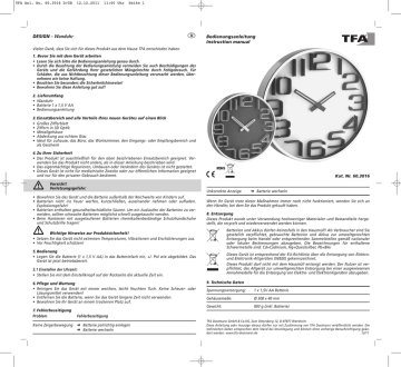 TFA Anl. No. 60.3016 D/GB 12.12.2011 11:00 Uhr Seite 1 DESIGN – Wanduhr Bedienungsanleitung Instruction manual Vielen Dank, dass Sie sich für dieses Produkt aus dem Hause TFA entschieden haben. 1. Bevor Sie mit dem Gerät arbeiten • Lesen Sie sich bitte die Bedienungsanleitung genau durch. • Durch die Beachtung der Bedienungsanleitung vermeiden Sie auch Beschädigungen des Geräts und die Gefährdung Ihrer gesetzlichen Mängelrechte durch Fehlgebrauch. Für Schäden, die aus Nichtbeachtung dieser Bedienungsanleitung verursacht werden, übernehmen wir keine Haftung. • Beachten Sie besonders die Sicherheitshinweise! • Bewahren Sie diese Anleitung gut auf! 2. Lieferumfang • Wanduhr • Batterie 1 x 1,5 V AA • Bedienungsanleitung 3. Einsatzbereich und alle Vorteile Ihres neuen Gerätes auf einen Blick • Großes Zifferblatt • Ziffern in 3D Optik • Metallgehäuse • Abdeckung aus echtem Glas • Ideal für zuhause, das Büro, das Wartezimmer, den Eingangs- oder Empfangsbereich und als Geschenk 4. Zu Ihrer Sicherheit • Das Produkt ist ausschließlich für den oben beschriebenen Einsatzbereich geeignet. Verwenden Sie das Produkt nicht anders, als in dieser Anleitung beschrieben wird. • Das eigenmächtige Reparieren, Umbauen oder Verändern des Gerätes ist nicht gestattet. • Dieses Gerät ist nicht für medizinische Zwecke oder zur öffentlichen Information geeignet und nur für den privaten Gebrauch bestimmt. Vorsicht! Verletzungsgefahr: • Bewahren Sie das Gerät und die Batterie außerhalb der Reichweite von Kindern auf. • Batterien nicht ins Feuer werfen, kurzschließen, auseinander nehmen oder aufladen. Explosionsgefahr! • Batterien enthalten gesundheitsschädliche Säuren. Um ein Auslaufen der Batterien zu vermeiden, sollten schwache Batterien möglichst schnell ausgetauscht werden. • Beim Hantieren mit ausgelaufenen Batterien chemikalienbeständige Schutzhandschuhe und Schutzbrille tragen! ROHS Kat. Nr. 60.3016 Unkorrekte Anzeige Wenn Ihr Gerät trotz dieser Maßnahmen immer noch nicht funktioniert, wenden Sie sich an den Händler, bei dem Sie das Produkt gekauft haben. 8. Entsorgung Dieses Produkt wurde unter Verwendung hochwertiger Materialen und Bestandteile hergestellt, die recycelt und wiederverwendet werden können. Batterien und Akkus dürfen keinesfalls in den Hausmüll! Als Verbraucher sind Sie gesetzlich verpflichtet, gebrauchte Batterien und Akkus zur umweltgerechten Entsorgung beim Handel oder entsprechenden Sammelstellen gemäß nationaler oder lokaler Bestimmungen abzugeben. Die Bezeichnungen für enthaltene Schwermetalle sind: Cd=Cadmium, Hg=Quecksilber, Pb=Blei Wichtige Hinweise zur Produktsicherheit! • Setzen Sie das Gerät nicht extremen Temperaturen, Vibrationen und Erschütterungen aus. • Vor Feuchtigkeit schützen! 5. Bedienung • Legen Sie die Batterie (1 x 1,5 V AA) in das Batteriefach ein, +/- Pol wie abgebildet. Das Gerät ist jetzt betriebsbereit. Dieses Gerät ist entsprechend der EU-Richtlinie über die Entsorgung von Elektround Elektronik-Altgeräten (WEEE) gekennzeichnet. Dieses Produkt darf nicht mit dem Hausmüll entsorgt werden. Der Nutzer ist verpflichtet, das Altgerät zur umweltgerechten Entsorgung bei einer ausgewiesenen Annahmestelle für die Entsorgung von Elektro- und Elektronikgeräten abzugeben. 5.1 Einstellen der Uhrzeit: • Stellen Sie mit dem Einstellknopf auf der Rückseite die aktuelle Zeit ein. 6. Pflege und Wartung • Reinigen Sie das Gerät mit einem weichen, leicht feuchten Tuch. Keine Scheuer- oder Lösungsmittel verwenden! • Entfernen Sie die Batterie, wenn Sie das Gerät längere Zeit nicht verwenden. • Bewahren Sie Ihr Gerät an einem trockenen Platz auf. 7. Fehlerbeseitigung Problem Keine Zeigerbewegung ➜ Batterie wechseln 9. Technische Daten Spannungsversorgung: 1 x 1,5V AA Batterie Gehäusemaße: Ø 300 x 40 mm Gewicht: 893 g (inkl. Batterie) Fehlerbeseitigung ➜ Batterie polrichtig einlegen ➜ Batterie wechseln TFA Dostmann GmbH & Co.KG, Zum Ottersberg 12, D-97877 Wertheim. Diese Anleitung oder Auszüge daraus dürfen nur mit Zustimmung von TFA Dostmann veröffentlicht werden. Die technischen Daten entsprechen dem Stand bei Drucklegung und können ohne vorherige Benachrichtigung geändert werden. www.tfa-dostmann.de 12/11 TFA Anl. No. 60.3016 D/GB 12.12.2011 11:00 Uhr Seite 2 DESIGN – Wall Clock Bedienungsanleitung Instruction manual Thank you for choosing this instrument from TFA. 1. Before you use it • Please be sure to read the instruction manual carefully. • Following the instruction manual for use will prevent damage to the device and loss of your statutory rights arising from defects due to incorrect use. We shall not be liable for any damage occurring as a result of not following these instructions. • Please take particular note of the safety advice! • Please look after this manual for future reference. 2. Scope of supply • Wall clock • Battery 1 x 1.5 V AA • Instruction manual 3. Field of operation and all of the benefits of your new clock at a glance • Large dial • Numbers in 3D look • Frame made of metal • Cover made of real glass • Ideal for home, office, waiting room, lobby or entrance hall and as a gift 4. For your safety • The product is exclusively intended for the field of application described above. The product should only be used as described within these instructions. • Unauthorised repairs, modifications or changes to the product are prohibited. • The product is not be used for medical purpose or for public information, but is intended only for home use. Kat. Nr. 60.3016 • Keep this instrument and the battery out of reach of children. • Batteries must not be thrown into the fire, short-circuited, taken apart or recharged. Risk of explosion! • Batteries contain harmful acids. Low batteries should be changed as soon as possible to prevent damage caused by a leaking battery. • Wear chemical-resistant protective gloves and gl