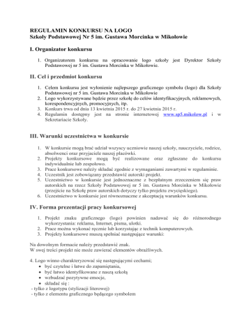 REGULAMIN KONKURSU NA LOGO Szkoły Podstawowej Nr 5 im. Gustawa Morcinka w Mikołowie I. Organizator konkursu 1. Organizatorem konkursu na opracowanie logo szkoły jest Dyrektor Szkoły Podstawowej nr 5 im. Gustawa Morcinka w Mikołowie. II. Cel i przedmiot konkursu 1. Celem konkursu jest wyłonienie najlepszego graficznego symbolu (logo) dla Szkoły Podstawowej nr 5 im. Gustawa Morcinka w Mikołowie 2. Logo wykorzystywane będzie przez szkołę do celów identyfikacyjnych, reklamowych, korespondencyjnych, promocyjnych, itp. 3. Konkurs trwa od dnia 13 kwietnia 2015 r. do 27 kwietnia 2015 r. 4. Regulamin dostępny jest na stronie internetowej www.sp5.mikolow.pl i w Sekretariacie Szkoły. III. Warunki uczestnictwa w konkursie 1. W konkursie mogą brać udział wszyscy uczniowie naszej szkoły, nauczyciele, rodzice, absolwenci oraz przyjaciele naszej placówki. 2. Projekty konkursowe mogą być realizowane oraz zgłaszane do konkursu indywidualnie lub zespołowo. 3. Prace konkursowe należy składać zgodnie z wymaganiami zawartymi w regulaminie. 4. Uczestnik jest zobowiązany przedstawić autorski projekt. 5. Uczestnictwo w konkursie jest jednoznaczne z bezpłatnym zrzeczeniem się praw autorskich na rzecz Szkoły Podstawowej nr 5 im. Gustawa Morcinka w Mikołowie (przejście na Szkołę praw autorskich dotyczy tylko projektu zwycięskiego). 6. Uczestnictwo w konkursie jest równoznaczne z akceptacją warunków konkursu. IV. Forma prezentacji pracy konkursowej 1. Projekt znaku graficznego (logo) powinien nadawać się do różnorodnego wykorzystania: reklama, Internet, pisma, ulotki. 2. Prace można wykonać ręcznie lub korzystając z technik komputerowych. 3. Projekty konkursowe muszą spełniać następujące warunki: Na dowolnym formacie należy przedstawić znak. W swej treści projekt nie może zawierać elementów obraźliwych. 4. Logo winno charakteryzować się następującymi cechami; • być czytelne i łatwe do zapamiętania, • być łatwo identyfikowane z naszą szkołą • wzbudzać pozytywne emocje, • składać się : - tylko z logotypu (stylizacji literowej) - tylko z elementu graficznego będącego symbolem - lub też zawierać połączenie obu tych elementów. 5. Logo nie powinno być skomplikowane pod względem graficznym i kolorystycznym. 6. Prace należy składać podając: - imię i nazwisko, (w przypadku uczniów SP5 - klasę) - klasę, - płytę z nagraną pracą, jeżeli jest ona wykonana techniką komputerową - oświadczenie o akceptacji zapisów Regulaminu Konkursu V. Miejsce i termin składania prac konkursowych 1. Prace należy składać do dnia 27.04.2015 r. do p. Katarzyny Adamczak-Wędzichy w sali nr 11 lub w Sekretariacie Szkoły. 2. Prace konkursowe, niespełniające wymagań, o których mowa w regulaminie konkursu, nie będą podlegały ocenie Komisji Konkursowej. 3. Prace dostarczone po terminie nie będą oceniane. 4. Organizator nie zwraca złożonych prac. VI. Kryteria oceny prac konkursowych Projekty oceniane będą zgodnie z następującymi kryteriami: 1) zgodność projektu z danymi naszej szkoły, 2) oryginalność znaku, łatwość zapamiętywania, 3) czytelność i funkcjonalność projektu, 4) estetyka wykonania projektu. VII. Ocena prac konkursowych Zwycięskie prace zostaną wybrane przez Komisję Konkursową, w składzie: 1. Dyrektor szkoły 2. Przedstawiciel Rady Rodziców 3. Przedstawiciel Samorządu Uczniowskiego 4. Przedstawiciel Rady Pedagogicznej w/w osoby nie mogą być uczestnikami konkursu oraz mieć z nimi powiązań rodzinnych VIII. Rozstrzygnięcie konkursu 1. W wyniku postępowania konkursowego Komisja Konkursowa wyłania zwycięzcę konkursu. 2. Organizatorzy zastrzegają sobie prawo do dopracowania lub zmodyfikowania zwycięskiego projektu oraz do nierozstrzygnięcia konkursu. 3. Dla zwycięzców przewidziane są nagrody. 4. Planowana data ogłoszenia wyników 30.04.2015 r. 5. Wyniki zostaną zamieszczone na stronie szkoły www.sp5.mikolow.pl
