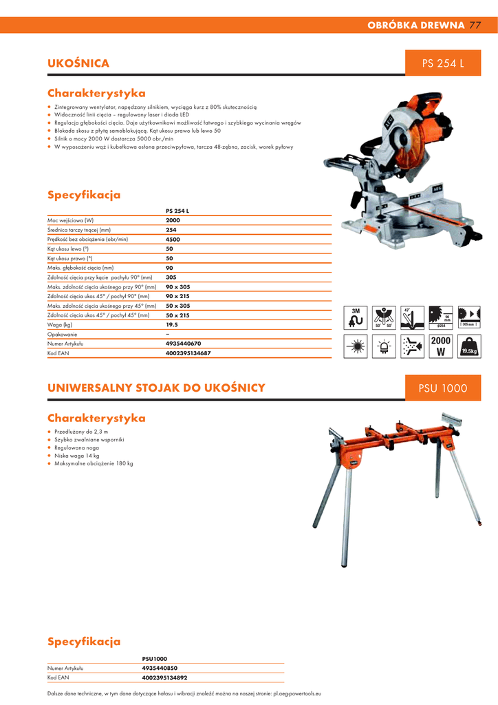 OBRÓBKA DREWNA 77 UKOŚNICA PS 254 L Charakterystyka zZintegrowany wentylator, napędzany silnikiem, wyciąga kurz z 80% skutecznością linii cięcia – regulowany laser i dioda LED zRegulacja głębokości cięcia. Daje użytkownikowi możliwość łatwego i szybkiego wycinania wręgów zBlokada skosu z płytą samoblokującą. Kąt ukosu prawo lub lewo 50 zSilnik o mocy 2000 W dostarcza 5000 obr./min zW wyposażeniu wąż i kubełkowa osłona przeciwpyłowa, tarcza 48-zębna, zacisk, worek pyłowy zWidoczność Specyfikacja PS 254 L Moc wejściowa (W) 2000 Średnica tarczy tnącej (mm) 254 Prędkość bez obciążenia (obr/min) 4500 Kąt ukosu lewo (°) 50 Kąt ukosu prawo (°) 50 Maks. głębokość cięcia (mm) 90 Zdolność cięcia przy kącie pochyłu 90° (mm) 305 Maks. zdolność cięcia ukośnego przy 90° (mm) 90 x 305 Zdolność cięcia ukos 45° / pochył 90° (mm) 90 x 215 Maks. zdolność cięcia ukośnego przy 45° (mm) 50 x 305 Zdolność cięcia ukos 45° / pochył 45° (mm) 50 x 215 Waga (kg) 19.5 Opakowanie − Numer Artykułu 4935440670 Kod EAN 4002395134687 UNIWERSALNY STOJAK DO UKOŚNICY Charakterystyka zPrzedlużany do 2,3 m zwalniane wsporniki zRegulowana noga zNiska waga 14 kg zMaksymalne obciążenie 180 kg zSzybko Specyfikacja PSU1000 Numer Artykułu 4935440850 Kod EAN 4002395134892 Dalsze dane techniczne, w tym dane dotyczące hałasu i wibracji znaleźć można na naszej stronie: pl.aeg-powertools.eu 90 50 50 254 305 19 PSU 1000