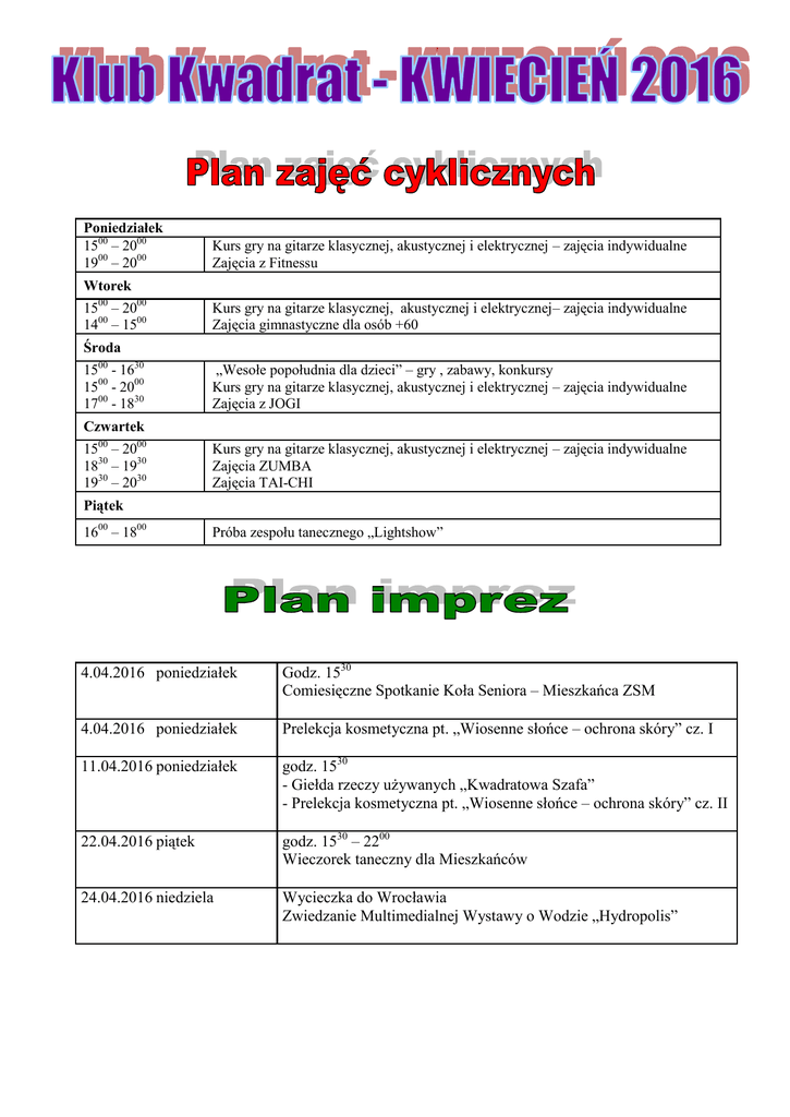 Poniedziałek 1500 – 2000 1900 – 2000 Kurs gry na gitarze klasycznej, akustycznej i elektrycznej – zajęcia indywidualne Zajęcia z Fitnessu Wtorek 1500 – 2000 1400 – 1500 Kurs gry na gitarze klasycznej, akustycznej i elektrycznej– zajęcia indywidualne Zajęcia gimnastyczne dla osób +60 Środa 1500 - 1630 1500 - 2000 1700 - 1830 „Wesołe popołudnia dla dzieci” – gry , zabawy, konkursy Kurs gry na gitarze klasycznej, akustycznej i elektrycznej – zajęcia indywidualne Zajęcia z JOGI Czwartek 1500 – 2000 1830 – 1930 1930 – 2030 Kurs gry na gitarze klasycznej, akustycznej i elektrycznej – zajęcia indywidualne Zajęcia ZUMBA Zajęcia TAI-CHI Piątek 1600 – 1800 Próba zespołu tanecznego „Lightshow” 4.04.2016 poniedziałek Godz. 1530 Comiesięczne Spotkanie Koła Seniora – Mieszkańca ZSM 4.04.2016 poniedziałek Prelekcja kosmetyczna pt. „Wiosenne słońce – ochrona skóry” cz. I 11.04.2016 poniedziałek godz. 1530 - Giełda rzeczy używanych „Kwadratowa Szafa” - Prelekcja kosmetyczna pt. „Wiosenne słońce – ochrona skóry” cz. II 22.04.2016 piątek godz. 1530 – 2200 Wieczorek taneczny dla Mieszkańców 24.04.2016 niedziela Wycieczka do Wrocławia Zwiedzanie Multimedialnej Wystawy o Wodzie „Hydropolis”