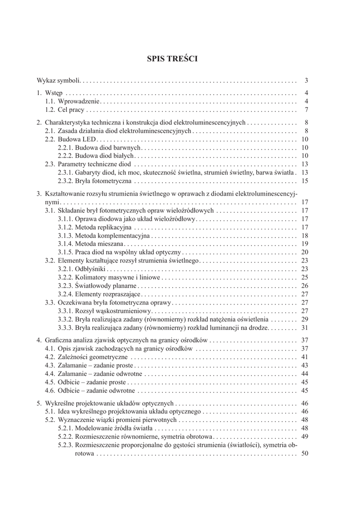 SPIS TREŚCI Wykaz symboli. . . . . . . . . . . . . . . . . . . . . . . . . . . . . . . . . . . . . . . . . . . . . . . . . . . . . . . . . . . . . . . . 3 1. Wstęp . . . . . . . . . . . . . . . . . . . . . . . . . . . . . . . . . . . . . . . . . . . . . . . . . . . . . . . . . . . . . . . . . . . . 1.1. Wprowadzenie. . . . . . . . . . . . . . . . . . . . . . . . . . . . . . . . . . . . . . . . . . . . . . . . . . . . . . . . . . 1.2. Cel pracy . . . . . . . . . . . . . . . . . . . . . . . . . . . . . . . . . . . . . . . . . . . . . . . . . . . . . . . . . . . . . . 4 4 7 2. Charakterystyka techniczna i konstrukcja diod elektroluminescencyjnych . . . . . . . . . . . . . . . 2.1. Zasada działania diod elektroluminescencyjnych . . . . . . . . . . . . . . . . . . . . . . . . . . . . . . . 2.2. Budowa LED . . . . . . . . . . . . . . . . . . . . . . . . . . . . . . . . . . . . . . . . . . . . . . . . . . . . . . . . . . . 2.2.1. Budowa diod barwnych. . . . . . . . . . . . . . . . . . . . . . . . . . . . . . . . . . . . . . . . . . . . . . 2.2.2. Budowa diod białych. . . . . . . . . . . . . . . . . . . . . . . . . . . . . . . . . . . . . . . . . . . . . . . . 2.3. Parametry techniczne diod . . . . . . . . . . . . . . . . . . . . . . . . . . . . . . . . . . . . . . . . . . . . . . . . 2.3.1. Gabaryty diod, ich moc, skuteczność świetlna, strumień świetlny, barwa światła . 2.3.2. Bryła fotometryczna . . . . . . . . . . . . . . . . . . . . . . . . . . . . . . . . . . . . . . . . . . . . . . . . 8 8 10 10 10 13 13 15 3. Kształtowanie rozsyłu strumienia świetlnego w oprawach z diodami elektroluminescencyjnymi. . . . . . . . . . . . . . . . . . . . . . . . . . . . . . . . . . . . . . . . . . . . . . . . . . . . . . . . . . . . . . . . . . . 3.1. Składanie brył fotometrycznych opraw wieloźródłowych . . . . . . . . . . . . . . . . . . . . . . . . 3.1.1. Oprawa diodowa jako układ wieloźródłowy. . . . . . . . . . . . . . . . . . . . . . . . . . . . . . 3.1.2. Metoda replikacyjna . . . . . . . . . . . . . . . . . . . . . . . . . . . . . . . . . . . . . . . . . . . . . . . . 3.1.3. Metoda komplementacyjna . . . . . . . . . . . . . . . . . . . . . . . . . . . . . . . . . . . . . . . . . . . 3.1.4. Metoda mieszana . . . . . . . . . . . . . . . . . . . . . . . . . . . . . . . . . . . . . . . . . . . . . . . . . . . 3.1.5. Praca diod na wspólny układ optyczny . . . . . . . . . . . . . . . . . . . . . . . . . . . . . . . . . . 3.2. Elementy kształtujące rozsył strumienia świetlnego. . . . . . . . . . . . . . . . . . . . . . . . . . . . . 3.2.1. Odbłyśniki . . . . . . . . . . . . . . . . . . . . . . . . . . . . . . . . . . . . . . . . . . . . . . . . . . . . . . . . 3.2.2. Kolimatory masywne i liniowe . . . . . . . . . . . . . . . . . . . . . . . . . . . . . . . . . . . . . . . . 3.2.3. Światłowody planarne . . . . . . . . . . . . . . . . . . . . . . . . . . . . . . . . . . . . . . . . . . . . . . . 3.2.4. Elementy rozpraszające . . . . . . . . . . . . . . . . . . . . . . . . . . . . . . . . . . . . . . . . . . . . . . 3.3. Oczekiwana bryła fotometryczna oprawy . . . . . . . . . . . . . . . . . . . . . . . . . . . . . . . . . . . . . 3.3.1. Rozsył wąskostrumieniowy. . . . . . . . . . . . . . . . . . . . . . . . . . . . . . . . . . . . . . . . . . . 3.3.2. Bryła realizująca zadany (równomierny) rozkład natężenia oświetlenia . . . . . . . . 3.3.3. Bryła realizująca zadany (równomierny) rozkład luminancji na drodze. . . . . . . . . 17 17 17 17 18 19 20 23 23 25 26 27 27 27 29 31 4. Graficzna analiza zjawisk optycznych na granicy ośrodków . . . . . . . . . . . . . . . . . . . . . . . . . . 4.1. Opis zjawisk zachodzących na granicy ośrodków . . . . . . . . . . . . . . . . . . . . . . . . . . . . . . 4.2. Zależności geometryczne . . . . . . . . . . . . . . . . . . . . . . . . . . . . . . . . . . . . . . . . . . . . . . . . . 4.3. Załamanie – zadanie proste . . . . . . . . . . . . . . . . . . . . . . . . . . . . . . . . . . . . . . . . . . . . . . . . 4.4. Załamanie – zadanie odwrotne . . . . . . . . . . . . . . . . . . . . . . . . . . . . . . . . . . . . . . . . . . . . . 4.5. Odbicie – zadanie proste . . . . . . . . . . . . . . . . . . . . . . . . . . . . . . . . . . . . . . . . . . . . . . . . . . 4.6. Odbicie – zadanie odwrotne . . . . . . . . . . . . . . . . . . . . . . . . . . . . . . . . . . . . . . . . . . . . . . . 37 37 41 43 44 45 45 5. Wykreślne projektowanie układów optycznych . . . . . . . . . . . . . . . . . . . . . . . . . . . . . . . . . . . . 5.1. Idea wykreślnego projektowania układu optycznego . . . . . . . . . . . . . . . . . . . . . . . . . . . . 5.2. Wyznaczenie wiązki promieni pierwotnych . . . . . . . . . . . . . . . . . . . . . . . . . . . . . . . . . . . 5.2.1. Modelowanie źródła światła . . . . . . . . . . . . . . . . . . . . . . . . . . . . . . . . . . . . . . . . . . 5.2.2. Rozmieszczenie równomierne, symetria obrotowa. . . . . . . . . . . . . . . . . . . . . . . . . 5.2.3. Rozmieszczenie proporcjonalne do gęstości strumienia (światłości), symetria obrotowa . . . . . . . . . . . . . . . . . . . . . . . . . . . . . . . . . . . . . . . . . . . . . . . . . . . . . . . . . . . 46 46 48 48 49 50 102 Spis treści 5.2.4. Rozmieszczenie równomierne, dwie płaszczyzny symetrii . . . . . . . . . . . . . . . . . . 5.2.5. Rozmieszczenie proporcjonalne do gęstości strumienia, dwie płaszczyzny symetrii . . . . . . . . . . . . . . . . . . . . . . . . . . . . . . . . . . . . . . . . . . . . . . . . . . . . . . . . . . . . . . Wyznaczenie i przypisanie promieni wyjściowych do promieni pierwotnych . . . . . . . . Wyznaczenie powierzchni wejściowej i wiązki promieni wtórnych. . . . . . . . . . . . . . . . . Wyznaczenie kształtu układu optycznego . . . . . . . . . . . . . . . . . . . . . . . . . . . . . . . . . . . . . Przykładowy projekt układu optycznego oprawy oświetlenia drogowego ze źródłem LED . . . . . . .