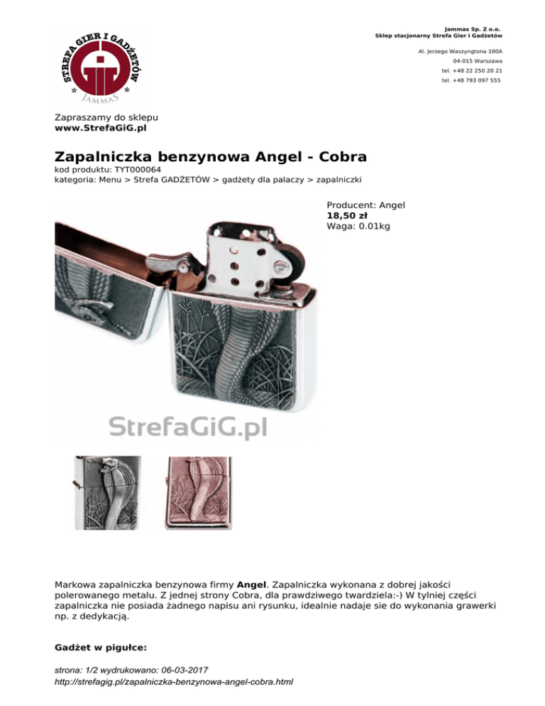 Jammas Sp. Z o.o. Sklep stacjonarny Strefa Gier i Gadżetów Al. Jerzego Waszyngtona 100A 04-015 Warszawa tel. +48 22 250 20 21 tel. +48 793 097 555 Zapraszamy do sklepu www.StrefaGiG.pl Zapalniczka benzynowa Angel - Cobra kod produktu: TYT000064 kategoria: Menu > Strefa GADŻETÓW > gadżety dla palaczy > zapalniczki Producent: Angel 18,50 zł Waga: 0.01kg Markowa zapalniczka benzynowa firmy Angel. Zapalniczka wykonana z dobrej jakości polerowanego metalu. Z jednej strony Cobra, dla prawdziwego twardziela:-) W tylniej części zapalniczka nie posiada żadnego napisu ani rysunku, idealnie nadaje sie do wykonania grawerki np. z dedykacją. Gadżet w pigułce: strona: 1/2 wydrukowano: 06-03-2017 http://strefagig.pl/zapalniczka-benzynowa-angel-cobra.html Marka: Angel Typ: Zapalniczka benzynowa Zasilanie: Benzyna Wymiary zapalniczki: 59 x 40 z 18 mm Zapalniczka sprzedawana jest w postaci suchej (bez benzyny) dzięki czemu masz pewność, ze nigdy wcześniej nie była używana. W zestawie nie ma gazu do uzupełnienia. strona: 2/2 wydrukowano: 06-03-2017 http://strefagig.pl/zapalniczka-benzynowa-angel-cobra.html