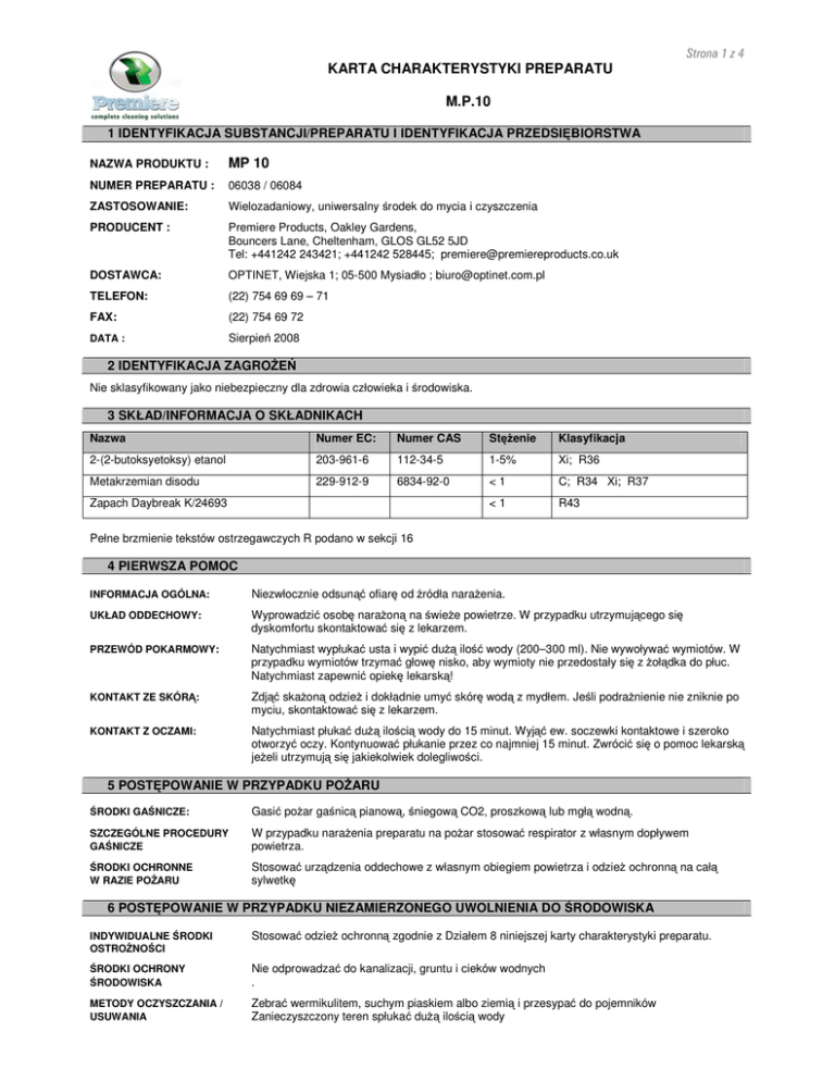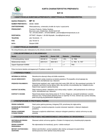 Strona 1 z 4 KARTA CHARAKTERYSTYKI PREPARATU M.P.10 1 IDENTYFIKACJA SUBSTANCJI/PREPARATU I IDENTYFIKACJA PRZEDSIĘBIORSTWA NAZWA PRODUKTU : MP 10 NUMER PREPARATU : 06038 / 06084 ZASTOSOWANIE: Wielozadaniowy, uniwersalny środek do mycia i czyszczenia PRODUCENT : Premiere Products, Oakley Gardens, Bouncers Lane, Cheltenham, GLOS GL52 5JD Tel: +441242 243421; +441242 528445; [email protected] DOSTAWCA: OPTINET, Wiejska 1; 05-500 Mysiadło ; [email protected] TELEFON: (22) 754 69 69 – 71 FAX: (22) 754 69 72 DATA : Sierpień 2008 2 IDENTYFIKACJA ZAGROŻEŃ Nie sklasyfikowany jako niebezpieczny dla zdrowia człowieka i środowiska. 3 SKŁAD/INFORMACJA O SKŁADNIKACH Nazwa Numer EC: Numer CAS Stężenie Klasyfikacja 2-(2-butoksyetoksy) etanol 203-961-6 112-34-5 1-5% Xi; R36 Metakrzemian disodu 229-912-9 6834-92-0 <1 C; R34 Xi; R37 <1 R43 Zapach Daybreak K/24693 Pełne brzmienie tekstów ostrzegawczych R podano w sekcji 16 4 PIERWSZA POMOC INFORMACJA OGÓLNA: Niezwłocznie odsunąć ofiarę od źródła narażenia. UKŁAD ODDECHOWY: Wyprowadzić osobę narażoną na świeże powietrze. W przypadku utrzymującego się dyskomfortu skontaktować się z lekarzem. PRZEWÓD POKARMOWY: Natychmiast wypłukać usta i wypić dużą ilość wody (200–300 ml). Nie wywoływać wymiotów. W przypadku wymiotów trzymać głowę nisko, aby wymioty nie przedostały się z żołądka do płuc. Natychmiast zapewnić opiekę lekarską! KONTAKT ZE SKÓRĄ: Zdjąć skażoną odzież i dokładnie umyć skórę wodą z mydłem. Jeśli podrażnienie nie zniknie po myciu, skontaktować się z lekarzem. KONTAKT Z OCZAMI: Natychmiast płukać dużą ilością wody do 15 minut. Wyjąć ew. soczewki kontaktowe i szeroko otworzyć oczy. Kontynuować płukanie przez co najmniej 15 minut. Zwrócić się o pomoc lekarską jeżeli utrzymują się jakiekolwiek dolegliwości. 5 POSTĘPOWANIE W PRZYPADKU POŻARU ŚRODKI GAŚNICZE: Gasić pożar gaśnicą pianową, śniegową CO2, proszkową lub mgłą wodną. SZCZEGÓLNE PROCEDURY GAŚNICZE W przypadku narażenia preparatu na pożar stosować respirator z własnym dopływem powietrza. ŚRODKI OCHRONNE W RAZIE POŻARU Stosować urządzenia oddechowe z własnym obiegiem powietrza i odzież ochronną na całą sylwetkę 6 POSTĘPOWANIE W PRZYPADKU NIEZAMIERZONEGO UWOLNIENIA DO ŚRODOWISKA INDYWIDUALNE ŚRODKI OSTROŻNOŚCI Stosować odzież ochronną zgodnie z Działem 8 niniejszej karty charakterystyki preparatu. ŚRODKI OCHRONY ŚRODOWISKA Nie odprowadzać do kanalizacji, gruntu i cieków wodnych . METODY OCZYSZCZANIA / USUWANIA Zebrać wermikulitem, suchym piaskiem albo ziemią i przesypać do pojemników Zanieczyszczony teren spłukać dużą ilością wody Strona 2 z 4 M.P.10 7 POSTĘPOWANIE Z PREPARATEM I JEGO MAGAZYNOWANIE POSTĘPOWANIE: Unikać rozlania / rozsypania i kontaktu ze skórą i oczami. Stosować się do zaleceń producenta. MAGAZYNOWANIE: Przechowywać w szczelnie zamkniętym oryginalnym opakowaniu w suchym i chłodnym miejscu. KLASA SKŁADOWANIA Magazyn substancji chemicznych. 8 KONTROLA NARAŻENIA I SRODKI OCHRONY INDYWIDUALNEJ WYPOSAŻENIE OCHRONNE OCHRONA DRÓG ODDECHOWYCH: Nie ma szczególnych zaleceń, ale w przypadku poziomu przekraczającego najwyższe dopuszczalne stężenia i natężenia w środowisku pracy musi być stosowany sprzęt oddechowy. OCHRONA RĄK: Zaleca się stosowanie rękawic z kauczuku lub PCV. OCHRONA OCZU: W celu zabezpieczenia przed jakimkolwiek ryzykiem kontaktu z oczami stosować okulary ochronne. 9 WŁAŚCIWOŚCI FIZYKOCHEMICZNE POSTAĆ FIZYCZNA Przejrzysty płyn KOLOR Niebieski ZAPACH Rozpuszczalnik, zapach perfumowany GĘSTOŚĆ: 1.020 kg/l przy 20 C ROZPUSZCZALNOŚĆ : Rozpuszcza się w wodzie. TEMPERATURA ZAPŁONU (°C) >55 (tygiel zamknięty). o WARTOŚĆ pH, ROZTWÓR STĘŻONY 12,0 LEPKOŚĆ <10 cps przy 20oC WSPÓŁCZYNNIK ZAŁAMANIA 10% 10 STABILNOŚĆ I REAKTYWNOŚĆ STABILNOŚĆ Stabilny w normalnych warunkach temperaturowych i stosowania zgodnie z zaleceniami. UNIKAĆ WARUNKÓW Unikać kontaktu z kwasami. UNIKAĆ MATERIAŁÓW Mocne kwasy. NIEBEZPIECZNE PRODUKTY ROZPADU Żadne niebezpieczne produkty rozkładu nie są znane . 11 INFORMACJE TOKSYKOLOGICZNE INFORMACJE TOKSYKOLOGICZNE: Patrz Dział 2 INNE SKUTKI Z DROWOTNE: Połknięcie może powodować podrażnienie przewodu żołądkowo-jelitowego 12 INFORMACJE EKOLOGICZNE ZAGROŻENIA DLA ŚRODOWISKA: Preparat nie jest uważany za niebezpieczny dla środowiska. BIOAKUMULACJA Bioakumulacja nie występuje. ROZKŁADALNOŚĆ Ulega biodegradacji. 13 POSTĘPOWANIE Z ODPADAMI SPOSÓB USUWANIA : Rozlany preparat i odpady usuwać zgodnie z uzgodnieniami ze stosownymi lokalnymi organami władzy. Pozostałości mogą zostać usunięte przy użyciu dużej ilości wody. Puste opakowanie po umyciu może być powtórnie użyte lub przeznaczone do recyklingu. KOD ODPADU : 20 01 15 - alkalia Strona 3 z 4 M.P.10 14 INFORMACJE O TRANSPORCIE INFORMACJE OGÓLNE: Nie sklasyfikowano pod względem transportu. 15 INFORMACJE DOTYSZACE PRZEPISÓW PRAWNYCH ZWROTY OSTRZEGAWCZE : NC Nie sklasyfikowane jako niebezpieczny. ZWROTY BEZPIECZEŃSTWA : S2 Chronić przed dziećmi. P13 Karta charakterystyki dostępna na żądanie użytkownika prowadzącego działalność zawodową. P14 Zawiera zapach Daybreak K/24693. Może powodować wystąpienie reakcji alergicznej S45 W przypadku awarii i złego samopoczucia niezwłocznie zasięgnąć porady lekarza pokazując etykietę. DYREKTYWY EC: Dyrektywa w sprawie karty charakterystyki, dyrektywa 91/155/EEC w postaci dyrektywy 2001/58/EC (z 27 lipca 2001) Dyrektywa Rady o niebezpiecznych preparatach chemicznych 1999/45/EG. INSTRUMENTY USTAWOWE: Przepisy dot. Substancji chemicznych (Pakowanie i Informacje o Zagrożeniach) ZATWIERDZONE ZASADY POSTĘPOWANIA: Zbiór kart charakterystyki L130. WYTYCZNE: Wielkości Normatywne Czynników Narażenia Zawodowego EH40. Zatwierdzone wytyczne na temat klasyfikacji i etykietowania substancji i preparatów niebezpiecznych. L100 Roz