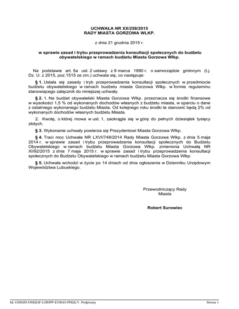 UCHWAŁA NR XX/258/2015 RADY MIASTA GORZOWA WLKP. z dnia 21 grudnia 2015 r. w sprawie zasad i trybu przeprowadzenia konsultacji społecznych do budżetu obywatelskiego w ramach budżetu Miasta Gorzowa Wlkp. Na podstawie art. 5a ust. 2 ustawy z 8 marca 1990 r. o samorządzie gminnym (t.j. Dz. U. z 2015, poz.1515 ze zm.) uchwala się, co następuje: § 1. Ustala się zasady i tryb przeprowadzenia konsultacji społecznych w przedmiocie budżetu obywatelskiego w ramach budżetu miasta Gorzowa Wlkp. w formie regulaminu stanowiącego załącznik do niniejszej uchwały. § 2. 1. Na budżet obywatelski Miasta Gorzowa Wlkp. przeznacza się środki finansowe w wysokości 1,5 % od wykonanych dochodów własnych z budżetu miasta, w oparciu o dane z ostatniego wykonanego budżetu Miasta. Od kolejnego roku środki te stanowić będą 2% od wykonanych dochodów własnych budżetu Miasta. 2. Kwotę, o której mowa w ust. 1, zaokrągla się w górę do pełnych dziesiątek tysięcy złotych. § 3. Wykonanie uchwały powierza się Prezydentowi Miasta Gorzowa Wlkp. § 4. Traci moc Uchwała NR LXVI/748/2014 Rady Miasta Gorzowa Wlkp. z dnia 5 maja 2014 r. w sprawie zasad i trybu przeprowadzenia konsultacji społecznych do Budżetu Obywatelskiego w ramach budżetu Miasta Gorzowa Wlkp. zmieniona Uchwałą NR XI/92/2015 z dnia 7 maja 2015 r. w sprawie zasad i trybu przeprowadzenia konsultacji społecznych do Budżetu Obywatelskiego w ramach budżetu Miasta Gorzowa Wlkp. § 5. Uchwała wchodzi w życie po 14 dniach od dnia ogłoszenia w Dzienniku Urzędowym Województwa Lubuskiego. Przewodniczący Rady Miasta Robert Surowiec Id: GMSJD-OMQGF-LHHPP-ENIGO-PHQLV. Podpisany Strona 1 Załącznik do Uchwały Nr XX/258/2015 Rady Miasta Gorzowa Wlkp. z dnia 21 grudnia 2015 r. Regulamin Rozdział 1. Postanowienia ogólne § 1. Regulamin wdrażania mechanizmu partycypacyjnego jakim jest budżet obywatelski, obejmuje zbiór zasad, które regulują sposób i tryb prowadzenia konsultacji społecznych, mających na celu włączenie mieszkańców w proces współdecydowania o wydatkach finansowych z wydzielonej części budżetu miasta Gorzowa Wlkp. na kolejny rok budżetowy. § 2. 1. Ze środków budżetu obywatelskiego może być finansowane zadanie należące do zadań własnych miasta na prawach powiatu, które ma charakter twardy lub miękki. 1) Pod pojęciem zadania twardego rozumie się zadanie inwestycyjne dotyczące remontu, modernizacji, adaptacji, budowy nowych obiektów lub zakupu wyposażenia. 2) Pod pojęciem zadania miękkiego rozumie się projekt nieinwestycyjny, wydarzenie o charakterze prospołecznym, kulturalnym, oświatowym lub sportowym z wyłączeniem bieżącej administracyjnej działalności podmiotów. 2. Zadanie musi być ogólnodostępne dla wszystkich mieszkańców. 1) W przypadku zadania twardego realizowanego na terenie zarządzanym przez miejskie instytucje/placówki musi ono być dostępne dla wszystkich mieszkańców po zamknięciu instytucji/placówki, zarówno w dni robocze, jak i dni wolne od pracy. 3. W przypadku zadania, które wymaga lokalizacji na określonym terenie, musi być ono zlokalizowane na nieruchomości stanowiącej własność miasta Gorzowa Wlkp. 4. Realizacja zadania w ramach budżetu obywatelskiego powinna odbyć się w ciągu jednego roku budżetowego, przy czym w uzasadnionych przypadkach możliwe jest wydłużenie realizacji zadania inwestycyjnego lub remontowego do dnia 30 czerwca następnego roku budżetowego, na zasadach określonych w ustawie o finansach publicznych. § 3. 1. W ramach budżetu obywatelskiego nie może być realizowane zadanie, które: 1) stoi w sprzeczności z obowiązującymi w mieście planami, programami i strategiami, w tym w szczególności z miejscowymi planami zagospodarowania przestrzennego, 2) narusza obowiązujące przepisy prawa, prawa osób trzecich, w tym prawa własności, 3) zlokalizowane jest na majątku miasta obciążonym na rzecz osób trzecich lub przeznaczonym na sprzedaż, 4) polega wyłącznie na sporządzeniu projektu bądź planu przedsięwzięcia, 5) wymaga sporządzenia projektu bądź planu przedsięwzięcia, w przypadku niezabezpieczenia środków na ich wykonanie w ramach wyszacowanej wyceny wartości jednostkowej zgłoszonego zadania, o której mowa w § 9. ust. 15, 6) po realizacji generowałoby koszty utrzymania niewspółmiernie wysokie w stosunku do wartości jednostkowej zgłoszonego zadania, Id: GMSJD-OMQGF-LHHPP-ENIGO-PHQLV. Podpisany Strona 1 7) wymaga współpracy instytucjonalnej podmiotów zewnętrznych, jeżeli te nie przedstawiły pisemnej zgody dotyczącej powstania na ich terenie zadania twardego i nie wyraziły woli utrzymywania go oraz w przypadku realizacji zadania miękkiego, gdy nie wyraziły gotowości do współpracy. § 4. Administratorem danych osobowych zebranych podczas realizacji budżetu obywatelskiego, w tym osób zgłaszających zadania, popierających je jest Miasto Gorzów Wlkp., reprezentowane przez Prezydenta Miasta Gorzowa Wlkp., z siedzibą przy ul. Sikorskiego 3-4 w Gorzowie Wlkp. Dane te będą przetwarzane wyłącznie w celu realizacji budżetu obywatelskiego i nie będą przekazywane osobom trzecim. Każdemu przysługuje prawo wglądu w jego dane osobowe. Rozdział 2. Podział środków § 5. 1. Zadanie finansowane z budżetu ogólnomiejski, rejonowy lub oświatowy. obywatelskiego może mieć charakter 1) Pod pojęciem zadania ogólnomiejskiego rozumie się zadanie dotyczące potrzeb mieszkańców więcej niż jednego rejonu Gorzowa Wlkp. lub takie, którego miejsce realizacji nie jest przypisane do jednego rejonu Gorzowa Wlkp. 2) Pod pojęciem zadania rejonowego rozumie się zadanie dotyczące głównie potrzeb mieszkańców jednego z 8 wyodrębnionych rejonów w Gorzowie Wlkp. 3) Pod pojęciem zadania oświatowego rozumie się zadanie dotyczące potrzeb jednostek oświatowych działających na terenie Gorzowa Wlkp. § 6. 1. W Gorzowie Wlkp. wyodrębniono 8 rejonów, których gra