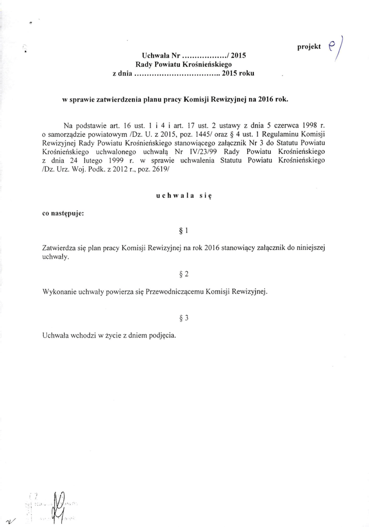 projekt Nr ..... „ .......... ./ 2015 Rad y Powiatu Kroś nieńskiego z dni a .................. ........... ...... 2015 roku Uchwała w sprawie zatwierdzenia planu pracy Komisji Rewizyjnej na 2016 rok. Na podstawie art. 16 ust. I i 4 i art. 17 ust. 2 ustawy z dnia 5 czerwca 1998 r. o sa m orządzie powiatowym /Dz. U. z 2015, poz. 1445/ oraz§ 4 ust. 1 Regulaminu Komisj i Rewizyjnej Rady Powiatu Krośnieńskiego sta now i ącego za łącznik Nr 3 do Statutu Powiatu Kroś n ieńskiego uchwa lonego uc hwal ą Nr IV /23/99 Rady Powiatu Krośnieńsk iego z dni a 24 lu tego 1999 r. w sprawie uch walenia Statutu Powiatu Kroś nień skiego /Dz. Urz. Woj . Podk. z 2012 r., poz. 26 19/ uchw a la co się na s tę puj e: §1 Zatwierdza uchwal y. się plan pracy Komisji Rewizyjnej na rok 20 16 stanowi ący załączn ik §2 Wykonanie uchwały powierza s i ę Przewodniczącemu §3 wchodzi w życie z dniem Uc h wa ł a NJ.„. lf1, .„ podj ęc i a . Komisji Rewizyj nej . do niniejszej e) Zał. do projektu uchwały Nr .... . .. . z dnia . . Plan Pracy Komisji Rewizyjnej Rady Powiatu na 2016 rok L.p. l. 2. 3. 4. 5. 6. 7. 8. Kro ś ni eńs ki ego Tematyka posiedzeń Kontrola skarg i wniosków kierowanyc h do Starostwa Powiatowego w Krośnie i terminowość ich zała twiani a Ocena dzia ł alno~ci i funkcji Samodzielnego Publicznego Zak ł adu Opieki Stomatologicznej w Krośnie Kontrola Zarządu Powiatu w zakresie wykonania b udżetu Powiatu za 20 I 5 rok. Opracowanie opinii w sprawie wykonania budżetu Powiatu oraz sformułowanie wniosku w sprawie absol utorium dla Zarządu Powiatu Kroś nieńskiego za 2015 rok. Ocena funkcjo nowania Zespołu Szkó ł przy O ś rodku Szkolenia i Wychowania OHP w Iwoniczu. Kontrola b i eżącej d zia ł a ln ośc i Powiatowego Urzędu Pracy w Krośnie, wykorzystanie środków na likwidację bezrobocia w powiecie za I pó łrocze 20 l 6 r. Kontrola Domu Wczasów Dziecięcych w Rymanowie Zdroju w zakresie oceny działalno śc i placówk i. Podsumowanie pracy Komisji Rewizyjnej za 2016 rok i opracowanie planu pracy na 2017 rok. Kontrole zlecone przez Radę Powiatu Termin luty marzec maj czerwiec wrzesień październ i k grudz i eń Na kro ś nień sk iego . b i eżąco P rzewodnicząca Komisji Rewizyjnej Tere;_a f,.irko J fi~ I 20 15 Rady Powiatu Krośni~ ń sk iego . .... 20 I 5 roku Uzasadnienie Zgodnie z § 13 Regulaminu Komisji Rewizyjnej Rady Powiatu st anow iące go załącznik zobowi ąza na jest do Nr 3 do Statutu Powiatu przedłożenia w tenninie do 15 stycznia każdego Krośnieńskiego Krośnieńskiego - Komisja Rewizyjna Radzie Powiatu celem zatwierdzenia planu pracy roku.