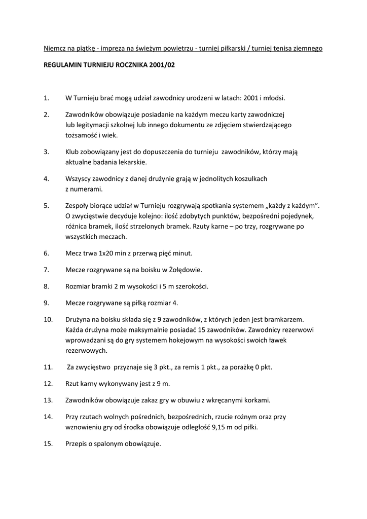 Niemcz na piątkę - impreza na świeżym powietrzu - turniej piłkarski / turniej tenisa ziemnego REGULAMIN TURNIEJU ROCZNIKA 2001/02 1. W Turnieju brać mogą udział zawodnicy urodzeni w latach: 2001 i młodsi. 2. Zawodników obowiązuje posiadanie na każdym meczu karty zawodniczej lub legitymacji szkolnej lub innego dokumentu ze zdjęciem stwierdzającego tożsamość i wiek. 3. Klub zobowiązany jest do dopuszczenia do turnieju zawodników, którzy mają aktualne badania lekarskie. 4. Wszyscy zawodnicy z danej drużynie grają w jednolitych koszulkach z numerami. 5. Zespoły biorące udział w Turnieju rozgrywają spotkania systemem „każdy z każdym”. O zwycięstwie decyduje kolejno: ilość zdobytych punktów, bezpośredni pojedynek, różnica bramek, ilość strzelonych bramek. Rzuty karne – po trzy, rozgrywane po wszystkich meczach. 6. Mecz trwa 1x20 min z przerwą pięć minut. 7. Mecze rozgrywane są na boisku w Żołędowie. 8. Rozmiar bramki 2 m wysokości i 5 m szerokości. 9. Mecze rozgrywane są piłką rozmiar 4. 10. Drużyna na boisku składa się z 9 zawodników, z których jeden jest bramkarzem. Każda drużyna może maksymalnie posiadać 15 zawodników. Zawodnicy rezerwowi wprowadzani są do gry systemem hokejowym na wysokości swoich ławek rezerwowych. 11. Za zwycięstwo przyznaje się 3 pkt., za remis 1 pkt., za porażkę 0 pkt. 12. Rzut karny wykonywany jest z 9 m. 13. Zawodników obowiązuje zakaz gry w obuwiu z wkręcanymi korkami. 14. Przy rzutach wolnych pośrednich, bezpośrednich, rzucie rożnym oraz przy wznowieniu gry od środka obowiązuje odległość 9,15 m od piłki. 15. Przepis o spalonym obowiązuje. 16. Stosowane będą przez sędziów kary wychowawcze od 1 do 5 min. W przypadku drastycznego naruszenia przepisów zawodnik będzie usunięty z boiska (czerwona kartka) i nie będzie mógł wystąpić w najbliższym spotkaniu swojej drużyny. Jeżeli czerwona kartka będzie konsekwencją niesportowego zachowania, zawodnik może zostać odsunięty na więcej niż jeden mecz. Zespół gra w osłabieniu do końca zawodów. 17. Za rzeczy pozostawione na terenie obiektu organizator nie odpowiada. 18. Koszty dojazdu ponoszą jednostki delegujące. 19. Organizator turnieju nie zapewnia ubezpieczenia zawodników od następstw nieszczęśliwych wypadków w trakcie zawodów. 20. Wszelkie wątpliwości rozstrzyga Organizator turnieju i do niego należą ostateczne decyzje.