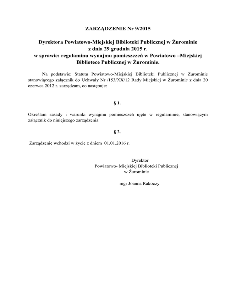 ZARZĄDZENIE Nr 9/2015 Dyrektora Powiatowo-Miejskiej Biblioteki Publicznej w Żurominie z dnia 29 grudnia 2015 r. w sprawie: regulaminu wynajmu pomieszczeń w Powiatowo –Miejskiej Bibliotece Publicznej w Żurominie. Na podstawie: Statutu Powiatowo-Miejskiej Biblioteki Publicznej w Żurominie stanowiącego załącznik do Uchwały Nr /153/XX/12 Rady Miejskiej w Żurominie z dnia 20 czerwca 2012 r. zarządzam, co następuje: § 1. Określam zasady i warunki wynajmu pomieszczeń ujęte w regulaminie, stanowiącym załącznik do niniejszego zarządzenia. § 2. Zarządzenie wchodzi w życie z dniem 01.01.2016 r. Dyrektor Powiatowo- Miejskiej Biblioteki Publicznej w Żurominie mgr Joanna Rakoczy Załącznik do Zarządzenia Nr 9/2015 Dyrektora P-MBP w Żurominie z dnia 29 grudnia 2015 r. REGULAMIN WYNAJMU POMIESZCZEŃ W POWIATOWOMIEJSKIEJ BIBLIOTECE PUBLICZNEJ W ŻUROMINIE PRZY UL.WARSZAWSKIEJ 4 Postanowienia ogólne §1 Regulamin określa zasady udostępniania pomieszczeń tzw. Klubu Muzycznego wraz z wyposażeniem, znajdującym się w budynku P-MBP w Żurominie przy ul. Warszawskiej 4 §2 1. Powiatowo-Miejska Biblioteka Publiczna w Żurominie jest instytucją kultury posiadającą osobowość prawną oraz prawo użyczenia lokali nieruchomości znajdującej się przy ul. Warszawskiej 4. 2. Powiatowo-Miejska Biblioteka Publiczna w Żurominie reprezentowana jest przez Dyrektora, lub osobę upoważnioną. §3 1. Ilekroć w regulaminie jest mowa, o Wynajmującym -rozumie się przez to P-MBP w Żurominie. 2. Ilekroć w regulaminie jest mowa o Najemcy -rozumie się przez to osobę fizyczną lub prawną oraz każdy podmiot ubiegający się o udostępnienie pomieszczeń. §4 Rodzaj organizowanej imprezy, a także zachowania wszystkich osób biorących w niej udział, nie mogą utrudniać wykonywania zadań Powiatowo-Miejskiej Biblioteki Publicznej oraz kolidować z ogólnymi zasadami etycznymi lub powodować negatywnych skutków dla wizerunku biblioteki. §5 1. Najmu pomieszczeń dokonuje się odpłatnie, zgodnie z cennikiem usług stanowiących załącznik nr 1 do niniejszego regulaminu. 2. Wyłączenia od zasady określonej w ust. 1, dotyczą nieodpłatnego udostępniania pomieszczeń, zgodnie z zapisami § 8 ZASADY UDOSTĘPNIANIA POMIESZCZEŃ §6 wynająć, użyczyć 1. Najemca nie ma prawa lub udostępnić pomieszczeń Wynajmującego osobom trzecim. 2. P-MBP w Żurominie zastrzega sobie prawo odmowy wynajęcia Sali bez podania przyczyny jej odmowy. §7 Rezerwacja Sali dokonywana jest przez Najemcę poprzez złożenie wniosku w P-MBP w Żurominie bądź przesłać drogą mailową ( adres: [email protected]) sporządzonego według wzoru, stanowiącego załącznik nr 2 do regulaminu, nie później niż 14 dni przed wynajmem. §8 P-MBP w Żurominie wykonuje zadania jednostki samorządu terytorialnego, udostępnia swoje pomieszczenie w pierwszej kolejności: 1. Organizatorowi P-MBP w Żurominie, 2. Jednostkom organizacyjnym Miasta i powiatu żuromińskiego 3. Stowarzyszeniom oraz innym podmiotom użyteczności publicznej nieosiągającym dochodów z tytułu prowadzonej działalności zgodnie z ich działalnością statutową, 4. Podmiotom, które wspólnie z P-MBP są organizatorami imprez kulturalnooświatowych §9 1. Najemca jest zobowiązany podać maksymalną liczbę uczestników. 2. Wynajmujący zastrzega sobie prawo odmowy wejścia większej niż przewidywana, liczba uczestników spotkania. § 10 Dokonanie rezerwacji jest potwierdzeniem zapoznania się, przyjęcia do wiadomości i stosowania wszelkich zasad obowiązującego regulaminu. § 11 1. Czas potrzebny najemcy na czynności organizacyjne zarówno przed jak i po spotkaniu wliczany jest do czasu najmu. 2. Czas najmu liczony jest zgodnie z cennikiem opłat, za każdą rozpoczętą godzinę. 3. W przypadku przedłużenia określonego czasu najmu, Wynajmujący nalicza dodatkową opłatę za każdą rozpoczętą godzinę, zgodnie z obowiązującym cennikiem opłat. § 12 1. Wynajmujący nie jest płatnikiem podatku VAT i nie jest uprawniony do wstawiania faktur VAT. Wynajmujący wystawia rachunki. 2. Płatności związane z udostępnieniem pomieszczenia można regulować gotówką najpóźniej w dniu spotkania w siedzibie biblioteki w godzinach jej urzędowania lub przelewem na konto bankowe Wynajmującego, wskazane w rachunku, w terminie do 7 dni od daty otrzymania rachunku. 3. Za datę otrzymania płatności, przyjmuje się wpływ należności na konto bankowe Wynajmującego. 4. W przypadku braku opłat w określonym terminie, Wynajmujący naliczy odsetki ustawowe, które Najemca jest zobowiązany uregulować natychmiast, łącznie z należnością główną. § 13 Najemca zobowiązany jest do: 1. Przestrzegania przepisów sanitarnych, bhp i ppoż. 2. Odpowiedzialności za osoby pozostające pod jego opieką. 3. Dbałości o powierzone mienie P-MBP w Żurominie. § 14 W wynajmowanej Sali i innych pomieszczeniach Wynajmującego obowiązuje całkowity zakaz palenia tytoniu. PRZEPISY KOŃCOWE § 15 Wynajmujący zostanie obciążony pełnymi kosztami naprawy uszkodzeń powstałych w wyniku niewłaściwego użytkowania sprzętu lub wyposażenia pomieszczeń. § 16 Zasady wynajęć długoterminowych, podlegają indywidualnym negocjacjom oraz podpisaniem przez strony stosownej umowy. § 17 Regulamin wchodzi w życie z dniem 01.01.2016 r. Załącznik nr 1 do regulaminu wynajmu pomieszczeń w P-MBP w Żurominie Stawki za wynajem Sali tzw. Klubu Muzycznego: 1) Impreza okolicznościowa - 250 zł. 2) Inne wynajmy dochodowe (pokazy, prezentacje itp.) –ceny negocjowane, nie mniej niż 150 zł. 3) Zebrania, szkolenia, konferencje itp., w tym z funduszy unijnych -20 zł. /h Dyrektor Powiatowo-Miejskiej Biblioteki Publicznej w Żurominie Joanna Rakoczy Załącznik nr 2 do regulaminu wynajmu pomieszczeń w P-MBP w Żurominie …………………………………… ( miejscowość, data) ……………………………………………………… ( naz