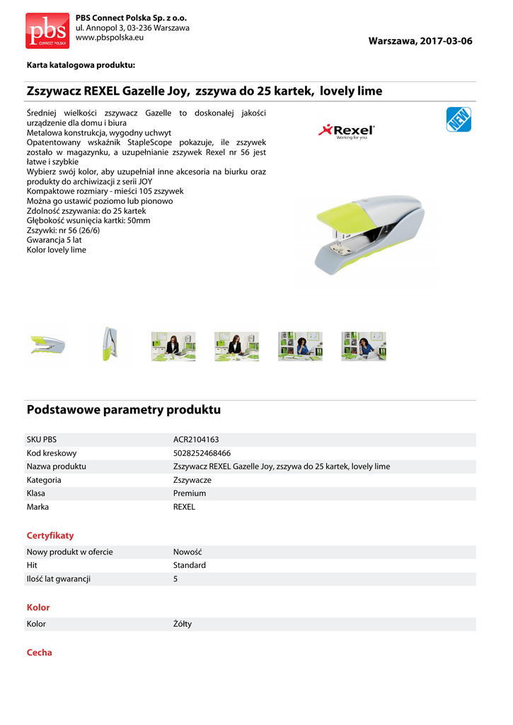 PBS Connect Polska Sp. z o.o. ul. Annopol 3, 03-236 Warszawa www.pbspolska.eu Warszawa, 2017-03-06 Karta katalogowa produktu: Zszywacz REXEL Gazelle Joy, zszywa do 25 kartek, lovely lime Średniej wielkości zszywacz Gazelle to doskonałej jakości urządzenie dla domu i biura Metalowa konstrukcja, wygodny uchwyt Opatentowany wskaźnik StapleScope pokazuje, ile zszywek zostało w magazynku, a uzupełnianie zszywek Rexel nr 56 jest łatwe i szybkie Wybierz swój kolor, aby uzupełniał inne akcesoria na biurku oraz produkty do archiwizacji z serii JOY Kompaktowe rozmiary - mieści 105 zszywek Można go ustawić poziomo lub pionowo Zdolność zszywania: do 25 kartek Głębokość wsunięcia kartki: 50mm Zszywki: nr 56 (26/6) Gwarancja 5 lat Kolor lovely lime Podstawowe parametry produktu SKU PBS ACR2104163 Kod kreskowy 5028252468466 Nazwa produktu Zszywacz REXEL Gazelle Joy, zszywa do 25 kartek, lovely lime Kategoria Zszywacze Klasa Premium Marka REXEL Certyfikaty Nowy produkt w ofercie Nowość Hit Standard Ilość lat gwarancji 5 Kolor Kolor Cecha Żółty PBS Connect Polska Sp. z o.o. ul. Annopol 3, 03-236 Warszawa www.pbspolska.eu Warszawa, 2017-03-06 Karta katalogowa produktu cd. Zszywacz REXEL Gazelle Joy, zszywa do 25 kartek, lovely lime Podstawowe parametry produktu Produkt Zszywacz Typ Standard Materiał Metal/plastik W ofercie od 2017-01 Ilość kartek 25 Wymiary Gł. wsunięcia (mm) 50 Rozmiar No 56,26/6 Wspólny słownik zamówień CPV 30197320-5 Zszywacze