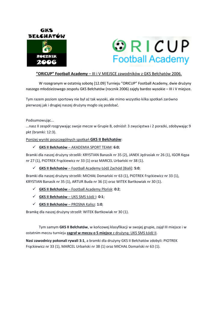 ”ORICUP” Football Academy – III i V MIEJSCE zawodników z GKS Bełchatów 2006. W rozegranym w ostatnią sobotę [12.09] Turnieju ”ORICUP” Football Academy, dwie drużyny naszego młodzieżowego zespołu GKS Bełchatów (rocznik 2006) zajęły bardzo wysokie – III i V miejsce. Tym razem poziom sportowy nie był aż tak wysoki, ale mimo wszystko kilka spotkań zarówno pierwszej jak i drugiej naszej drużyny mogło się podobać. Podsumowując... ...nasz II zespół rozgrywając swoje mecze w Grupie B, odniósł: 3 zwycięstwa i 2 porażki, zdobywając 9 pkt (bramki: 12:3). Poniżej wyniki poszczególnych spotkań GKS II Bełchatów: GKS II Bełchatów – AKADEMIA SPORT TEAM: 6:0; Bramki dla naszej drużyny strzelili: KRYSTIAN Banasik nr 35 (2), JANEK Jędrasiak nr 26 (1), IGOR Kępa nr 27 (1), PIOTREK Frąckiewicz nr 33 (1) oraz MARCEL Urbański nr 38 (1). GKS II Bełchatów – Football Academy Łódź Zachód [Biali]: 5:0; Bramki dla naszej drużyny strzelili: MICHAŁ Domański nr 63 (1), PIOTREK Frąckiewicz nr 33 (1), KRYSTIAN Banasik nr 35 (1), ARTUR Buda nr 36 (1) oraz WITEK Bartkowiak nr 30 (1). GKS II Bełchatów – Football Academy Płońsk: 0:2; GKS II Bełchatów – UKS SMS Łódź I: 0:1; GKS II Bełchatów – PROSNA Kalisz: 1:0; Bramkę dla naszej drużyny strzelił: WITEK Bartkowiak nr 30 (1). Tym samym GKS II Bełchatów, w końcowej klasyfikacji w swojej grupie, zajął III miejsce i w ostatnim meczu turnieju zagrał w meczu o 5 miejsce z drużyną: UKS SMS Łódź II. Nasi zawodnicy pokonali rywali 3:1, a bramki dla drużyny GKS II Bełchatów zdobyli: PIOTREK Frąckiewicz nr 33 (1), MARCEL Urbański nr 38 (1) oraz MICHAŁ Domański nr 63 (1). ...nasz I zespół rozgrywając swoje mecze w Grupie A, odniósł: komplet zwycięstw, zdobywając 15 pkt (bramki: 32:0). Poniżej wyniki poszczególnych meczy GKS I Bełchatów: GKS I Bełchatów – UKS SMS Łódź II: 2:0; Bramki dla naszej drużyny strzelili: FILIP Kwapiński nr 9 (1) oraz FRANEK Węglewski nr 24 (1). GKS I Bełchatów – UKS SMS Piątek: 14:0; Bramki dla naszej drużyny strzelili: KAMIL Marciniec nr 18 (4), FILIP Kwapiński nr 9 (3), FRANEK Węglewski nr 24 (2), KUBA Krawętek nr 5 (2), KUBA Maleńczyk nr 14 (2) oraz KACPER Matyśkiewicz nr 99 (1). GKS I Bełchatów – WŁÓKNIARZ Pabianice: 2:0; Bramki dla naszej drużyny strzelili: KAMIL Marciniec nr 18 (1) oraz FRANEK Węglewski nr 24 (1). GKS I Bełchatów – Football Academy Łódź Zachód [Niebiescy]: 8:0; Bramki dla naszej drużyny strzelili: FILIP Kwapiński nr 9 (3), KUBA Krawętek nr 5 (2), KAMIL Marciniec nr 18 (1), BARTOSZ Pietrasiak nr 11 (1) oraz JULEK Ryłka nr 17 (1). GKS I Bełchatów – Football Academy Łódź Północ: 6:0; Bramki dla naszej drużyny strzelili: KAMIL Marciniec nr 18 (4) oraz KUBA Krawętek nr 5 (2). W półfinale przeciwnikiem naszych zawodników był zespół UKS SMS Łódź I [jak się okazało późniejszy zwycięzca turnieju], z którym przegraliśmy: 3:4. Bramki dla naszej drużyny strzelili: KUBA Krawętek nr 5 (2) oraz ADAM Izdebski - nasz bramkarz !!! Słaby początek spotkania spowodował, iż przez większą część spotkania musieliśmy "gonić" wynik: od stanu 0:3, poprzez 2:3 i 2:4 do finalnego 3:4. Niestety brakło nam czasu, aby odrobić straty z pierwszych minut półfinału i ostatecznie przyszło nam zagrać o 3 miejsce. W ostatnim meczu GKS I Bełchatów, pokonał ponownie drużynę Football Academy Łódź Północ - tym razem: 3:0 i tym samym zajęliśmy III miejsce w Turnieju "ORICUP" Football Academy ! Bramki dla naszej drużyny strzelili: KACPER Matyśkiewicz nr 99 (1), KAMIL Marciniec nr 18 (1) oraz JULEK Ryłka nr 17 (1). Oprócz 3 i 5 miejsca naszych drużyn, trzej zawodnicy GKS Bełchatów 2006 zostali wyróżnieni przez organizatorów turnieju nagrodami indywidualnymi: - KAMIL Marciniec - NAJLEPSZY STRZELEC TURNIEJU [zdobywca 11 bramek]; - KUBA Krawętek - NAJLEPSZY ZAWODNIK drużyny GKS I Bełchatów; - FILIP Tarka - NAJLEPSZY ZAWODNIK drużyny GKS II Bełchatów. Poniżej zdjęcia naszej drużyny oraz wyróżnionych zawodników po ceremonii wręczenia nagród: GKS Bełchatów 2006 – III i V Miejsce na Turnieju ”ORICUP”_12.09.2015 KAMIL Marciniec – NAJLEPSZY STRZELEC TURNIEJU ”ORICUP” - [11 bramek] KUBA Krawętek – Najlepszy Zawodnik Drużyny GKS I Bełchatów na Turnieju ”ORICUP” FILIP Tarka – Najlepszy Zawodnik Drużyny GKS II Bełchatów na Turnieju ”ORICUP” Opracowanie i zdjęcia: Marcin Kozłowski