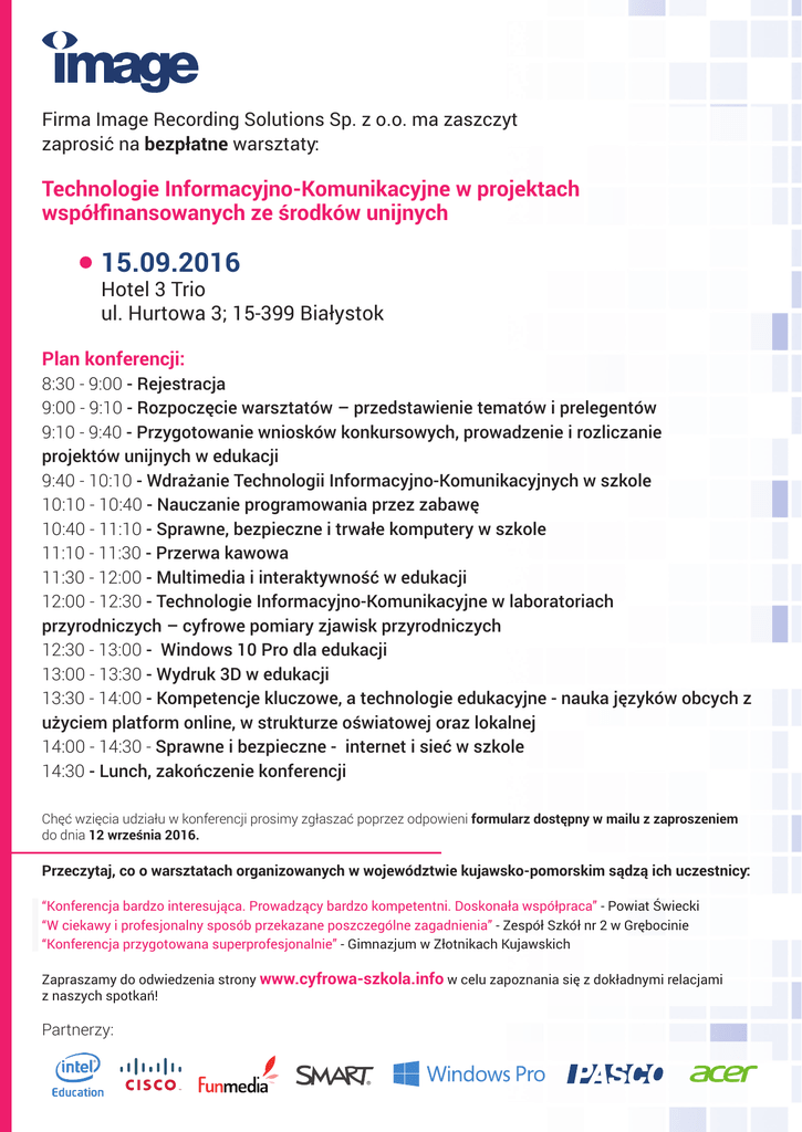 Firma Image Recording Solutions Sp. z o.o. ma zaszczyt zaprosić na bezpłatne warsztaty: Technologie Informacyjno-Komunikacyjne w projektach współfinansowanych ze środków unijnych 15.09.2016 Hotel 3 Trio ul. Hurtowa 3; 15-399 Białystok Plan konferencji: 8:30 - 9:00 - Rejestracja 9:00 - 9:10 - Rozpoczęcie warsztatów – przedstawienie tematów i prelegentów 9:10 - 9:40 - Przygotowanie wniosków konkursowych, prowadzenie i rozliczanie projektów unijnych w edukacji 9:40 - 10:10 - Wdrażanie Technologii Informacyjno-Komunikacyjnych w szkole 10:10 - 10:40 - Nauczanie programowania przez zabawę 10:40 - 11:10 - Sprawne, bezpieczne i trwałe komputery w szkole 11:10 - 11:30 - Przerwa kawowa 11:30 - 12:00 - Multimedia i interaktywność w edukacji 12:00 - 12:30 - Technologie Informacyjno-Komunikacyjne w laboratoriach przyrodniczych – cyfrowe pomiary zjawisk przyrodniczych 12:30 - 13:00 - Windows 10 Pro dla edukacji 13:00 - 13:30 - Wydruk 3D w edukacji 13:30 - 14:00 - Kompetencje kluczowe, a technologie edukacyjne - nauka języków obcych z użyciem platform online, w strukturze oświatowej oraz lokalnej 14:00 - 14:30 - Sprawne i bezpieczne - internet i sieć w szkole 14:30 - Lunch, zakończenie konferencji Chęć wzięcia udziału w konferencji prosimy zgłaszać poprzez odpowieni formularz dostępny w mailu z zaproszeniem do dnia 12 września 2016. Przeczytaj, co o warsztatach organizowanych w województwie kujawsko-pomorskim sądzą ich uczestnicy: “Konferencja bardzo interesująca. Prowadzący bardzo kompetentni. Doskonała współpraca” - Powiat Świecki “W ciekawy i profesjonalny sposób przekazane poszczególne zagadnienia” - Zespół Szkół nr 2 w Grębocinie “Konferencja przygotowana superprofesjonalnie” - Gimnazjum w Złotnikach Kujawskich Zapraszamy do odwiedzenia strony www.cyfrowa-szkola.info w celu zapoznania się z dokładnymi relacjami z naszych spotkań! Partnerzy: