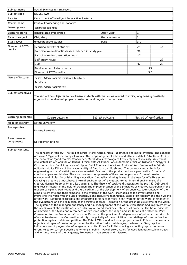 Subject name Social Sciences for Engineers Subject code E:05504W0 Faculty Department of Intelligent Interactive Systems Course name Control Engineering and Robotics Learning area technical sciences Learning profile general academic profile Study year 1 Type of subject Obligatory Study semester 1 Study level undergraduate studies ECTS 3.0 Number of ECTS credits Learning activity of student ch Participation in didactic classes included in study plan 30 Participation in consultation hours 17 sh Self-study hours 28 Sum Name of lecturer 47 28 Total number of study hours 75 Number of ECTS credits 3.0 dr inż. Adam Kaczmarek (Main teacher) Teachers: dr inż. Adam Kaczmarek Subject objectives The aim of the subject is to familiarize students with the issues related to ethics, engineering creativity, ergonomics, intellectual property protection and linguistic correctness Learning outcomes Mode of delivery Course outcome Subject outcome Method of veryfication at the university Prerequisites No requirements Recommended components No recomendations Subject contents The concept of "ethics." The field of ethics. Moral norms. Moral judgments and moral criterion. The concept of "value." Types of hierarchy of values. The scope of general ethics and ethics in detail. Situational Ethics. The concept of "good moral". Conscience. Moral ideals. Typology of Ethics. Types of morality. An ethical intellectualism of Socrates of Athens. Ethics Plato of Athens. An eudemonic ethics of Aristotle of Stagyra. A Christian ethics; Saint Augustine of Hippo, Saint Thomas of Aquinas. Ethics of Kant Immanuel A British utilitarian ethics Ethics of the responsibility of Dietrich von Hildebrand. The concepts and criteria for engineering works. Creativity as a characteristic feature of the product and as a personality. Criteria of creativity open and hidden. The structure and components of the creative process. External creator environment. Rules for outstanding innovation. Innovation driving forces. A strategy for effective action. Creating a creative atmosphere. Internal environment of a creator. Mental internal environment of a creator. Human Personality and its dynamism. The theory of positive disintegration by prof. K. Dabrowski. Engineer"s mission in the field of creation and implementation of the principles of creative leadership in the modern company. Definitions and the paradigms of the development of ergonomics. Iden-tification of the aims of elements and their relations in the systems of the work. Methodies of the investigation and improving the work with the use of inductive and deductive techniques. Basis of physiology and the hygiene of the work. Defining of charges and ergonomic factors of threats in the systems of the work. Methodies of the evaluations and the reduction of the threats of MSds. Formation of the ergonomic systems of the work. The systems of the management safety and risk management of the work. Evaluations and improvement of the conditions of the elastic work near display-oriented monitors. Intellectual property: the basic principles of protection, the types and references of exclusive rights, the range and limitations of protection. Paris Convention for the Protection of Industrial Property: the principle of independence of patents, the principle of equal treatment, the Convention priority, the priority of the exhibition, the privilege of communication, protection against unfair competition. The Patent Office and industrial property law in Poland: the law acts, objects and types of protection provided by the office. Industrial designs, trademarks. Geographical indications and topographies of integrated circuits. Rules for Polish spelling and orthography; common errors Rules for correct speech and writing in Polish; typical errors Rules for good language style in speech and writing; levels of the language; frequently made errors and mistakes Data wydruku: 06.03.2017 22:31 Strona 1 z 2 Recommended and required reading Required reading 1. Anzenbacher A. „Wprowadzenie do etyki”,Wydawnictwo WAM, Kraków 2008. 2. Chaffee J. „Potęga twórczego myślenia”, GWP, 1998. 3. Dąbrowski K. „Trud istnienia. WP”, 1986. 4. Goczyła K. „Język polski czy obcy”. Cykl wykładów, WETI PG, 2006-2009. 5. Grabosz J. „Podstawy ergonomii”. Cykl wykładów, WZiE PG, 2009-2010. 6. Grabosz J. Sikorski M. „Jak oceniać ryzyko pracy przy komputerze”. ODDK Gdańsk 1999. 7. Horst W. „Ergonomia z elementami bezpieczeństwa pracy”, Wyd. Politechniki Poznańskiej Poznań 2006. 8. Migoń M. P. „Wstęp do etyki”, Wydawnictwo GDSA, Gdańsk 2007. 9. Nęcka E. „Psychologia twórczości”, GWP. Gdańsk 2001. 10. Wieczorek W. „Ergonomia”, Tarbous, Kraków-Tarnobrzeg 2008. Recommeded reading No requirements Lesson type and method of instruction Lesson type Number of study hours Lecture Tutorial Laboratory Project Seminar 30.0 0.0 0.0 0.0 0.0 Total number of study hours per semester included in study plan 30 e-learning hours included: 0.0 Assesment methods and criteria Subject passing criteria Passing threshold Percentage of the final grade Polish Language 50.0 14.0 Innovation Engineering 50.0 20.0 Ethics 50.0 33.0 Ergonomics and protection of intellectual property 50.0 33.0 Example issues / example questions / tasks being completed Language of instructions Polish Work placement Not applicable Data wydruku: 06.03.2017 22:31 Strona 2 z 2