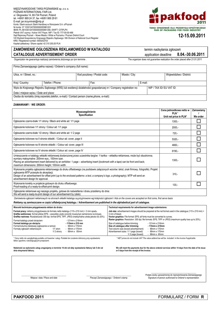 MIĘDZYNARODOWE TARGI POZNAŃSKIE sp. z o. o. POZNAŃ INTERNATIONAL FAIR Ltd. ul. Głogowska 14, 60-734 Poznań, Poland tel. +48/61 869 24 37, fax +48/61 869 29 61 E-mail: [email protected] Konto / Bank account: Bank Handlowy w Warszawie S.A. o/Poznań Nr konta: 37 103012470000000055861201 IBAN: PL 66103012470000000055861358, SWIFT: CITIPLPX Płatnik VAT czynny / Active VAT Payer, NIP / Tax ID: 777-00-00-488 Sąd Rejonowy Poznań – Nowe Miasto i Wilda w Poznaniu / Poznan District Court VIII Wydział Gospodarczy Krajowego Rejestru Sądowego / 8th Division of National Court Register KRS / Registered number: 0000202703 Kapitał zakładowy / Share capital: 42 310 200,00 PLN 12-15.09.2011 ZAMÓWIENIE OGŁOSZENIA REKLAMOWEGO W KATALOGU CATALOGUE ADVERTISEMENT ORDER Organizator nie gwarantuje realizacji zamówienia złoŜonego po tym terminie . termin nadsyłania zgłoszeń application deadline 8.04.-30.06.2011 The organizer does not guarantee realization the order placed after 21.01.2011 Firma Zamawiającego (pełna nazwa) / Orderer’s company (full name): Ulica, nr / Street, no.: Kraj / Country: Kod pocztowy / Postal code: Telefon / Phone: Miasto / City: Fax: Województwo / District: E-mail: Wpis do Krajowego Rejestru Sądowego (KRS) lub ewidencji działalności gospodarczej nr / Company registration no: NIP / TAX ID/ EU VAT ID: Data i miejsce wpisu / Date and place: Osoba do kontaktu (imię,nazwisko,telefon, e-mail) / Contact person (name,phone, e-mail): ZAMAWIAMY / WE ORDER: Cena jednostkowa netto w PLN * Unit net price in PLN* Zamawiamy / We order Ogłoszenie czarno-białe 1/1 strony / Black and white ad: 1/1 page 1300,- Ogłoszenie kolorowe 1/1 strony / Colour ad: 1/1 page 2000,- Ogłoszenie czarno-białe 1/2 strony / Black and white ad: 1/ 2 page 720,- Ogłoszenie kolorowe na II stronie okładki / Colour ad: cover, page II 5320,- Ogłoszenie kolorowe na III stronie okładki / Colour ad: cover, page III 4660,- Ogłoszenie kolorowe na IV stronie okładki / Colour ad: cover, page IV 6190,- Umieszczenie w katalogu wkładki reklamowej dostarczonej przez uczestnika targów: 1 kartka – wkładka reklamowa, moŜe być obustronna; wymiary maksymalne: 200mm wys., 100mm szer. Placing an advertisement insert delivered by an exhibitor: 1 page – advertising insert (bookmark with a tape) can be front and back; maximum dimensions: 200mm height; 100mm width. 1300,- Wykonanie projektu ogłoszenia reklamowego do druku offsetowego (na podstawie załączonych wzorów: tekst, znak firmowy, fotografie). Projekt ogłoszenia MTP przesyła do akceptacji. Design of an advertisement for offset print (up to the enclosed patterns: a text, a company’s logo, a photography). MTP will send an advertisement design for approval. 310,- Wykonanie korekty w projekcie gotowym do druku offsetowego. Proof-reading of a ready-to-offset-print design. 130,- Wyszczególnienie Specification Ogłoszenie reklamowe wg naszego projektu, gotowe do naświetlenia i druku prześlemy do dnia: We will send a ready-to-print design of our advertisement by (date): Zamówienia ogłoszeń reklamowych na stronach okładki katalogu są przyjmowane wg kolejności zgłoszeń / Ads on the covers are accepted on first come, first serve basis Reklamy są zamieszczane w części alfabetycznej katalogu. / Advertisement are published in the alphabetical part of catalogue. Warunki techniczne przygotowania reklam do druku: Technical requirements for advertisement image submissions: Format pracy: reklamy przygotowane do formatu netto katalogu (115 x 210 mm) + 3 mm spadu. Grafika wektorowa: format plików EPS – wszystkie uŜyte czcionki muszą być zamienione na krzywe. Grafika rastrowa: Rozdzielczość 300 dpi, format EPS, TIFF, JPEG (maksymalna utrata jakości do 20%). Job size: advertisement images should be prepared at the net format used in the catalogue (115 x 210 mm) + 3 mm of bleed. Vector graphics: File format: EPS; all fonts must be converted to curves. Raster graphics: Resolution: 300 dpi; file formats: EPS, TIFF or JPEG (maximum quality loss up to 20%). Format katalogu przed obcięciem Format katalogu po obcięciu Format kolumny tekstowej (ogłoszenie w ramce) Formaty ogłoszeń reklamowych: 1/1 stron 1/ 2 strony - 121mm x 216mm - 115mm x 210 mm - 88mm x 170mm - 88mm x 170mm - 88mm x 85mm Size of catalogue before trimming Size of catalogue after trimming Text column size (boxed advertisement) Advertisement sizes: 1/ 1 page (boxed) 1/ 2 page (boxed) - 121mm x 216mm - 115mm x 210mm - 88mm x 170mm - 88mm x 170mm - 88mm x 85mm * Ceny netto nie uwzględniają podatku od towarów i usług. Podatek ten zostanie doliczony przy wystawianiu faktur zgodnie z obowiązującymi przepisami. * NET prices do not include VAT The value addend tax will be included in the invoice if applicable. NaleŜność za wykonanie usług uregulujemy w terminie 14 dni od daty wystawienia faktury lub 5 dni od dnia otrzymania faktury. We will meet the payments due for the above ordered services within 14 days from the date of its issue or 5 days from the receipt of the invoice. _________________________________________ Miejsce i data / Place and date PAKFOOD 2011 _________________________________________ Pieczęć Zamawiającego / Orderer’s stamp _________________________________________ Podpis osoby upowaŜnionej do reprezentowania Zamawiającego Signature of person authorized to Orderer’s representation FORMULARZ / FORM R