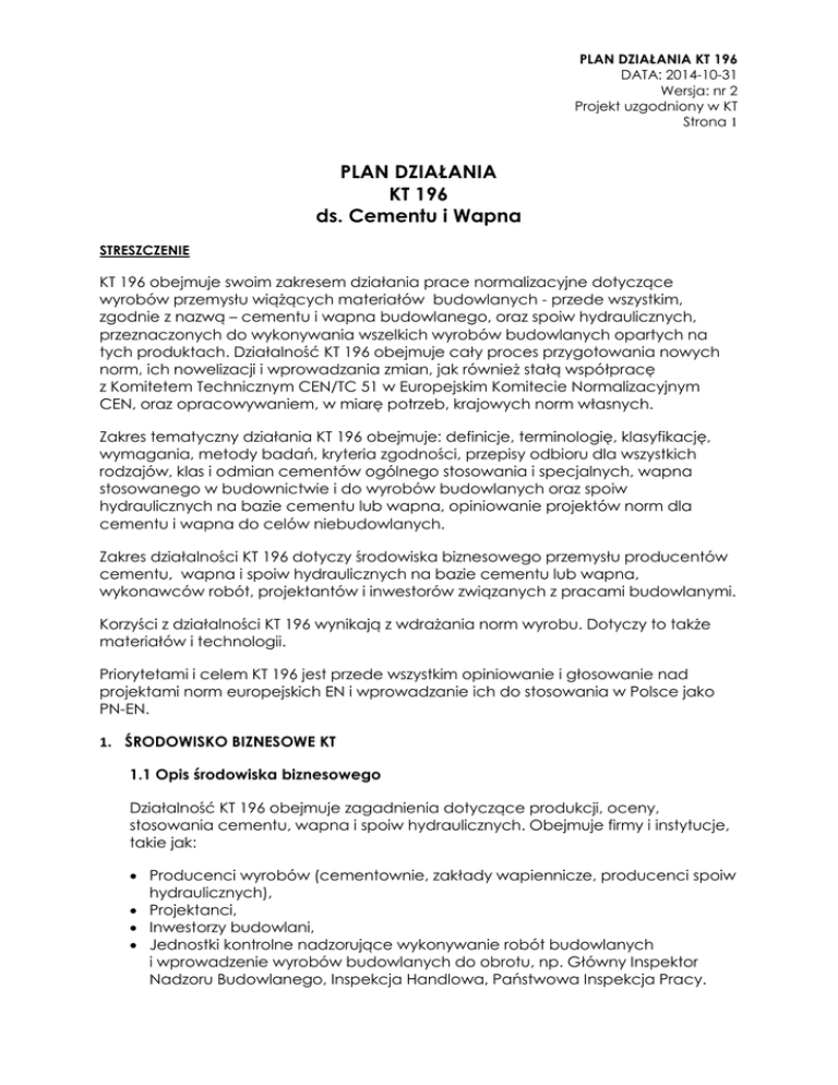 PLAN DZIAŁANIA KT 196 ds. Cementu i Wapna