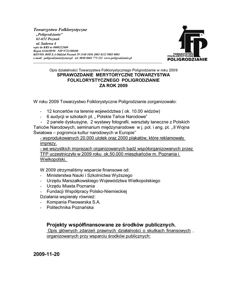 Towarzystwo Folklorystyczne „Poligrodzianie” 61-651 Poznań ul. Sadowa 4 wpis do KRS nr 0000222680 Regon 634638950 NIP 9721100400 KONTO: BOŚ S.A Oddział Poznań 39 1540 1056 2001 8312 9885 0001 e-mail: [email protected] tel. 0048 0603 775 332 www.poligrodzianie.pl _______________________________________________________________________________________ Opis działalności Towarzystwa Folklorystycznego Poligrodzianie w roku 2009 SPRAWOZDANIE MERYTORYCZNE TOWARZYSTWA FOLKLORYSTYCZNEGO POLIGRODZIANIE ZA ROK 2009 W roku 2009 Towarzystwo Folklorystyczne Poligrodzianie zorganizowało: - 12 koncertów na terenie województwa ( ok. 10.00 widzów) - 6 audycji w szkołach pt. „ Polskie Tańce Narodowe” - 2 panele dyskusyjne, 2 wystawy fotografii, warsztaty taneczne z Polskich Tańców Narodowych, seminarium międzynarodowe w j. pol. i ang. pt. ,,II Wojna Światowa – pogromca kultur narodowych w Europie’’ - wyprodukowanych 20.000 ulotek oraz 2000 plakatów, które reklamowały imprezy. - we wszystkich imprezach organizowanych bądź współorganizowanych przez TFP uczestniczyło w 2009 roku ok.50.000 mieszkańców m. Poznania i Wielkopolski. W 2009 otrzymaliśmy wsparcie finansowe od: - Ministerstwa Nauki i Szkolnictwa Wyższego - Urzędu Marszałkowskiego Województwa Wielkopolskiego - Urzędu Miasta Poznania - Fundacji Współpracy Polsko-Niemieckiej Działania wspierały również: - Kompania Piwowarska S.A. - Politechnika Poznańska Projekty współfinansowane ze środków publicznych. Opis głównych zdarzeń prawnych działalności o skutkach finansowych , organizowanych przy wsparciu środków publicznych: 2009-11-20 Polsko - Niemieckie Targi Bożonarodzeniowe – Frankfurtwspółfinansowanie Miasto Poznań Co roku świąteczna gorączka i krzątanina zdaje się zaczynać coraz wcześniej. Wystawy, ozdoby w kawiarniach i restauracjach, światełka na ulicach i w oknach wydają się pojawiać coraz szybciej. Do Zespołu Tańca Ludowego Politechniki Poznańskiej „Poligrodzianie” świąteczna atmosfera nadeszła już 20 listopada. Wtedy to właśnie „Poligrodzianie” zawitali do Frankfurtu na targi świąteczne. Targi trwały trzy dni, a atrakcji na nich nie brakowało. Prócz bombek, łańcuchów i świecidełek na choinkę, garnków, patelni i noży do przygotowywania świątecznych potraw można było znaleźć niemal wszystko potrzebne do przygotowania i przyjemnego spędzenia świątecznych dni. Dodatkowo można było mile spędzić czas budując choinkę wraz z ozdobami z klocków LEGO, czy robiąc sobie pamiątkowe zdjęcie z „prawdziwym” Świętym Mikołajem i jego „prawdziwymi” reniferami. Po zabawie i zdjęciach odwiedzający wypijali kawę, zjadali ciastko w tutejszej kawiarni i dalej z pełnym zaangażowaniem wypatrywali ciekawostek i idealnych prezentów dla bliskich. A tych nie brakowało. Co chwilę można było zobaczyć płaczące i awanturujące się dziecko o jakąś zabawkę, czy maskotkę. Gwar, zaaferowanie i kolędy w tle – tak można opisać atmosferę targów świątecznych. Pomiędzy tym wszystkim nagle odwiedzający zauważali scenę, a na niej polski zespół prezentujący tradycje świąteczne. Początkowo był to dla nich szok, ale szybko interesowali się akcją przebiegającą na scenie i angażowali w klimat całego przedstawienia. Ulubioną częścią publiczności była scena z maszkarami, czyli złośliwym Wilkiem, Dziadem i niesforną Kozą oraz czyhającą na głowę jednej z tancerek Śmiercią. Dzieci śmiały się wtedy w niebogłosy, starsi powstrzymywali się od wybuchu śmiechu, ale każdego z nich ta scenka cieszyła niezmiernie. Innym punktem bardzo silnie przeżywanym był finał, który stanowiła kolęda „Cicha noc” śpiewana po niemiecku i po polsku. Ku zdziwieniu występujących publiczność zaczęła szlochać. Ten stan utrzymywał się do samego końca kolędy, po czym ludzie podchodzili do „Poligrodzian”, dziękowali i gratulowali. I tak to się odbywało przez trzy dni, dwa razy dziennie... 2009.08.20-26 III Europejski Festiwal Sztuki Ludowej -Poznań/ Szreniawa/Gniezno - współfinansowanie Urząd Marszałkowski Województwa Wielkopolskiego, Fundacja Współpracy PolskoNiemieckiej Każdy, kto lubi tańce i swawole, zachwycony będzie wieścią, iż w dniach 2026.08.2009 w Poznaniu i okolicach odbędzie się III Europejski Festiwal Sztuki Ludowej. Impreza ta ma na celu szeroko pojętą promocję regionów Europy- od popularyzacji rękodzieła i tradycji regionalnych do współczesnych form i dziedzin twórczości artystycznej i działalności przemysłowej. Całość tworzy wspaniałe widowisko i lekcję tradycji oraz ludowości. Punkt kulminacyjny Festiwalu to autentyczne regionalne widowisko weselne, które co roku ma miejsce na terenie Muzeum Narodowego Rolnictwa i Przemysłu Rolno- Spożywczego w Szreniawie. W przedsięwzięciu uczestniczyć będą zespoły folklorystyczne z Białorusi, Niemiec, Holandii, Hiszpanii, Włoch i Polski, zaś Para Młoda- Paulina Jarmuszewicz i Łukasz Kryga- w niedzielę ( 23.08) dowie się jak wyglądają prawdziwe łowickie zaślubiny i weselicho. Dodatkowa atrakcję stanowić będą występy grup tanecznych, pokazy sztuki kulinarnej, gala mody regionalnej, wystawy i stoiska artystów ludowych. Opraw ę artystyczną Wesela Łowickiego zapewniają Zespół Tańca Ludowego Politechniki Poznańskiej „ Poligrodzianie” oraz Regionalny Zespół Pieśni i Tańca „ Boczki Chełmońskie” z Łowickiego. Pozostałe dni Festiwalu bogate będą w koncerty i prezentacje artystyczne zespołów. Już 21.08 w godzinach przedpołudniowych zagraniczni goście zaprezentują się na terenie miasta Poznania, a wieczorem zagoszczą na rynku w Gnieźnie. W dniach 22.08. i 28.08. 2009 o godz. 20.30 na terenie Politechniki Poznańskiej (ul. Piotrowo) odbędą się widowiska z cyklu „ Koncerty Nadwarciańskie”- pt. „ Europa Różnorodności” i „ Latino Show”. Organizatoram