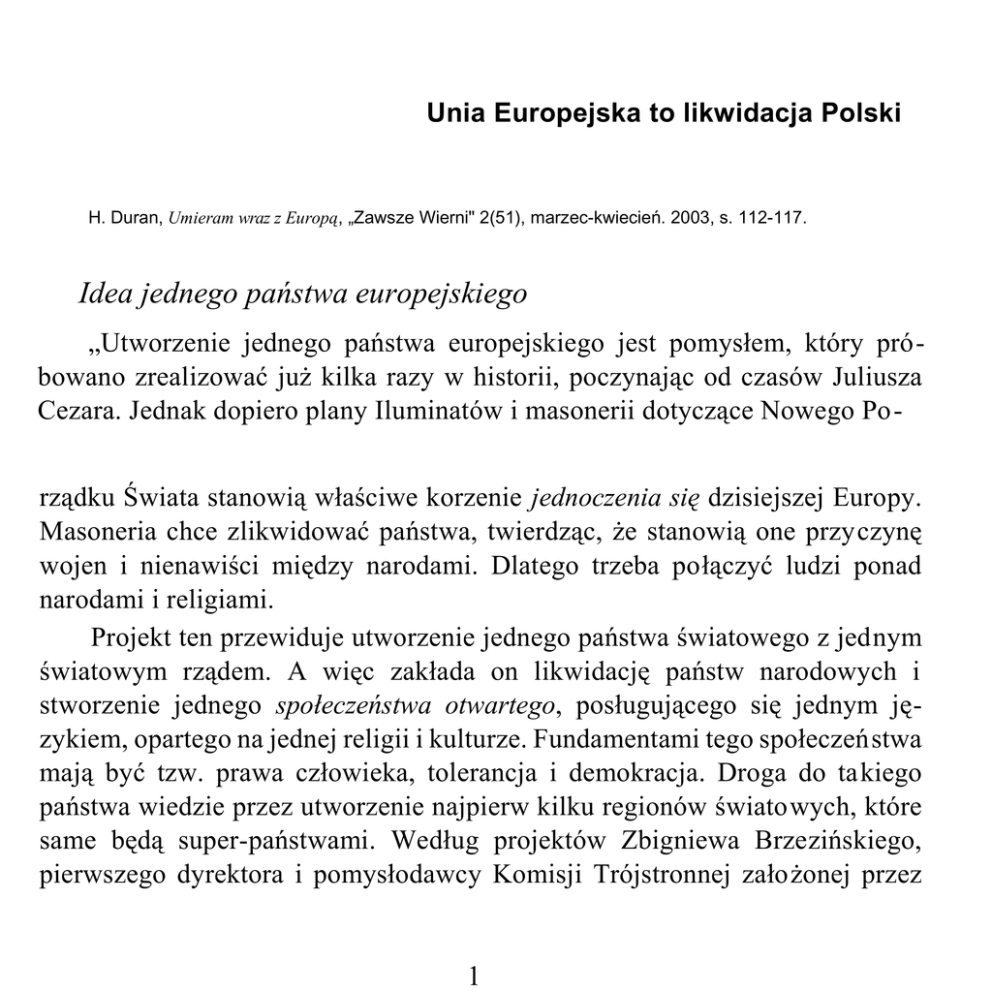 Unia Europejska to likwidacja Polski H. Duran, Umieram wraz z Europą, „Zawsze Wierni" 2(51), marzec-kwiecień. 2003, s. 112-117. Idea jednego państwa europejskiego „Utworzenie jednego państwa europejskiego jest pomysłem, który próbowano zrealizować już kilka razy w historii, poczynając od czasów Juliusza Cezara. Jednak dopiero plany Iluminatów i masonerii dotyczące Nowego Porządku Świata stanowią właściwe korzenie jednoczenia się dzisiejszej Europy. Masoneria chce zlikwidować państwa, twierdząc, że stanowią one przyczynę wojen i nienawiści między narodami. Dlatego trzeba połączyć ludzi ponad narodami i religiami. Projekt ten przewiduje utworzenie jednego państwa światowego z jednym światowym rządem. A więc zakłada on likwidację państw narodowych i stworzenie jednego społeczeństwa otwartego, posługującego się jednym językiem, opartego na jednej religii i kulturze. Fundamentami tego społeczeństwa mają być tzw. prawa człowieka, tolerancja i demokracja. Droga do takiego państwa wiedzie przez utworzenie najpierw kilku regionów światowych, które same będą super-państwami. Według projektów Zbigniewa Brzezińskiego, pierwszego dyrektora i pomysłodawcy Komisji Trójstronnej założonej przez 1 Davida Rockefellera w 1973 r., dziś mają być trzy takie wielkie państwa: Unia Europejska, Azja i Ameryka. Najbardziej zaawansowane jest powstające na naszych oczach państwo europejskie. W 1847 r. na kongresie lóż masońskich w Strasburgu użyto po raz pierwszy określenia Stanów Zjednoczonych Europy. W 1923 r. hrabia Ryszard Coudenhove-Kalergi, mason, członek wiedeńskiej loży Humanitas, wydaje książkę pt. Paneuropa, gdzie przedstawia koncepcję podziału świata na pięć wielkich regionów: Panamerykański, Paneuropejski, Panazjatycki, Pansowiecki i Panbrytyjski. Regiony te miałyby w przyszłości utworzyć jedno państwo światowe. Paneuropa stanowiłaby jeden wspólny naród używający jednego języka. Według Kalergiego władcami takiej Europy miał być żydowski naród panów, a rządzonymi ludy aryjskiego obszaru językowego. Półtora roku później Adolf Hitler w swojej Mein Kampf zamienił tylko role. Panami mieli być Niemcy. Paneuropa Kalergiego to laickie państwo totalitarnego ładu. Wkrótce założył on Unię Panaeuropejską popieraną przez masonerię i finansierę światową. Niedługo potem, w 1932 r. w dokumentach loży masońskiej - Wielkiego Wschodu Francji - znajdujemy plany utworzenia Stanów Zjednoczonych Europy, a w Planie z 9 lipca 1934 r. jest już mowa o Unii Europejskiej. Wśród twórców dzisiejszej Unii Europejskiej znajdujemy wielu masonów: Winstona Churchilla, Henri Spaaka, Józefa Rettingera, Jeana Monneta (doradca Roberta Schumanna, ministra spraw zagranicznych Francji) i także hrabiego Coudenhove-Kalergi. 2 Projekt Unii Europejskiej Na naszych oczach powstaje jedno wielkie totalitarne superpaństwo europejskie zjednoczone nie na fundamentach wspólnych korzeni chrześcijańskich, ale oparte na jednej wspólnej ekonomii i gospodarce, centralnie zarzą-dzanej i całkowicie kontrolowanej, i na wspólnym prawodawstwie. Wyrazem utraty niepodległości gospodarczej i ekonomicznej poszczególnych: członków Unii Europejskiej jest wspólna waluta euro i Centralny Bank Europejski we Frankfurcie nad Menem. Tu znajduje się centrum kierowani: ekonomią państwa europejskiego. Już teraz wyraźnie mówi się o powstań:europejskiej prokuratury, policji, służby granicznej, a także centrum rozwoju gospodarczego i oczywiście wspólnego europejskiego prawa. Kolejnym krokiem w tworzeniu tego państwa będzie zjednoczenie polityczne. Następnie zostanie uchwalona w Rzymie konstytucja nowego superpaństwa. Będzie to państwo federacyjne zbudowane na modelu USA. Na początku federacja będzie utworzona z państw wchodzących w skład Unii Europejskiej. Zostanie utworzony urząd prezydenta Europy, a władzę ustawodawczą będzie sprawował parlament europejski. Wyłoniony zostanie rząd (dziś stanowi go Komisja Europejska z przewodniczącym i dwudziestoma komisarzami). W Europie zamiast stanów będziemy mieli euro-regiony. Jednak całkowita likwidacja państw i przejście do struktury takiej jak w USA będą się odbywały stopniowo. Nagłe przejście do nowej struktury byłoby zbyt wielkim szokiem dla społeczeństw przyzwyczajonych jeszcze do symbolu i tradycji narodowych. W jednym państwie europejskim zamiast parlamentów, prezydentów i rządów poszczególnych krajów będziemy mieli parlamenty, rządy i premierów poszczególnych regionów. Zlikwidowane zostaną stolice państw, powstaną 3 stolice regionów. Premierzy i rządy regionów będą bezpośrednio podlegać rządowi i prezydentowi Unii Europejskiej (nazwa nowego państwa europejskiego nie jest jeszcze ustalona). W tym modelu Warszawa nie będzie już stolicą Polski, przestanie istnieć Sejm, nie będzie rządu polskiego an polskiego prezydenta. Euroregiony zamiast państw narodowych Istnieje wiele propozycji podziału nowego superpaństwa na region;. Przedstawiamy jedną z nich, gdzie Polska została podzielona na siedem regionów (patrz mapka): Pomorze ze stolicą w Szczecinie, Kujawy Mazury ze stolicą w Gdańsku, Mazowsze ze stolicą w Warszawie, Poznańskie ze stolicą w Poznaniu Łysa Góra ze stolicą w Łodzi, Śląsk ze stolicą we Wrocławiu i Galicja ze stolicą w Krakowie. Mieszkańcy tych regionów będą wybierali swoje parlamenty, które wyłonią rządy. Będą one bezpośrednio podlegały rządowi w Brukseli, stolic;, nowego państwa, którą niektórzy w Polsce nazwali już naszą nową stolica^ W ten sposób zostanie wyeliminowany poziom władzy dotychczasowych państw, które zostaną definitywnie wymazane z mapy Europy. Nie będzie tu już mowy o suwerenności państwowej, o jakiejkolwiek niepodległości. Jeszcze przez jakiś czas pozostaną ludzie, pielęgnujący swoje tradycje, kultury i języki, ludzie mieszk