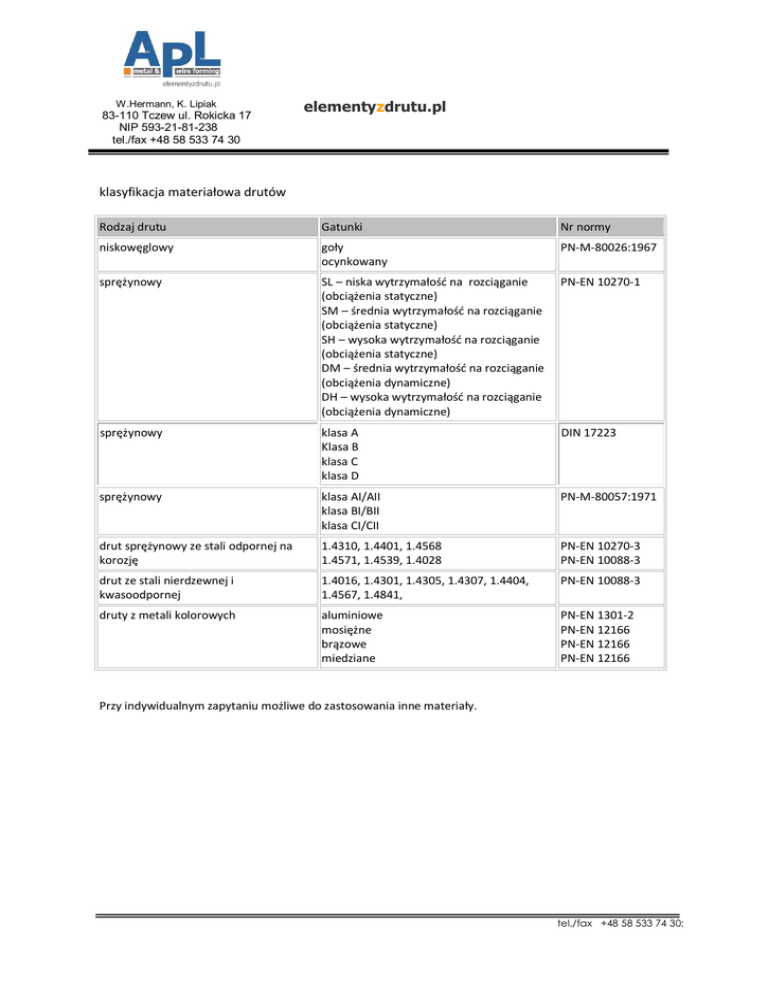 W.Hermann, K. Lipiak 83-110 Tczew ul. Rokicka 17 NIP 593-21-81-238 tel./fax +48 58 533 74 30 elementyzdrutu.pl klasyfikacja materiałowa drutów Rodzaj drutu Gatunki Nr normy niskowęglowy goły ocynkowany PN-M-80026:1967 sprężynowy SL – niska wytrzymałośd na rozciąganie (obciążenia statyczne) SM – średnia wytrzymałośd na rozciąganie (obciążenia statyczne) SH – wysoka wytrzymałośd na rozciąganie (obciążenia statyczne) DM – średnia wytrzymałośd na rozciąganie (obciążenia dynamiczne) DH – wysoka wytrzymałośd na rozciąganie (obciążenia dynamiczne) PN-EN 10270-1 sprężynowy klasa A Klasa B klasa C klasa D DIN 17223 sprężynowy klasa AI/AII klasa BI/BII klasa CI/CII PN-M-80057:1971 drut sprężynowy ze stali odpornej na korozję 1.4310, 1.4401, 1.4568 1.4571, 1.4539, 1.4028 PN-EN 10270-3 PN-EN 10088-3 drut ze stali nierdzewnej i kwasoodpornej 1.4016, 1.4301, 1.4305, 1.4307, 1.4404, 1.4567, 1.4841, PN-EN 10088-3 druty z metali kolorowych aluminiowe mosiężne brązowe miedziane PN-EN 1301-2 PN-EN 12166 PN-EN 12166 PN-EN 12166 Przy indywidualnym zapytaniu możliwe do zastosowania inne materiały. tel./fax +48 58 533 74 30;