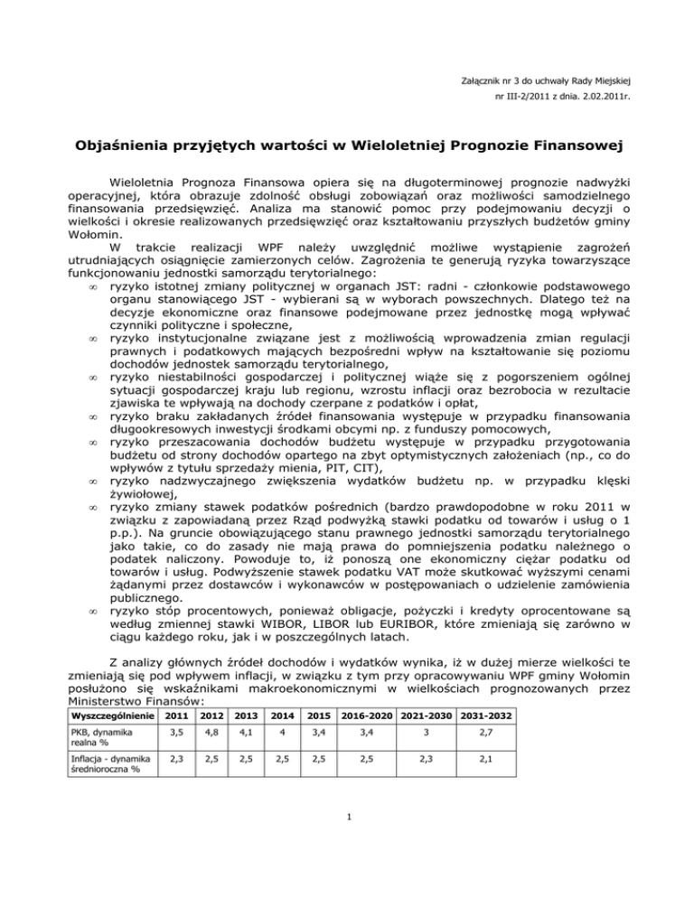 Załącznik nr 3 do uchwały Rady Miejskiej nr III-2/2011 z dnia. 2.02.2011r. Objaśnienia przyjętych wartości w Wieloletniej Prognozie Finansowej Wieloletnia Prognoza Finansowa opiera się na długoterminowej prognozie nadwyżki operacyjnej, która obrazuje zdolność obsługi zobowiązań oraz możliwości samodzielnego finansowania przedsięwzięć. Analiza ma stanowić pomoc przy podejmowaniu decyzji o wielkości i okresie realizowanych przedsięwzięć oraz kształtowaniu przyszłych budżetów gminy Wołomin. W trakcie realizacji WPF należy uwzględnić możliwe wystąpienie zagrożeń utrudniających osiągnięcie zamierzonych celów. Zagrożenia te generują ryzyka towarzyszące funkcjonowaniu jednostki samorządu terytorialnego: • ryzyko istotnej zmiany politycznej w organach JST: radni - członkowie podstawowego organu stanowiącego JST - wybierani są w wyborach powszechnych. Dlatego też na decyzje ekonomiczne oraz finansowe podejmowane przez jednostkę mogą wpływać czynniki polityczne i społeczne, • ryzyko instytucjonalne związane jest z możliwością wprowadzenia zmian regulacji prawnych i podatkowych mających bezpośredni wpływ na kształtowanie się poziomu dochodów jednostek samorządu terytorialnego, • ryzyko niestabilności gospodarczej i politycznej wiąże się z pogorszeniem ogólnej sytuacji gospodarczej kraju lub regionu, wzrostu inflacji oraz bezrobocia w rezultacie zjawiska te wpływają na dochody czerpane z podatków i opłat, • ryzyko braku zakładanych źródeł finansowania występuje w przypadku finansowania długookresowych inwestycji środkami obcymi np. z funduszy pomocowych, • ryzyko przeszacowania dochodów budżetu występuje w przypadku przygotowania budżetu od strony dochodów opartego na zbyt optymistycznych założeniach (np., co do wpływów z tytułu sprzedaży mienia, PIT, CIT), • ryzyko nadzwyczajnego zwiększenia wydatków budżetu np. w przypadku klęski żywiołowej, • ryzyko zmiany stawek podatków pośrednich (bardzo prawdopodobne w roku 2011 w związku z zapowiadaną przez Rząd podwyżką stawki podatku od towarów i usług o 1 p.p.). Na gruncie obowiązującego stanu prawnego jednostki samorządu terytorialnego jako takie, co do zasady nie mają prawa do pomniejszenia podatku należnego o podatek naliczony. Powoduje to, iż ponoszą one ekonomiczny ciężar podatku od towarów i usług. Podwyższenie stawek podatku VAT może skutkować wyższymi cenami żądanymi przez dostawców i wykonawców w postępowaniach o udzielenie zamówienia publicznego. • ryzyko stóp procentowych, ponieważ obligacje, pożyczki i kredyty oprocentowane są według zmiennej stawki WIBOR, LIBOR lub EURIBOR, które zmieniają się zarówno w ciągu każdego roku, jak i w poszczególnych latach. Z analizy głównych źródeł dochodów i wydatków wynika, iż w dużej mierze wielkości te zmieniają się pod wpływem inflacji, w związku z tym przy opracowywaniu WPF gminy Wołomin posłużono się wskaźnikami makroekonomicznymi w wielkościach prognozowanych przez Ministerstwo Finansów: Wyszczególnienie 2011 2012 2013 2014 2015 2016-2020 2021-2030 2031-2032 PKB, dynamika realna % 3,5 4,8 4,1 4 3,4 3,4 3 2,7 Inflacja - dynamika średnioroczna % 2,3 2,5 2,5 2,5 2,5 2,5 2,3 2,1 1 W związku ze skutkami budżetowymi spowolnienia gospodarczego oraz koniecznością realizacji strategicznych inwestycji w perspektywie średnioterminowej przewiduje się, że wydatki będą przewyższały dochody generując deficyt budżetowy, który jednak z kwoty 18.728.235 w roku 2010 będzie się w kolejnych latach zmniejszał. Zakłada się, że w roku 2015 r. wydatki budżetowe będą zbilansowane dochodami budżetowymi. Dlatego też w najbliższej perspektywie strategicznym celem gospodarki finansowej gminy będzie restrukturyzacja kosztowa działalności operacyjnej oraz identyfikowanie i wykorzystywanie rezerw zarówno w zakresie pozyskiwania dochodów, jak i finansowania zadań bieżących i inwestycyjnych. W związku z tym, że dochody i wydatki budżetowe mają podstawowe znaczenie w budżecie objaśnienia dotyczą przede wszystkim tych wartości. Przychody i rozchody stanowią natomiast konsekwencję planowanych dochodów i wydatków. W celu realizacji przedsięwzięć w latach 2010-2015 ujętych w Wieloletniej Prognozie Finansowej gmina Wołomin będzie korzystała z finansowania środkami pochodzącymi ze źródeł zewnętrznych w postaci kredytów, pożyczek i pozyskanymi z emisji obligacji komunalnych. Przewiduje się, że po 2011 r. udział środków zwrotnych w finansowaniu inwestycji ulegnie znaczącemu obniżeniu. W przygotowanej Wieloletniej Prognozie Finansowej stopień zadłużenia jest zgodny z limitem ustawowym wynoszącym 60% (art. 170 ust. 1 ustawy z dnia 30 czerwca 2005r. o finansach publicznych Dz. U. Nr 249, poz. 2104 z późn. zm., który zgodnie z art. 121 ust.8 ustawy z dnia 27 sierpnia 2009 r. Przepisy wprowadzające ustawę o finansach publicznych Dz. U. Nr 157, poz. 1241, z późn. zm. jest stosowany jeszcze w latach 2011-2013). Drugi ze wskaźników ostrożnościowych, opisujący relację wydatków związanych z obsługą zadłużenia (rozchody, koszty obsługi zadłużenia, poręczenia i gwarancje) do dochodów, w latach 20112015 będzie oscylował w granicach od 6,88% do 7,85%, wobec limitu ustawowego wynoszącego 15%. We wszystkich prognozowanych latach spełniony jest także nowy wskaźnik z art. 243 ustawy z dnia 27 sierpnia 2009 roku roku o finansach publicznych (Dz. U. Nr 157 poz. 1240 z późn. zm.). DOCHODY BUDŻETOWE Prognoza dochodów na 2011 rok przewiduje wpływy w wysokości 118.594.866 zł, co oznacza wzrost nominalny o 4,3% tj. o kwotę 4.870.112 zł, w stosunku do 2010 roku. Dochody majątkowe w WPF zaplanowano na podstawie podpisanych umów na dofinansowanie projektów realizowanych w ramach programów UE, analizy wpływów historycznych (po dokonanej korekcie w roku 2010) oraz analizie zasobu komuna