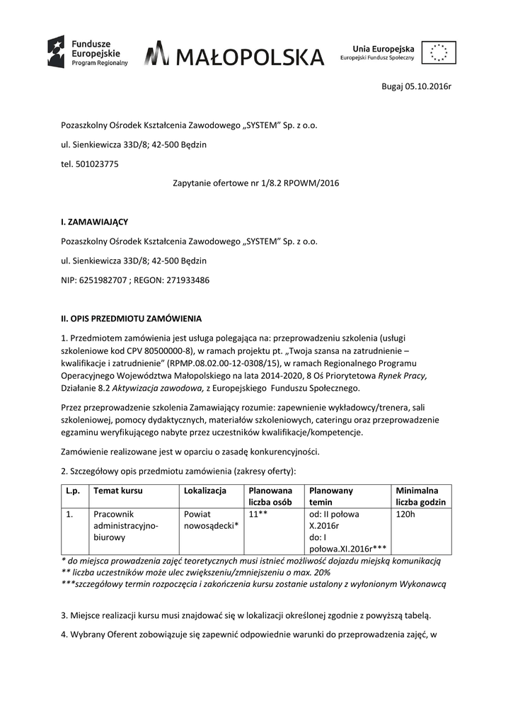 Bugaj 05.10.2016r Pozaszkolny Ośrodek Kształcenia Zawodowego „SYSTEM” Sp. z o.o. ul. Sienkiewicza 33D/8; 42-500 Będzin tel. 501023775 Zapytanie ofertowe nr 1/8.2 RPOWM/2016 I. ZAMAWIAJĄCY Pozaszkolny Ośrodek Kształcenia Zawodowego „SYSTEM” Sp. z o.o. ul. Sienkiewicza 33D/8; 42-500 Będzin NIP: 6251982707 ; REGON: 271933486 II. OPIS PRZEDMIOTU ZAMÓWIENIA 1. Przedmiotem zamówienia jest usługa polegająca na: przeprowadzeniu szkolenia (usługi szkoleniowe kod CPV 80500000-8), w ramach projektu pt. „Twoja szansa na zatrudnienie – kwalifikacje i zatrudnienie” (RPMP.08.02.00-12-0308/15), w ramach Regionalnego Programu Operacyjnego Województwa Małopolskiego na lata 2014-2020, 8 Oś Priorytetowa Rynek Pracy, Działanie 8.2 Aktywizacja zawodowa, z Europejskiego Funduszu Społecznego. Przez przeprowadzenie szkolenia Zamawiający rozumie: zapewnienie wykładowcy/trenera, sali szkoleniowej, pomocy dydaktycznych, materiałów szkoleniowych, cateringu oraz przeprowadzenie egzaminu weryfikującego nabyte przez uczestników kwalifikacje/kompetencje. Zamówienie realizowane jest w oparciu o zasadę konkurencyjności. 2. Szczegółowy opis przedmiotu zamówienia (zakresy oferty): L.p. Temat kursu Lokalizacja Planowana liczba osób 11** Planowany Minimalna temin liczba godzin 1. Pracownik Powiat od: II połowa 120h administracyjnonowosądecki* X.2016r biurowy do: I połowa.XI.2016r*** * do miejsca prowadzenia zajęć teoretycznych musi istnieć możliwość dojazdu miejską komunikacją ** liczba uczestników może ulec zwiększeniu/zmniejszeniu o max. 20% ***szczegółowy termin rozpoczęcia i zakończenia kursu zostanie ustalony z wyłonionym Wykonawcą 3. Miejsce realizacji kursu musi znajdować się w lokalizacji określonej zgodnie z powyższą tabelą. 4. Wybrany Oferent zobowiązuje się zapewnić odpowiednie warunki do przeprowadzenia zajęć, w tym warunki lokalowe, sprzętowe, niezbędne pomoce dydaktyczne, materiały szkoleniowe, catering oraz przeprowadzenie weryfikacji nabytej przez uczestnika kwalifikacji zgodnie z wymaganiami IP dot. uznania nabytej kwalifikacji na potrzeby mierzenia wskaźników monitorowania EFS dot. uzyskiwania kwalifikacji 5. Zajęcia co do zasady powinny być organizowane w godzinach pracy, tzn. od poniedziałku do piątku w godzinach od 8.00-16.00. Przy zastrzeżeniu, że możliwa jest organizacja zajęć w godzinach popołudniowych lub w soboty – po wcześniejszym uzgodnieniu z Zamawiającym. 6. Wymagania w zakresie cateringu: - na każde 4 godziny szkoleniowe (45 minut) zajęć Oferent zobowiązany jest zapewnić jedną przerwę kawową, w trakcie której poda Uczestnikom kawę, herbatę, ciastka, -w przypadku realizacji zajęć w ciągu jednego dnia w wymiarze powyżej 6 godzin lekcyjnych Oferent zobowiązany jest do zapewnienia Uczestnikom gorącego posiłku i przerwy kawowej. 7. Obowiązki wybranego Oferenta względem Zamawiającego: -przekazanie Zamawiającemu do akceptacji przed rozpoczęciem zajęć materiałów szkoleniowych, -prowadzenie dziennika zajęć i list obecności według wzorów przekazanych przez Zamawiającego, -oznaczenie miejsca prowadzenia zajęć informacją o realizowaniu kursu w ramach projektu dofinansowanego ze środków Unii Europejskiej, - informowanie Zamawiającego o nieobecności Uczestnika każdorazowo gdy taka nastąpi, nie później niż dnia następnego, - przeprowadzenie pre testu przed rozpoczęciem zajęć i post testu po zakończeniu zajęć, - przeprowadzenie egzaminu, - wydanie Uczestnikowi zaświadczenia o ukończeniu kursu/certyfikatu, zawierającego opis efektów uczenia się, - przekazanie Zamawiającemu oryginałów następujących dokumentów: listy obecności, dziennika zajęć, pre i post testu oraz kopii potwierdzonej za zgodność z oryginałem zaświadczenia / certyfikatu potwierdzającego ukończenie kursu przez Uczestnika, - minimalna liczba godzin zgodnie z pkt. II ppkt. 1. 8. Oferent, a także delegowani przez niego szkoleniowcy / trenerzy są zobowiązani do przestrzegania materiału na temat wdrażania idei równości szans, w tym równości płci, w trakcie realizacji usług w ramach projektu. 9. Oferenci zobowiązani są przedstawić program kursu ze wskazaniem metod, które będą przez nich wykorzystywane w czasie zajęć. Wybrany Oferent/Oferenci musi dysponować prawami autorskimi do programów i materiałów wykorzystywanych na zajęciach. 10. Cena brutto za przeprowadzenie kursu/szkolenia podlega weryfikacji na podstawie złożonych ofert, jednak nie może przekraczać stawki założonej w szczegółowym budżecie projektu. W przypadku, gdy zaproponowane oferty przekroczą kwotę jaką Zamawiający może przeznaczyć na realizację zamówienia, Zamawiający może podjąć negocjacje z wybranym zgodnie z zasadą konkurencyjności Wykonawcą lub powtórzyć postępowanie w trybie zasady konkurencyjności. III. TERMIN WYKONANIA ZAMÓWIENIA Planowany ramowy termin realizacji oferty: II połowa października 2016 roku - I połowa listopada 2016 roku. Oferent w formularzu ofertowym wskazuje dokładną datę rozpoczęcia i zakończenia kursu (dzień, miesiąc, rok), mieszczące się w przedziale ramowego terminu realizacji. W przypadku wyboru do realizacji zlecenia Oferent będzie zobowiązany w zadeklarowanym w formularzu ofertowym terminie przeprowadzić zajęcia. W przeciwnym razie Zamawiający ma prawo odstąpić od podpisania umowy. W szczególnych sytuacjach zamawiający zastrzega sobie prawo zmiany planowanych terminów ramowych. IV. WARUNKI UDZIAŁU W POSTĘPOWANIU Pod pojęciem Oferenta rozumie się: -osobę fizyczną, -osobę fizyczną prowadzącą działalność gospodarczą, która samodzielnie będzie świadczyć usługi w zakresie przeprowadzenia szkolenia, -firmę lub osobę fizyczną prowadzącą działalność gospodarczą delegującą do realizacji usługi w zakresie przeprowadzenia szkolenia swojego pracownika – w tej sytuacji poniżej przedstawione warunki do