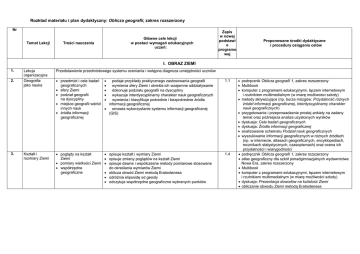 Rozkład materiału i plan dydaktyczny: Oblicza geografii, zakres rozszerzony Nr Temat Lekcji Główne cele lekcji w postaci wymagań edukacyjnych uczeń: Treści nauczania Zapis w nowej podstawi e programo wej Proponowane środki dydaktyczne i procedury osiągania celów I. OBRAZ ZIEMI 1. 2. 3. Lekcja organizacyjna Geografia jako nauka Przedstawienie przedmiotowego systemu oceniania i wstępna diagnoza umiejętności uczniów • przedmiot i cele badań geograficznych • sfery Ziemi • podział geografii na dyscypliny • miejsce geografii wśród innych nauk • źródła informacji geograficznej • • • • • podaje przykłady praktycznego zastosowania geografii wymienia sfery Ziemi i określa ich wzajemne oddziaływanie dokonuje podziału geografii na dyscypliny wykazuje interdyscyplinarny charakter nauk geograficznych wymienia i klasyfikuje pośrednie i bezpośrednie źródła informacji geograficznej • omawia wykorzystanie systemu informacji geograficznej (GIS) 1.1 Kształt i rozmiary Ziemi • poglądy na kształt Ziemi • pomiary wielkości Ziemi • współrzędne geograficzne • opisuje kształt i wymiary Ziemi • opisuje zmiany poglądów na kształt Ziemi • opisuje dawne i współczesne metody pomiarowe stosowane do określania wymiarów Ziemi • oblicza obwód Ziemi metodą Eratostenesa • odróżnia elipsoidę od geoidy • odczytuje współrzędne geograficzne wybranych punktów 1.4 • podręcznik Oblicza geografii 1, zakres rozszerzony • Multibook • komputer z programami edukacyjnymi, łączem internetowym i rzutnikiem multimedialnym (w miarę możliwości szkoły) • metody aktywizujące (np. burza mózgów: Przydatność różnych źródeł informacji geograficznej, Interdyscyplinarny charakter nauk geograficznych) • przygotowanie i przeprowadzenie prostej ankiety na zadany temat oraz późniejsza analiza uzyskanych wyników • dyskusja: Cele badań geograficznych • dyskusja: Źródła informacji geograficznej • analizowanie schematu Podział nauk geograficznych • wyszukiwanie informacji geograficznych w różnych źródłach (np. w internecie, atlasach geograficznych, encyklopediach, rocznikach statystycznych, czasopismach) oraz ocena ich przydatności i wiarygodności • podręcznik Oblicza geografii 1, zakres rozszerzony • atlas geograficzny dla szkół ponadgimnazjalnych wydawnictwa Nowa Era, zakres rozszerzony • Multibook • komputer z programami edukacyjnymi, łączem internetowym i rzutnikiem multimedialnym (w miarę możliwości szkoły) • dyskusja: Prezentacja dowodów na kulistość Ziemi • obliczanie obwodu Ziemi metodą Eratostenesa 4. Mapa jako obraz • mapa i plan Ziemi • skala mapy • podział map • generalizacja kartograficzna • • • • podaje różnice między mapą a planem klasyfikuje mapy ze względu na różne kryteria porównuje i szereguje różne rodzaje skal oblicza powierzchnię oraz odległość w terenie na podstawie map wykonanych w różnych skalach • wyjaśnia zasady generalizacji mapy 1.1 1.2 • podręcznik Oblicza geografii 1, zakres rozszerzony • atlas geograficzny dla szkół ponadgimnazjalnych wydawnictwa Nowa Era, zakres rozszerzony • Multibook • komputer z programami edukacyjnymi, łączem internetowym i rzutnikiem multimedialnym (w miarę możliwości szkoły) • dyskusja: Różnice między planem a mapą • dyskusja: Podział map ze względu na treść, skalę i przeznaczenie • ćwiczenia w kreśleniu planów najbliższej okolicy z wykorzystaniem sprzętu pomiarowego, tzw. mapowanie (w miarę możliwości szkoły) • prezentacja i analiza zastosowań map podczas zajęć w pracowni komputerowej (mapy zamieszczone w wybranych portalach internetowych, np.: http://maps.nationalgeographic.com, http://maps.grida.no/, http://www.codgik.gov.pl, http://maps.google.com/) 5. Odwzorowania kartograficzne • siatka geograficzna a siatka kartograficzna • podział odwzorowań kartograficznych • zniekształcenia na siatkach kartograficznych • wyjaśnia różnice między siatką geograficzną a siatką kartograficzną • porównuje różne rodzaje siatek kartograficznych • wymienia różne typy rzutów kartograficznych • wyjaśnia, dlaczego na siatkach kartograficznych występują zniekształcenia • omawia na konkretnych przykładach zastosowanie poszczególnych typów siatek kartograficznych 1.1 • analizowanie stopnia generalizacji map wykonanych w różnej skali • podręcznik Oblicza geografii 1, zakres rozszerzony • atlas geograficzny dla szkół ponadgimnazjalnych wydawnictwa Nowa Era, zakres rozszerzony • Multibook • komputer z programami edukacyjnymi, łączem internetowym i rzutnikiem multimedialnym (w miarę możliwości szkoły) • analiza porównawcza siatki kartograficznej i geograficznej • dyskusja: Zniekształcenia kartograficzne i ich znaczenie • analizowanie rodzajów odwzorowań kartograficznych umieszczonych w atlasie geograficznym • analizowanie zniekształceń kartograficznych na przykładach map wykonanych w różnych odwzorowaniach 6. Przedstawianie zjawisk na mapach • metody przedstawiania rzeźby terenu na mapach • ilościowe i jakościowe metody prezentacji zjawisk na mapach • interpolacja polowa • GIS – cyfrowa metoda prezentacji zjawisk • opisuje różne metody przedstawiania rzeźby terenu na mapach • charakteryzuje i podaje przykłady jakościowych metod prezentacji zjawisk na mapach • stosuje wybrane metody kartograficzne do prezentacji ilościowych i jakościowych cech środowiska geograficznego • wyjaśnia różnicę między kartogramem a kartodiagramem • wyjaśnia, na czym polega metoda interpolacji polowej • dobiera właściwą metodę do zaprezentowania danego zjawiska na mapie • podaje przykłady praktycznego zastosowania GIS 1.7 7. Inne sposoby prezentacji danych o przestrzeni geograficznej • formy przekazu informacji geograficznej • tabele statystyczne • wykresy i diagramy • diagramy