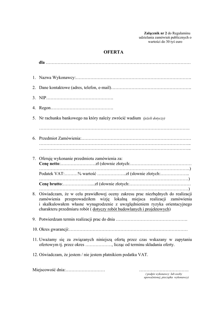 Załącznik nr 2 do Regulaminu udzielania zamówień publicznych o wartości do 30 tyś euro OFERTA dla ……………………………………………………………………………………… 1. Nazwa Wykonawcy:……………………………………………………………………. 2. Dane kontaktowe (adres, telefon, e-mail)………………………………………………. 3. NIP………………………………………. 4. Regon……………………………………. 5. Nr rachunku bankowego na który należy zwrócić wadium (jeżeli dotyczy) …………………………………………………………………………………………. 6. Przedmiot Zamówienia:………………………………………………………………… ………………………………………………………………………………………….. ………………………………………………………………………………………….. 7. Oferuję wykonanie przedmiotu zamówienia za: Cenę netto:……………………zł (słownie złotych:…………………………………… ………………………………………………………………………………………….) Podatek VAT:………% wartość ………………..zł (słownie złotych:……………….. …………………………………………………………………………………………) Cenę brutto:……………….....zł (słownie złotych:…………………………………… …………………………………………………………………………………………) 8. Oświadczam, że w celu prawidłowej oceny zakresu prac niezbędnych do realizacji zamówienia przeprowadziłem wizję lokalną miejsca realizacji zamówienia i skalkulowałem własne wynagrodzenie z uwzględnieniem ryzyka orientacyjnego charakteru przedmiaru robót ( dotyczy robót budowlanych i projektowych) 9. Potwierdzam termin realizacji prac do dnia …………………………………………. 10. Okres gwarancji:……………………………………………………………………… 11. Uważamy się za związanych niniejszą ofertą przez czas wskazany w zapytaniu ofertowym tj. przez okres ………………, licząc od terminu składania oferty. 12. Oświadczam, że jestem / nie jestem płatnikiem podatku VAT. Miejscowość dnia:……………………… ……………………………. ( podpis wykonawcy lub osoby upoważnionej, pieczątka wykonawcy)