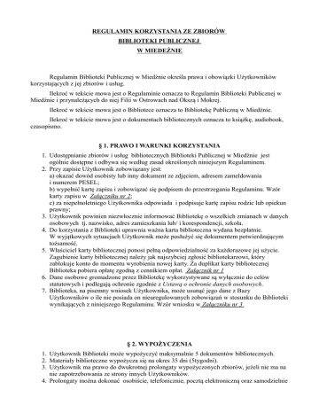 REGULAMIN KORZYSTANIA ZE ZBIORÓW BIBLIOTEKI PUBLICZNEJ W MIEDEŹNIE Regulamin Biblioteki Publicznej w Miedźnie określa prawa i obowiązki Użytkowników korzystających z jej zbiorów i usług. Ilekroć w tekście mowa jest o Regulaminie oznacza to Regulamin Biblioteki Publicznej w Miedźnie i przynależących do niej Filii w Ostrowach nad Okszą i Mokrej. Ilekroć w tekście mowa jest o Bibliotece oznacza to Bibliotekę Publiczną w Miedźnie. Ilekroć w tekście mowa jest o dokumentach bibliotecznych oznacza to książkę, audiobook, czasopismo. § 1. PRAWO I WARUNKI KORZYSTANIA 1. Udostępnianie zbiorów i usług bibliotecznych Biblioteki Publicznej w Miedźnie jest ogólnie dostępne i odbywa się według zasad określonych niniejszym Regulaminem. 2. Przy zapisie Użytkownik zobowiązany jest: a) okazać dowód osobisty lub inny dokument ze zdjęciem, adresem zameldowania i numerem PESEL; b) wypełnić kartę zapisu i zobowiązać się podpisem do przestrzegania Regulaminu. Wzór karty zapisu w Załączniku nr 2; c) za niepełnoletniego Użytkownika odpowiada i podpisuje kartę zapisu rodzic lub opiekun prawny; 3. Użytkownik powinien niezwłocznie informować Bibliotekę o wszelkich zmianach w danych osobowych tj. nazwisko, adres zamieszkania lub/ i korespondencji, szkoła. 4. Do korzystania z Biblioteki uprawnia ważna karta biblioteczna wydana bezpłatnie. W wyjątkowych sytuacjach Użytkownik może posłużyć się dokumentem potwierdzającym tożsamość. 5. Właściciel karty bibliotecznej ponosi pełną odpowiedzialność za każdorazowe jej użycie. Zagubienie karty bibliotecznej należy jak najszybciej zgłosić bibliotekarzowi, który zablokuje konto do momentu wyrobienia nowej karty. Za duplikat karty bibliotecznej Biblioteka pobiera opłatę zgodną z cennikiem opłat. Załącznik nr 1 6. Dane osobowe gromadzone przez Bibliotekę wykorzystywane są wyłącznie do celów statutowych i podlegają ochronie zgodnie z Ustawą o ochronie danych osobowych. 7. Biblioteka, na pisemny wniosek Użytkownika, może usunąć jego dane z Bazy Użytkowników o ile nie posiada on nieuregulowanych zobowiązań w stosunku do Biblioteki wynikających z niniejszego Regulaminu. Wzór wniosku w Załączniku nr 3 § 2. WYPOŻYCZENIA 1. Użytkownik Biblioteki może wypożyczyć maksymalnie 5 dokumentów bibliotecznych. 2. Materiały biblioteczne wypożycza się na okres 35 dni (5tygodni). 3. Użytkownik ma prawo do dwukrotnej prolongaty wypożyczonych zbiorów, jeżeli nie ma na nie zapotrzebowania ze strony innych Użytkowników. 4. Prolongaty można dokonać osobiście, telefonicznie, pocztą elektroniczną oraz samodzielnie po zalogowaniu się do katalogu OPAC. 5. Prolongaty należy dokonać najpóźniej w dniu terminu zwrotu wypożyczonych zbiorów. 6. Biblioteka nie ma obowiązku informowania Użytkownika o mijającym terminie zwrotu wypożyczonych materiałów. Powiadomienia i upomnienia generowane automatycznie przez system biblioteczny mają wyłącznie charakter pomocniczy i informacyjny, a ich brak nie stanowi podstawy do obniżenia nałożonej opłaty za przetrzymanie zbiorów. 7. Bibliotekarz może skrócić okres wypożyczenia lub żądać zwrotu każdego wypożyczonego materiału przed terminem określonym Regulaminem, jeśli jest to materiał szczególnie poszukiwany. 8. Za nieterminowy zwrot materiałów bibliotecznych Biblioteka pobiera opłaty zgodne z cennikiem opłat. Załącznik nr 1. 9. Użytkownik, który nie zwrócił materiałów bibliotecznych lub nie uregulował opłaty za ich przetrzymanie, nie ma prawa do wypożyczeń w żadnej filii BP, aż do momentu uregulowania zobowiązań wobec Biblioteki. 10.Jeżeli z przyczyn leżących po stronie Biblioteki niemożliwy jest zwrot lub prolongata materiałów bibliotecznych, Biblioteka nie pobiera opłat za przetrzymanie za czas uniemożliwiający zwrot. 11.Biblioteka umożliwia zamówienia i rezerwację zbiorów, które można zgłosić osobiście, telefonicznie, pocztą elektroniczną lub poprzez logowanie w katalogu OPAC. 12. Liczba zamówień i rezerwacji na koncie Użytkownika nie może przekroczyć 4 dokumentów. 13.Zarezerwowaną książkę należy odebrać do 5 dni od dnia przekazania przez Bibliotekę informacji o możliwości odbioru, w przeciwnym razie zostanie ona udostępniona innym Użytkownikom. 14.System wysyła powiadomienie z informacją o zrealizowanym zamówieniu, likwidacji zamówienia, czy rezerwacji jeśli książka nie została odebrana w terminie tylko do Użytkowników, którzy podali prawidłowy adres e-mailowy. 15.W przypadku nieterminowego zwrotu wypożyczonych dokumentów lub nieuiszczenia naliczonych opłat system blokuje możliwość zamówień i rezerwacji. § 4. OPŁATY 1. Instytucja pobiera opłaty za: a) nieterminowy zwrot wypożyczonych dokumentów; b) wyrobienie duplikatu karty bibliotecznej; c) uszkodzenie lub oderwanie kodu kreskowego znajdującego się na dokumencie; d) usługi kserograficzne; e) wydruki komputerowe. 2. Wysokość pobieranych opłat określa cennik opłat stanowiący Załącznik nr 1 do niniejszego Regulaminu. 3. Każda wpłata dokonana przez Użytkownika jest potwierdzana pokwitowaniem. 4. W szczególnie trudnych sytuacjach życiowych przysługuje Użytkownikowi prawo odwołania się do Zarządzającego Biblioteką z prośbą o zwolnienie z opłaty lub częściowe umorzenie długu za nieterminowy zwrot książek. 5. Jeżeli Użytkownik odmawia zwrotu materiałów bibliotecznych lub uiszczenia należnych opłat Biblioteka dochodzi swych roszczeń zgodnie z przepisami prawa. § 5. POSZANOWANIE ZBIORÓW 1. Użytkownik zobowiązany jest do poszanowania zbiorów będących własnością Biblioteki. Wszelkie uszkodzenia należy zgłaszać bibliotekarzowi przed wypożyczeniem. 2. Za szkody wynikłe z zagubienia, uszkodzenia lub zniszczenia odpowiada Użytkownik. W przypadku osób nieletnich odpowiedzialność ponoszą rodzice lub opiekunowie prawni. 3. W przypadku zagubieni