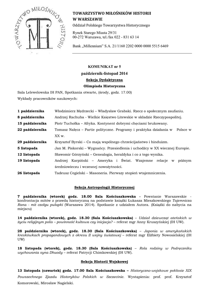 TOWARZYSTWO MIŁOŚNIKÓW HISTORII W WARSZAWIE Oddział Polskiego Towarzystwa Historycznego Rynek Starego Miasta 29/31 00-272 Warszawa, tel./fax 022 - 831 63 14 Bank „Millennium” S.A. 21/1160 2202 0000 0000 5515 6469 KOMUNIKAT nr 5 październik-listopad 2014 Sekcja Dydaktyczna Olimpiada Historyczna Sala Lelewelowska IH PAN, Spotkania otwarte, (środy, godz. 17.00) Wykłady pracowników naukowych: 1 października Włodzimierz Mędrzecki – Władysław Grabski. Rzecz o społecznym zaufaniu. 8 października Andrzej Rachuba - Wielkie Księstwo Litewskie w składzie Rzeczypospolitej. 15 października Piotr Tuchołka – Afryka. Kontynent dobrymi chęciami brukowany. 22 października Tomasz Nałęcz – Partie polityczne. Programy i praktyka działania w Polsce w XX w. 29 października Krzysztof Byrski – Co mają wspólnego chrześcijaństwo i hinduizm. 5 listopada Jan M. Piskorski – Wygnańcy. Przesiedlenia i uchodźcy w XX wiecznej Europie. 12 listopada Sławomir Górzyński – Genealogia, heraldyka i co z tego wynika. 19 listopada Andrzej Karpiński – Ameryka i Świat. Wzajemne relacje w późnym średniowieczu i wczesnej nowożytności. 26 listopada Tadeusz Cegielski – Masoneria. Pierwszy stopień wtajemniczenia. Sekcja Antropologii Historycznej 7 października (wtorek) godz. 18.00 Sala Kościuszkowska - Powstanie Warszawskie konfrontacja mitów z prawdą historyczną na podstawie książki Łukasza Mieszkowskiego Tajemnicza Rana - mit czołgu pułapki (Warszawa 2014). Spotkanie z udziałem Autora. (Książki do nabycia na miejscu) 14 października (wtorek), godz. 18.30 (Sala Kościuszkowska) – Udział dziewcząt ateńskich w życiu religijnym polis – powinność kultowa czy inicjacja? – referat mgr Anny Kruszyńskiej (IH UW). 28 października (wtorek), godz. 18.30 (Sala Kościuszkowska) – Japonia w amerykańskich kreskówkach propagandowych z okresu II wojny światowej – referat mgr Elżbiety Nowosielskiej (IH UW) 18 listopada (wtorek), godz. 18.30 (Sala Kościuszkowska) – Rola rodziny w Podręczniku wychowania syna Dhuody – referat Patrycji Chimkowskiej (IH UW). Sekcja Historii Wojskowej 13 listopada (czwartek) godz. 17.00 Sala Kościuszkowska – Historyczno-wojskowe pokłosie XIX Powszechnego Zjazdu Historyków Polskich w Szczecinie. Komorowski, Mirosław Nagielski. Wystąpienia: prof. prof. Krzysztof Sekcja Historii Warszawy 3 października (piątek) godz. 17.00 Sala Kościuszkowska – dyskusja panelowa o udziale historyków Warszawy w narodzinach III RP: rola profesorów Aleksandra Gieysztora, Bronisława Geremka, Henryka Samsonowicza, Tadeusza Łepkowskiego, Anny Sucheni-Grabowskiej, dr Anny Radziwiłł i innych. Spotkanie organizowane wspólnie z Komisją Biografistyki i Studiów Krytycznych. 27 października (poniedziałek) godz. 17.00 Sala Lelewelowska - Spotkanie poświęcone płk. inż. arch. Eugeniuszowi Ajewskiemu „Kotwie” (1915-2006), inicjatorowi Kopca Powstania Warszawskiego i miejsc pamięci walk na Mokotowie, o których przypomniał w swojej książce Reduta Magnet. W spotkaniu wezmą udział żona i córka z najbliższą rodziną „Kotwy”. Będą również do nabycia egzemplarze książki. 20 listopada (czwartek) godz. 17. Sala Kościuszkowska – dyskusja nad książką: Płacz po Warszawie. Powstanie Warszawskie 1944. Dzienniki. Świadectwa. oprac. Wiktoria Śliwowska, Janusz Marszalec, Artur Wodzyński. Komisja Biografistyki i Studiów Krytycznych. 22 października (środa) godz. 17.00 Dział Varsavianów BP (ul. Koszykowa 26/28) – Dyskusja nad książką M.M. Drozdowskiego Konfraternia warszawskich historyków pod znakiem Klio, Warszawa 2013 z udziałem prof. Andrzeja Wierzbickiego. 30 października (czwartek) godz. 17.00 Muzeum Niepodległości (Al. Solidarności 62) – Dyskusja z udziałem prof. Andrzeja Wierzbickiego nt. Rola historyków w dziejach najnowszych Polski. Zagajenie prof. M.M. Drozdowski. 5 listopada (środa) godz. 16.30 Sala Kościuszkowska – Dyskusja panelowa nt. Rola kościoła i życia religijnego w Powstaniu Warszawskim i exodusie po powstaniowym. Mrągowskie Studia Humanistyczne 21 listopada (wtorek) godz. 17.00 Sala Kościuszkowska - prezentacja odnowionego czasopisma naukowego: "Mrągowskie Studia Humanistyczne" oraz dyskusja Pogranicza w historii i literaturze dawnych Prus i Inflant. Udział wezmą red. nacz. dr hab. prof. UMW Jan Gancewski i z-ca red. nacz. dr Lech Kościelak Zarząd TMH 24 października (piątek) godz. 17.00 Sala Konferencyjna Biblioteki Publicznej m-sta Warszawy, ul. Koszykowa 26/28, Sala Konferencyjna – Varsaviana im. Hanny Szwankowskiej, uroczyste wręczenie dyplomów honorowych autorom wyróżnionych książek varsavianistycznych za lata 20132014. Uprzejmie prosimy wszystkich członków o przysyłanie swoich adresów poczty elektronicznej na adres [email protected] Sekretarz organizacyjny /-/ Dr Maria Wiśniewska Prezes TMH /-/ Prof. dr hab. Andrzej Rachuba