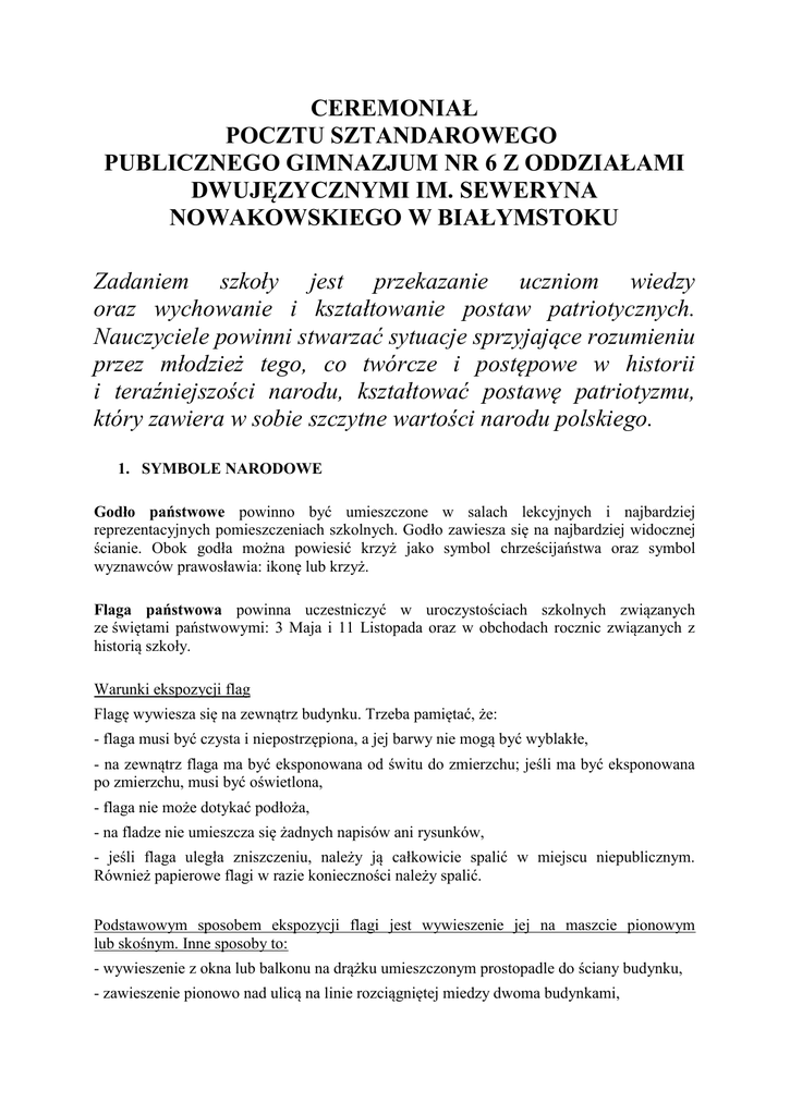 CEREMONIAŁ POCZTU SZTANDAROWEGO PUBLICZNEGO GIMNAZJUM NR 6 Z ODDZIAŁAMI DWUJĘZYCZNYMI IM. SEWERYNA NOWAKOWSKIEGO W BIAŁYMSTOKU Zadaniem szkoły jest przekazanie uczniom wiedzy oraz wychowanie i kształtowanie postaw patriotycznych. Nauczyciele powinni stwarzać sytuacje sprzyjające rozumieniu przez młodzież tego, co twórcze i postępowe w historii i teraźniejszości narodu, kształtować postawę patriotyzmu, który zawiera w sobie szczytne wartości narodu polskiego. 1. SYMBOLE NARODOWE Godło państwowe powinno być umieszczone w salach lekcyjnych i najbardziej reprezentacyjnych pomieszczeniach szkolnych. Godło zawiesza się na najbardziej widocznej ścianie. Obok godła można powiesić krzyż jako symbol chrześcijaństwa oraz symbol wyznawców prawosławia: ikonę lub krzyż. Flaga państwowa powinna uczestniczyć w uroczystościach szkolnych związanych ze świętami państwowymi: 3 Maja i 11 Listopada oraz w obchodach rocznic związanych z historią szkoły. Warunki ekspozycji flag Flagę wywiesza się na zewnątrz budynku. Trzeba pamiętać, że: - flaga musi być czysta i niepostrzępiona, a jej barwy nie mogą być wyblakłe, - na zewnątrz flaga ma być eksponowana od świtu do zmierzchu; jeśli ma być eksponowana po zmierzchu, musi być oświetlona, - flaga nie może dotykać podłoża, - na fladze nie umieszcza się żadnych napisów ani rysunków, - jeśli flaga uległa zniszczeniu, należy ją całkowicie spalić w miejscu niepublicznym. Również papierowe flagi w razie konieczności należy spalić. Podstawowym sposobem ekspozycji flagi jest wywieszenie jej na maszcie pionowym lub skośnym. Inne sposoby to: - wywieszenie z okna lub balkonu na drążku umieszczonym prostopadle do ściany budynku, - zawieszenie pionowo nad ulicą na linie rozciągniętej miedzy dwoma budynkami, - zatknięcie flagi na drążku w ukośnym uchwycie przymocowanym do ściany budynku, latarni, - zamocowanie flagi na drążku do prawego błotnika pojazdu, - niesienie na drzewcu w pochodzie, - umieszczenie na drzewcu/maszcie w przeznaczonej do tego podstawie w sali lub gabinecie oraz na podium po prawej stronie mówcy. W dniach żałoby narodowej flagi na masztach pionowych spuszcza się do połowy masztu. Rano podnosi się flagę na szczyt masztu, a następnie powoli spuszcza do połowy. Wieczorem na chwilę podnosi się flagę na szczyt masztu, a następnie spuszcza w dół i składa. Flagi na drzewcach/masztach ukośnych opatruje się kirem. Flaga zawieszona pionowo ma zawsze pas biały z lewej strony. Flagą nie oddaje się honorów. Hymn państwowy powinien być grany lub śpiewany w szkole w chwilach uroczystych, takich jak: inauguracja i zakończenie roku szkolnego, święta państwowe, apele okolicznościowe z okazji rocznic państwowych i szkolnych. 2. UROCZYSTOŚCI SZKOLNE Uroczystości szkolne, podczas których eksponowane są symbole narodowe, powinny mieć szczególnie uroczysty charakter: powinny wskazywać na przywiązanie do tradycji i kultury narodu i regionu oraz dumę z bohaterskiej przeszłości Polski. Uroczystości szkolne powinny budzić piękne i szlachetne uczucia, uczyć szacunku dla bohaterskich i postępowych tradycji narodu polskiego, szacunku do symboli narodowych. Doceniając znaczenie uroczystości szkolnych w procesie wychowawczym, należy zwracać uwagę na konieczność należytego przygotowania i przebieg tych uroczystości. 3. SZTANDAR SZKOŁY Publiczne Gimnazjum nr 6 z Oddziałami Dwujęzycznymi im. S. Nowakowskiego posiada własny sztandar od 2009 roku. Sztandar to symbol tradycji szkoły, to najwyższe dobro szkoły, dlatego otoczony jest najwyższym szacunkiem i należnymi mu honorami. Ceremoniał Pocztu Sztandarowego kształtuje wśród uczniów postawy patriotyczne i uczy ich poszanowania symboli narodowych i tradycji Państwa Polskiego. Sztandar Szkolny dla społeczności szkolnej jest symbolem Polski - Narodu - Ziemi, symbolem Małej Ojczyzny, jaką jest szkoła i jej najbliższe środowisko. Uroczystości z udziałem sztandaru wymagają powagi zachowania, a przechowywanie, transport i przygotowanie sztandaru do prezencji, właściwych postaw jego poszanowania. Sztandar wykonany jest z tkaniny otoczonej złotymi frędzlami, przytwierdzonej do drzewca. Drzewiec wykonany jest z drewna w jasnym kolorze i głowicy w kształcie godła państwowego. Rewers sztandaru zdobi podobizna patrona szkoły - Seweryna Nowakowskiego - oraz napis: Publiczne Gimnazjum nr 6 z Oddziałami Dwujęzycznymi im. Seweryna Nowakowskiego w Białymstoku. Awers sztandaru stanowi emblemat orła w koronie na biało-czerwonym tle otoczony napisem: Bóg, Honor, Nauka, Ojczyzna. Sztandar jest przechowywany na terenie szkoły w zamkniętej gablocie. 4. POCZET SZTANDAROWY Uczestnictwo w poczcie sztandarowym to najbardziej honorowa funkcja uczniowska w szkole, dlatego w jego składzie powinni znajdować się uczniowie o nienagannej postawie, godni takiego zaszczytu, którzy należycie reprezentują szkołę. Podejmując się uczestnictwa w poczcie sztandarowym, uczniowie powinni być w pełni świadomi związanych z tym zadań, a swoją funkcję powinni traktować jako służbę oraz wyraz szacunku dla tradycji i symboli narodowych. 1. Kadencja pocztu trwa jeden rok - począwszy od ślubowania w dniu uroczystego zakończenia roku szkolnego. 2. Kandydatury do składu pocztu sztandarowego są przedstawione przez wychowawców klas oraz Samorząd Uczniowski do opiekuna pocztu sztandarowego. 3. Skład Pocztu Sztandarowego zatwierdza Rada Pedagogiczna na posiedzeniu do 30 czerwca. 4. Sztandar uczestniczy w najważniejszych uroczystościach szkolnych oraz poza szkołą na zaproszenie innych szkół i instytucji. 5. W przypadku gdy poczet sztandarowy uczestniczy w uroczystościach pogrzebowych lub ogłoszono żałobę narodową, sztandar powinien być ozdobiony czarnym kirem. Wstążkę kiru przywiesza się w miejscu jego zamocowania na drzewcu od lewej górnej strony do prawej. 6. Po uko
