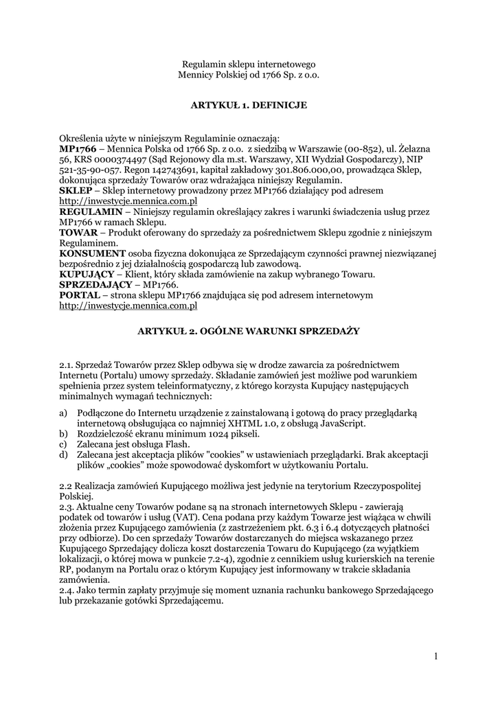 Regulamin sklepu internetowego Mennicy Polskiej od 1766 Sp. z o.o. ARTYKUŁ 1. DEFINICJE Określenia użyte w niniejszym Regulaminie oznaczają: MP1766 – Mennica Polska od 1766 Sp. z o.o. z siedzibą w Warszawie (00-852), ul. Żelazna 56, KRS 0000374497 (Sąd Rejonowy dla m.st. Warszawy, XII Wydział Gospodarczy), NIP 521-35-90-057. Regon 142743691, kapitał zakładowy 301.806.000,00, prowadząca Sklep, dokonująca sprzedaży Towarów oraz wdrażająca niniejszy Regulamin. SKLEP – Sklep internetowy prowadzony przez MP1766 działający pod adresem http://inwestycje.mennica.com.pl REGULAMIN – Niniejszy regulamin określający zakres i warunki świadczenia usług przez MP1766 w ramach Sklepu. TOWAR – Produkt oferowany do sprzedaży za pośrednictwem Sklepu zgodnie z niniejszym Regulaminem. KONSUMENT osoba fizyczna dokonująca ze Sprzedającym czynności prawnej niezwiązanej bezpośrednio z jej działalnością gospodarczą lub zawodową. KUPUJĄCY – Klient, który składa zamówienie na zakup wybranego Towaru. SPRZEDAJĄCY – MP1766. PORTAL – strona sklepu MP1766 znajdująca się pod adresem internetowym http://inwestycje.mennica.com.pl ARTYKUŁ 2. OGÓLNE WARUNKI SPRZEDAŻY 2.1. Sprzedaż Towarów przez Sklep odbywa się w drodze zawarcia za pośrednictwem Internetu (Portalu) umowy sprzedaży. Składanie zamówień jest możliwe pod warunkiem spełnienia przez system teleinformatyczny, z którego korzysta Kupujący następujących minimalnych wymagań technicznych: a) Podłączone do Internetu urządzenie z zainstalowaną i gotową do pracy przeglądarką internetową obsługująca co najmniej XHTML 1.0, z obsługą JavaScript. b) Rozdzielczość ekranu minimum 1024 pikseli. c) Zalecana jest obsługa Flash. d) Zalecana jest akceptacja plików "cookies" w ustawieniach przeglądarki. Brak akceptacji plików „cookies” może spowodować dyskomfort w użytkowaniu Portalu. 2.2 Realizacja zamówień Kupującego możliwa jest jedynie na terytorium Rzeczypospolitej Polskiej. 2.3. Aktualne ceny Towarów podane są na stronach internetowych Sklepu - zawierają podatek od towarów i usług (VAT). Cena podana przy każdym Towarze jest wiążąca w chwili złożenia przez Kupującego zamówienia (z zastrzeżeniem pkt. 6.3 i 6.4 dotyczących płatności przy odbiorze). Do cen sprzedaży Towarów dostarczanych do miejsca wskazanego przez Kupującego Sprzedający dolicza koszt dostarczenia Towaru do Kupującego (za wyjątkiem lokalizacji, o której mowa w punkcie 7.2-4), zgodnie z cennikiem usług kurierskich na terenie RP, podanym na Portalu oraz o którym Kupujący jest informowany w trakcie składania zamówienia. 2.4. Jako termin zapłaty przyjmuje się moment uznania rachunku bankowego Sprzedającego lub przekazanie gotówki Sprzedającemu. 1 ARTYKUŁ 3. REJESTRACJA W BAZIE KLIENTÓW 3.1. Rejestracja Kupującego w bazie danych Sklepu następuje poprzez wypełnienie formularza rejestracyjnego zamieszczonego na Portalu. 3.2. Kupujący w momencie rejestracji zaznacza (klika), czy wyraża zgodę na umieszczenie i przetwarzanie jego danych osobowych przez Sprzedającego, na warunkach określonych w Polityce ochrony prywatności. Wszelkie dane osobowe umieszczone przez Kupującego będą przetwarzane zgodnie z obowiązującymi przepisami prawa. Sprzedający w pełni respektuje zakaz dostarczania Kupującemu treści o charakterze bezprawnym. ARTYKUŁ 4. POLITYKA OCHRONY PRYWATNOŚCI 4.1. Administratorem danych osobowych Klientów jest MP1766. 4.2. MP1766 zapewnia bezpieczeństwo danych osobowych Kupujących. 4.3. Dane osobowe Kupujących przetwarzane są w celach związanych z realizacją zamówień na Towary oraz procesem ich sprzedaży, oraz w celach archiwizacyjnych, na zasadach określonych w ustawie z dnia 29 sierpnia 1997 roku o ochronie danych osobowych (Dz. U. 2002 r., Nr 101, poz. 926, ze zm.), dalej ustawa. 4.4. Podanie danych jest dobrowolne, jednak niezbędne w celu złożenia zamówienia i zakupu Towaru. 4.5. Dane osobowe Kupujących są przetwarzane również w celu marketingu bezpośredniego własnych produktów i usług Administratora danych osobowych na podstawie art. 23 ust. 1 pkt. 5 w zw. z art. 23 ust. 4 pkt. 1 ustawy. Kupującemu przysługuje prawo wniesienia sprzeciwu w szczególności wobec przetwarzania jego danych w celach marketingowych oraz w innych przypadkach określonych w ustawie. 4.6. Kupujący ma prawo wglądu do treści swoich danych osobowych oraz ich poprawiania. 4.7. Zbiór danych osobowych został zarejestrowany w biurze Generalnego Inspektora Ochrony Danych Osobowych. 4.8. Dane osobowe Kupujących są przechowywane w bazie danych, w której zastosowano środki techniczne i organizacyjne zapewniające ochronę przetwarzanych danych zgodne z wymaganiami określonymi w przepisach o ochronie danych osobowych, w tym rozporządzenia Ministra Spraw Wewnętrznych i Administracji z dnia 29 kwietnia 2004 r. w sprawie dokumentacji przetwarzania danych osobowych oraz warunków technicznych i organizacyjnych, jakim powinny odpowiadać urządzenia i systemy informatyczne służące do przetwarzania danych osobowych (Dz. U. Nr 100, poz. 1024) oraz wytycznymi Generalnego Inspektora Ochrony Danych Osobowych. Dostęp do bazy mają jedynie osoby, posiadające upoważnienia nadane przez Administratora. 4.9. Pliki „cookies” są wykorzystywane na zasadach określonych polityce plików cookies. 4.10. Wynikające z ogólnych zasad połączeń realizowanych w Internecie informacje zawarte w logach systemowych (np. adres IP) są przez Administratora wykorzystywane w celach technicznych, związanych z administracją naszymi serwerami. Poza tym adresy IP są wykorzystywane do zbierania ogólnych, statystycznych informacji demograficznych (np. o regionie, z którego następuje połączenie). 4.11. MP1766 jako administrator danych osobowych powierzył przetwarzanie danych osobowych następujących podmiotom: Bold Brand Commerce Sp. z o.o., ul. Pszczelna 48/3, 30-431Kraków. 4.1