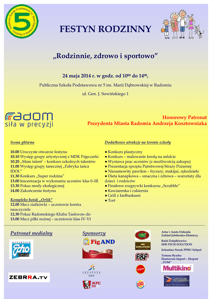 FESTYN RODZINNY „Rodzinnie, zdrowo i sportowo” 24 maja 2014 r. w godz. od 1000 do 1400, Publiczna Szkoła Podstawowa nr 5 im. Marii Dąbrowskiej w Radomiu ul. Gen. J. Sowińskiego 1 Honorowy Patronat Prezydenta Miasta Radomia Andrzeja Kosztowniaka Scena główna Dodatkowe atrakcje na terenie szkoły 10.00 Uroczyste otwarcie festynu 10.10 Występ grupy artystycznej z MDK Pajęczarki 10.20 „Mam talent’ – konkurs szkolnych talentów 11.00 Występ grupy tanecznej „Fabryka tańca IDOL” 11.30 Konkurs „Super rodzina” 13.00 Inscenizacja w wykonaniu uczniów klas 0–III 13.30 Pokaz mody ekologicznej 14.00 Zakończenie festynu ● Konkurs plastyczny ● Konkurs – malowanie kredą na asfalcie ● Wystawa prac uczniów (z możliwością zakupu) ● Prezentacja sprzętu Państwowej Straży Pożarnej ● Niesamowity pawilon – fryzury, makijaż, rękodzieło ● Dieta kanapkowa – smaczna i zdrowa – warsztaty dla dzieci i rodziców ● Finałowe rozgrywki konkursu „Scrabble” ● Kawiarenka i cukiernia ● Grill z kiełbaskami ● Tort Kompleks boisk „Orlik” 12.00 Mecz siatkówki – uczniowie kontra nauczyciele 12.30 Pokaz Radomskiego Klubu Taekwon–do 13.00 Mecz piłki nożnej – uczniowie klas IV-VI Patronat medialny Sponsorzy Artur i Aneta Dohojda Zakład Jubilersko-Złotniczy Rafał Żołądkiewicz SEB-TECH SOLUTION Sebastian Norek PPHU Sebpol Tomasz Byzdra Hurtownia Import – Eksport „TOM”