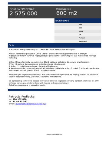 Międzyzdroje DOM na SPRZEDAŻ 600 m2 2 575 000 BONP3969 600 600 2000 13 Perfect Detached Opis ELEGANCKI PENSJONAT- MIĘDZYZDROJE PRZY PROMENADZIE- OKAZJA!!! Piękny, kameralny pensjonat „Willa Drako” przy nadmorskiej promenadzie w znanym międzynarodowym kurorcie Międzyzdroje o powierzchni całkowitej ok. 600 m2 w skład którego wchodzą: 1.Dwa (2) apartamenty o powierzchni 50m2 każdy, z pokojami dziennymi oraz tarasami; 2.Trzy (3) pokoje dwuosobowe z łazienkami oraz z balkonami; 3. Jeden (1) pokój trzyosobowy z łazienką i balkonem; 4. Apartament dla przyszłych właścicieli składający składający się z 7 pokoi, 3 łazienek, garderoby, bieliźniarki, kuchni, garażu 30m2 i podpiwniczenia; Pensjonat jest w pełni wyposażony, a w apartamentach i pokojach są między innymi TV, lodówka, czajnik bezprzewodowy, parawan, kuchenka mikrofalowa. Do ogrodzonej całkowicie posesji przynależy stylowo zagospodarowany ogródek wielkości ok. 300 m2 oraz parking na siedem stanowisk i garaż jednostanowiskowy. Całość do sprzedania w okazyjnej cenie. Patrycja Podlecka tel. 500 102 860 tel. 91 44 35 360 email: [email protected] Bonus Nieruchomości Powered by TCPDF (www.tcpdf.org)
