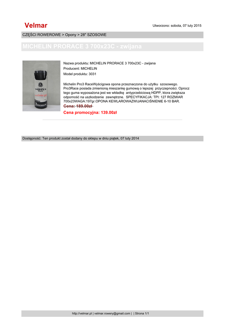 Velmar Utworzono: sobota, 07 luty 2015 CZĘŚCI ROWEROWE > Opony > 28" SZOSOWE MICHELIN PRORACE 3 700x23C - zwijana Nazwa produktu: MICHELIN PRORACE 3 700x23C - zwijana Producent: MICHELIN Model produktu: 3031 Michelin Pro3 RaceWyścigowa opona przeznaczona do użytku szosowego. Pro3Race posiada zmienioną mieszankę gumową o lepszej przyczepności. Oprocz tego guma wyposażona jest we wkładkę antyprzebiciową HDPP, ktora zwiększa odporność na uszkodzenie zewnętrzne. SPECYFIKACJA: TPI: 127 ROZMIAR 700x23WAGA:197gr.OPONA KEWLAROWAZWIJANACIŚNIENIE 6-10 BAR. Cena: 189.00zł Cena promocyjna: 139.00zł Dostępność: Ten produkt został dodany do sklepu w dniu piątek, 07 luty 2014 http://velmar.pl | [email protected] | | Strona 1/1