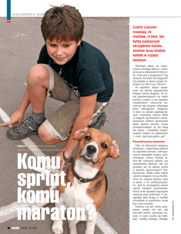 AKADEMIA BIEGANIA Ludzie czasami mawiają, że możliwe, iż ktoś, kto byłby najlepszym skrzypkiem świata, właśnie teraz kładzie kafelki w czyjejś łazience. Mnóstwo zależy od rozpoznania młodego talentu i rozwijania go w odpowiednim kierunku. A jak jest z bieganiem? Czy dziecko ma talent do biegania? Czy będzie w stanie zostać mistrzem na 100 m czy 100 km? W ostatnich latach obserwuje się wzrost popularności biegów różnej długości. W coraz popularniejszych na całym świecie, a także i u nas, biegach maratońskich rokrocznie obserwuje się progres dotyczący ilości startujących biegaczy. Z kolei na skutek spektakularnych sukcesów Usaina Bolta w biegach sprinterskich zainteresowanie krótkimi dystansami także istotnie wzrosło. Coraz powszechniejsze są też biegi dla dzieci i młodzieży organizowane zwykle na dystansach 1–4 km. Jest tylko jedno „ale”… TEKST KRZYSZTOF MIZERA, www.krzysztofmizera.blog.onet.pl Komu sprint, komu maraton? 48 BIEGANIE STYCZEŃ – LUTY 2010 Fakt, że aktywnych biegaczy przybywa, z pewnością wpłynie na poprawę zdrowia i samopoczucia dziesiątek tysięcy ludzi, zmniejszy rozwój chorób takich jak: cukrzyca, otyłość, czy nadciśnienie tętnicze. Ale czy przełoży się na lepsze wyniki w sporcie wyczynowym? Niekoniecznie. Wiele osób bierze udział w biegach, bo są modne, choć nie zawsze dystans idzie w parze z ich predyspozycjami. Jest to szczególnie ważne wśród młodych sportowców, którzy w ten sposób zwyczajnie marnują swój potencjał. A podążając taką drogą, o medale olimpijskie w przyszłości może być coraz trudniej. Dziecko czy też młody sportowiec zwykle nie wie, jaki kierunek kariery sportowej wybrać, w czym czułby się najlepiej i robiłby postępy. Dlatego Fot.: www.istockphoto.com Poszukiwanie talentów Fot.: www.istockphoto.com Wyłonić sprintera Poszukiwanie talentu sportowego jest procesem złożonym. Pierwszym etapem powinno być określenie potencjału młodego biegacza, czyli tzw. selekcja, gdy mamy do czynienia z więcej, niż jednym kandydatem. Wbrew pozorom nie zawsze ustawienie wszystkich na linii startu i wyścig na 60 m jest dobrą metodą. Często dzieci mają problemy z poradzeniem sobie z presją startową, oczekiwaniami rodziców itp. Ich psychika nie jest jeszcze ukształtowana, a niepowodzenie może skutecznie zniechęcić do uprawiania danej dyscypliny. Na tym etapie testów należy dokonywać bardziej subtelnie. Aby zatem nie narazić młodego adepta na stres związany z bezpośrednią rywalizacją z innymi, można w tym celu przeprowadzić dwie–trzy próby skoku w dal z miejsca do piaskownicy. Już po pierwszej próbie wyklaruje się kolejność kto pierwszy, kto ostatni. Jeśli kolejne próby potwierdzą wynik pierwszej, to jest dla nas pierwszy sygnał, że osoba, która w każdej z trzech prób była w czołówce, dysponuje większą niż pozostali mocą kończyn dolnych. Zamiennym lub potwierdzającym testem może być wyskok dosiężny (w górę z wyciągniętą ponad głowę prostą ręką), który także określa moc kończyn dolnych (warto zastosować oba). W kolejnej próbie można wykonać skok w dal z biegu, wszak tu będziemy mogli przyjrzeć się szybkości i technice biegu na krótkim odcinku, ale także przekonać się, czy określona wcześniej moc nóg współgra z szybkością biegu. Jeśli tak, to osoba taka może być predysponowana do biegów sprinterskich. Z kolei osoba, która wypada przeciętnie w tych próbach raczej nie przejawia talentu do tego typu biegów. W kolejnym etapie można zastosować bieg wahadłowy 10 x 10, polegający na tym, że osobnik biega między dwoma oddalonymi od siebie o 10 m tyczkami (lub od linii do linii) dziesięć razy. Tym sposobem, oprócz dynamiki, jesteśmy w stanie gołym okiem określić ogólną sprawność i zwinność osobnika. Oczywiście osoby przejawiające zdolności i talent do biegów może być jedynie elementem pomocniczym w doborze dyscypliny dla danej osoby, nie zaś podstawowym kryterium. sprinterskich wykonają ten bieg szybciej niż pozostali. Dopiero na koniec powinno się przeprowadzić wyścig wszystkich młodych sportowców, np. na 30 i 60 m. Z reguły potwierdza on, że osoba cechująca się wyższą niż inni mocą nóg oraz szybsza i bardziej zwinna w biegu wahadłowym zajmuje pierwsze lub drugie miejsce w bezpośredniej konfrontacji. Taka osoba ponadto cechuje się też inną niż wytrzymałościowiec budową antropometryczną. Jest średniego wzrostu i posiada umięśnione kończyny dolne. Długodystansowcy charakteryzują się natomiast znacznie szczuplejszą budową ciała i długimi, smuklejszymi kończynami. Należy jednak pamiętać, że budowa anatomiczna, szczególnie w młodym wieku sportowca, Oczywiście można też zastosować test Coopera, ale jest on bardzo obciążający dla młodego sportowca. Osoba, która pokona dystans w jak najkrótszym czasie, a przy tym jak najmniej się zmęczy (będzie zdolna wykonywać inne wysiłki) może być typem wytrzymałościowca. Można zastosować też podskoki w górę, ale nie na wysokość, jak w przypadku wyskoku dosiężnego, ale na ilość. Sprinter będzie podskakiwał szybciej, dynamiczniej i wyżej, przez co zmęczy się szybciej, niż wytrzymałościowiec, który owych podskoków zapewne wykona więcej. Łatwo też sprawdzić to w warunkach domowych, np. gdy mieszkamy w bloku. Osoby wchodzą szybkim marszem na górę i schodzą w dół do zmęczenia i odmówienia wysiłku. Nie chodzi tu o szyb- Jak szukać długodystansowców Sprinterzy wyłonieni. Ale czy to oznacza, że pozostali są potencjalnymi maratończykami? Tym razem wszyscy powinni wziąć udział w testach wytrzymałościowych, by sprawdzić, jak ci szybcy wypadają w starciu z wolniejszymi oraz czy ci wolniejsi posiadają predyspozycje wytrzymałościowe. W tym celu można wykonać test polegający na przebiegnięciu 400 m pięć razy, ale tak, że po każdych 4