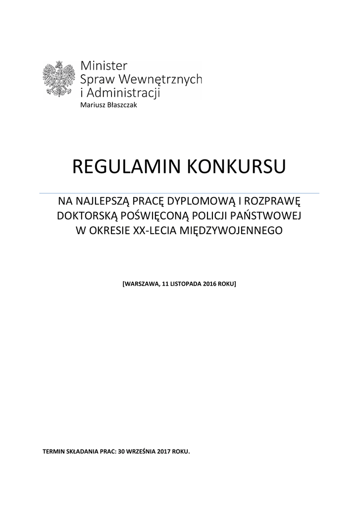 Mariusz Błaszczak REGULAMIN KONKURSU NA NAJLEPSZĄ PRACĘ DYPLOMOWĄ I ROZPRAWĘ DOKTORSKĄ POŚWIĘCONĄ POLICJI PAŃSTWOWEJ W OKRESIE XX-LECIA MIĘDZYWOJENNEGO [WARSZAWA, 11 LISTOPADA 2016 ROKU] TERMIN SKŁADANIA PRAC: 30 WRZEŚNIA 2017 ROKU. § 1 POSTANOWIENIA OGÓLNE 1. Niniejszy regulamin, zwany dalej „Regulaminem”, określa warunki i zasady Konkursu na najlepszą pracę dyplomową i rozprawę doktorską poświęconą Policji Państwowej w okresie XX-lecia międzywojennego, zwanego dalej „Konkursem”. 2. Organizatorem Konkursu jest Minister Spraw Wewnętrznych i Administracji, zwany dalej „Organizatorem” a obsługę Konkursu w imieniu Organizatora zapewnienia Departament Komunikacji Społecznej Ministerstwa Spraw Wewnętrznych i Administracji. 3. Celami Konkursu są: 1) popularyzacja wiedzy o Policji Państwowej; 2) zachęcenie studentów do głębszego zainteresowania się zjawiskiem rozwoju polskich służb mundurowych, ze szczególnym uwzględnieniem służb podległych Ministrowi Spraw Wewnętrznych i Administracji; 3) wyróżnienie najlepszych prac dotyczących tematyki Policji Państwowej w okresie XX-lecia międzywojennego. 4. Ogłoszenie o Konkursie jest opublikowane na stronie internetowej Ministerstwa Spraw Wewnętrznych i Administracji www.mswia.gov.pl. 5. Zgłoszenie do udziału Konkursie jest jednoznaczne z akceptacją postanowień Regulaminu i zobowiązaniem się do ich przestrzegania. § 2 WARUNKI UCZESTNICTWA 1. Konkurs jest otwarty dla wszystkich absolwentów studiów stacjonarnych i niestacjonarnych, z zastrzeżeniem ust. 2 i 5. 2. Uczestnikiem Konkursu, zwanym w dalszej części regulaminu „Uczestnikiem”, może być osoba która ukończyła studia wyższe I lub II stopnia, bądź też jednolite studia magisterskie, uzyskując tytuł licencjata lub magistra, a także osoba której nadano stopień doktora i przesłała zgłoszenie spełniające wymagania określone w Regulaminie w terminie przewidzianym w ww. Regulaminie. 3. Z udziału w Konkursie wyłączeni są pracownicy Ministerstwa Spraw Wewnętrznych i Administracji i członkowie Jury Konkursu oraz członkowie ich najbliższej rodziny. Członkiem najbliższej rodziny w rozumieniu Regulaminu jest małżonek, wstępny, zstępny, rodzeństwo, powinowaty w tej samej linii i stopniu, osoba pozostająca w stosunku przysposobienia oraz jej małżonek, a także osoba pozostająca we wspólnym pożyciu. 4. Udział w konkursie jest bezpłatny. 5. Do udziału w Konkursie mogą być zgłoszone prace dyplomowe, bądź rozprawy doktorskie, których obrona zakończona została uzyskaniem pozytywnej oceny z egzaminu i nastąpiła pomiędzy dniem 1 stycznia 2015 roku, a dniem 15 września 2017 roku. 6. Jeden uczestnik może zgłosić tylko jedną pracę. 7. Prace do Konkursu może zgłosić autor lub promotor pracy – pod warunkiem uzyskania pisemnej zgody na zgłoszenie pracy dyplomowej, bądź rozprawy doktorskiej, wyrażonej przez jej autora, z zastrzeżeniem, że dotyczy także akceptacji warunków niniejszego Regulaminu. 8. Uczelnia, na której praca dyplomowa została złożona i obroniona, bądź też na której nadano Uczestnikowi tytuł doktora, ma swoją siedzibę na terytorium RP. 9. Pracę należy składać: 1) osobiście w Biurze Podawczym Ministerstwa Spraw Wewnętrznych i Administracji znajdującym się przy ul. Rakowieckiej 2a w Warszawie w godzinach pracy Biura (od poniedziałku do piątku w godzinach 8:15 - 16:00), albo 2) za pośrednictwem Poczty Polskiej/innego operatora pocztowego/przedsiębiorcy realizującego usługi kurierskie na adres: Ministerstwo Spraw Wewnętrznych i Administracji Departament Komunikacji Społecznej, ul. Batorego 5, 02-591 Warszawa. Koperta zawierająca pracę powinna zostać oznaczona jako „Konkurs na pracę dyplomową i rozprawę doktorską o Policji Państwowej”. 10. Zgłoszenie pracy do Konkursu powinno zawierać: 1) formularz zgłoszeniowy, którego wzór stanowi załącznik do Regulaminu; 2) jeden egzemplarz oprawionej pracy dyplomowej/rozprawy doktorskiej; 3) jeden egzemplarz pracy dyplomowej/rozprawy doktorskiej w wersji elektronicznej, zapisanej na nośniku (CD/DVD, pendrive) w formacie *.doc, *.docx, *.odt lub *.pdf; 4) streszczenie pracy w formie wydruku podpisanego przez Uczestnika (maksymalnie 2500 znaków); 5) zaświadczenie władz uczelni potwierdzające termin obrony i uzyskaną ocenę z pracy dyplomowej, bądź rozprawy doktorskiej. 11. Uczestnicy, których prace dyplomowe lub rozprawy doktorskie zostały zgłoszone do Konkursu przed upływem okresu sześciu miesięcy od dnia ich obrony, dołączają do pracy/rozprawy również oświadczenie wydane przez uczelnię, na której pracę dyplomową lub rozprawę doktorską obroniono, o wyrażeniu zgody na publikację pracy przez autora lub inny podmiot przed upływem sześciu miesięcy od dnia obrony. 12. Uczestnik Konkursu upoważnia Organizatora do decydowania o sposobie opisania zgłoszonej pracy konkursowej podanymi przez niego danymi autora, a także do dokonania wyboru treści w związku z publikacją całości lub dowolnie wybranych części pracy konkursowej. 13. Organizator dokonuje oceny zgłoszonych prac dyplomowych/rozpraw doktorskich pod względem spełnienia warunków uczestnictwa określonych w Regulaminie. 14. Organizator nie odsyła prac dyplomowych oraz rozpraw doktorskich biorących udział w Konkursie. 15. Organizator nie ponosi odpowiedzialności za ewentualne uszkodzenia lub zniszczenia nieprawidłowo zabezpieczonych prac konkursowych lub ich zagubienie przez Pocztę Polską, innego operatora pocztowego lub przedsiębiorcę realizującego usługi kurierskie. 16. Niedozwolone jest – jako stanowiące naruszenie Regulaminu – przesyłanie (w ramach zgłoszenia) na Konkurs materiałów zawierających treści sprzeczne z prawem lub dobrymi obyczajami, a w szczególności treści pornograficznych, propagujących piractwo fonograficzne, komputerowe, treści upowszechniających techn